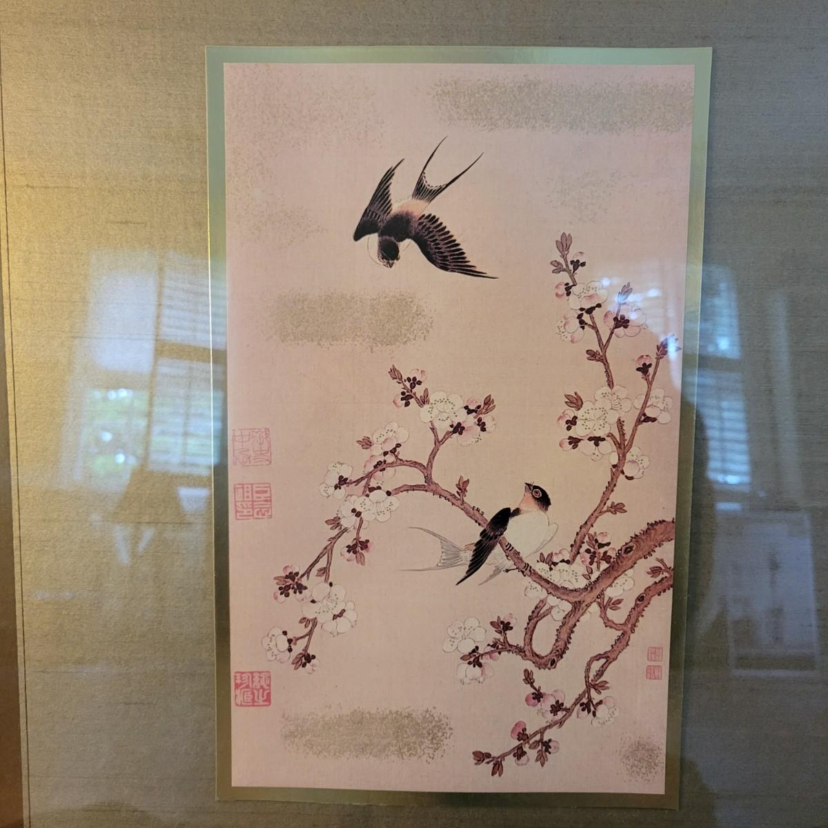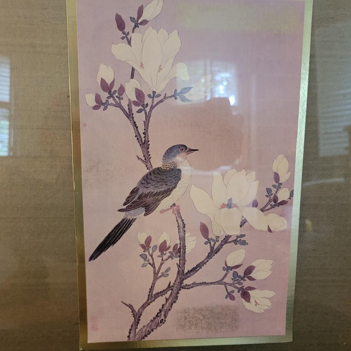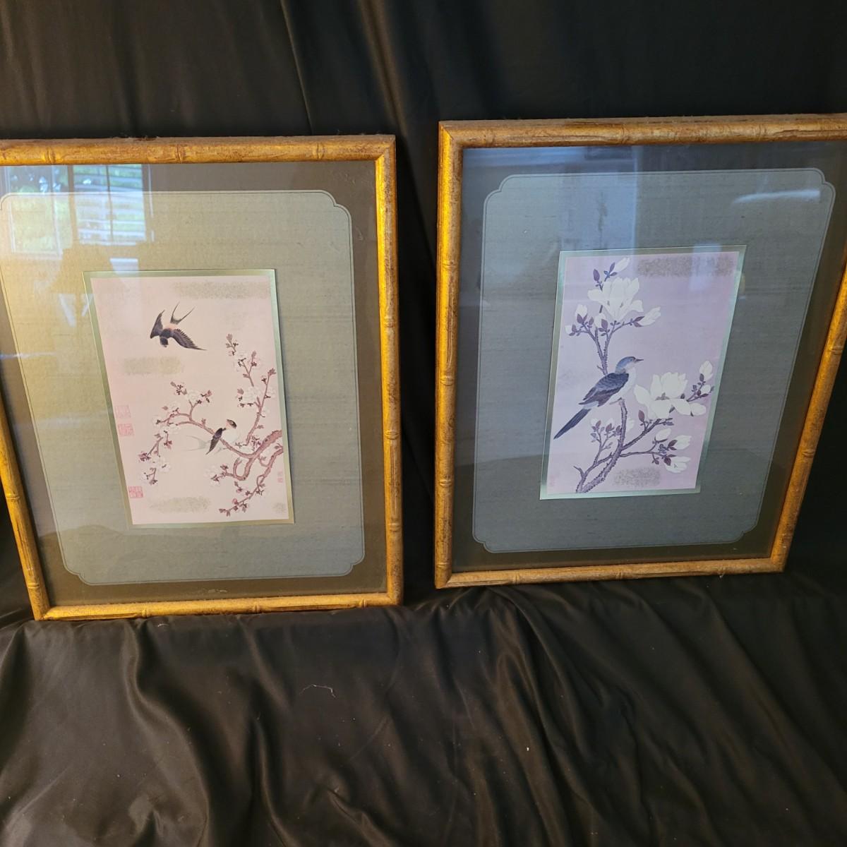 A pair of Asian art prints top mounted on a mat with a bird theme. Framed in a bamboo gold leaf frame with an outer dimension of 17" x 21". Shipping Available.