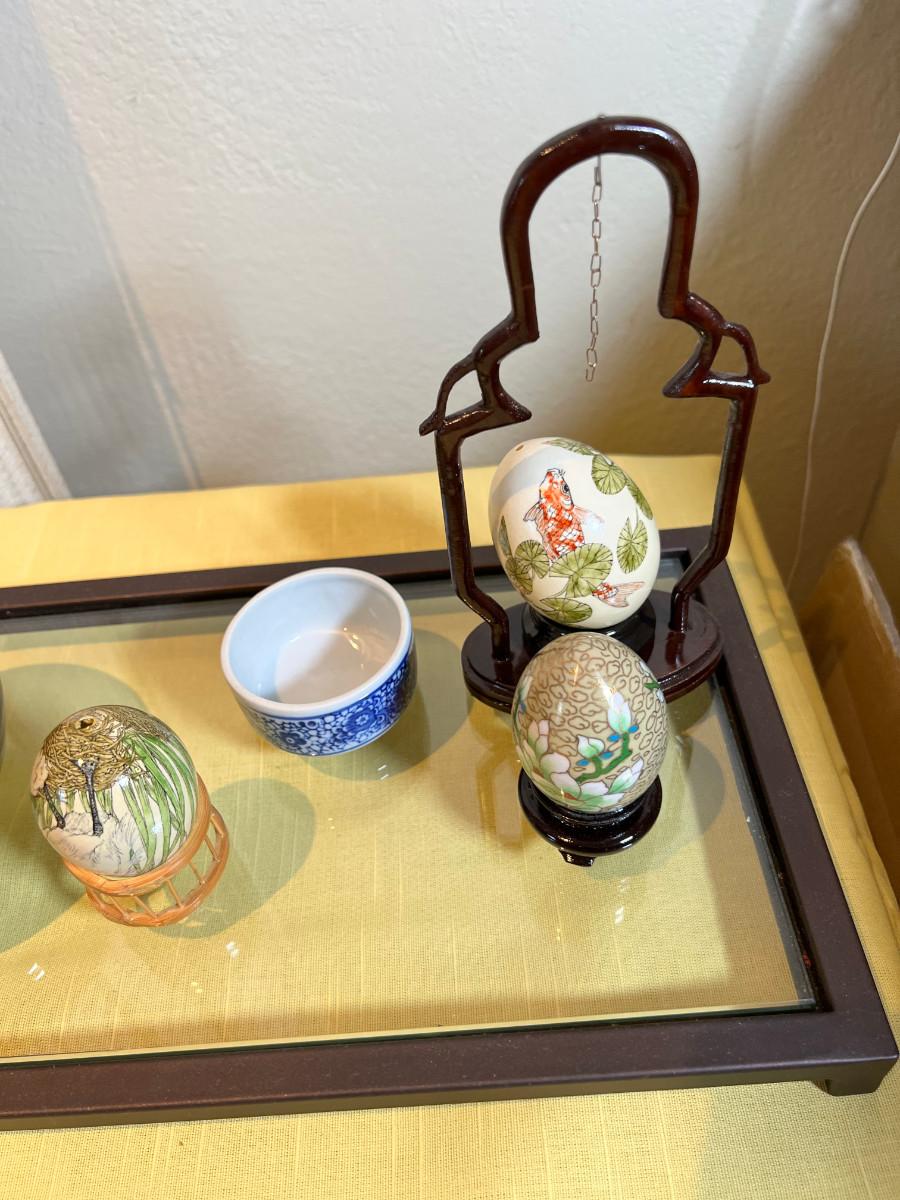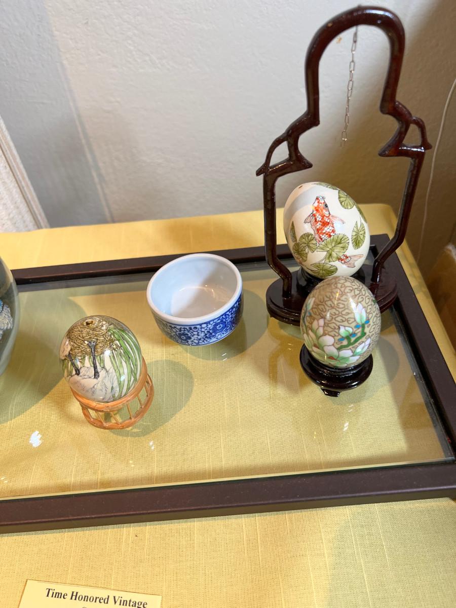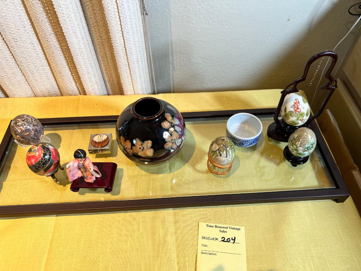 Asian hand painted blown eggs, very beautiful with koi fish and cranes. with hanging egg chain , Wax and Bing flower ceramic vase, stone eggs. small lidded box . Small Japanese figurine on stand, entire lot comes with a long glass framed stand. Please note the blue and white ceramic was a ginger jar lid and was returned to the right lot.