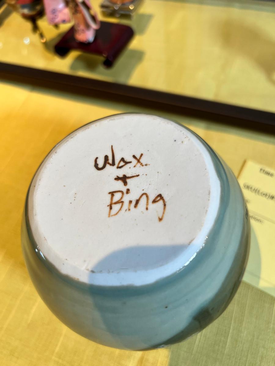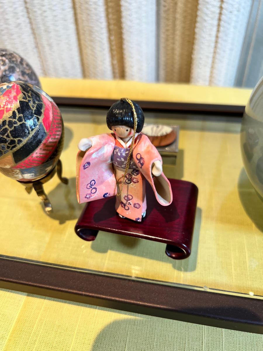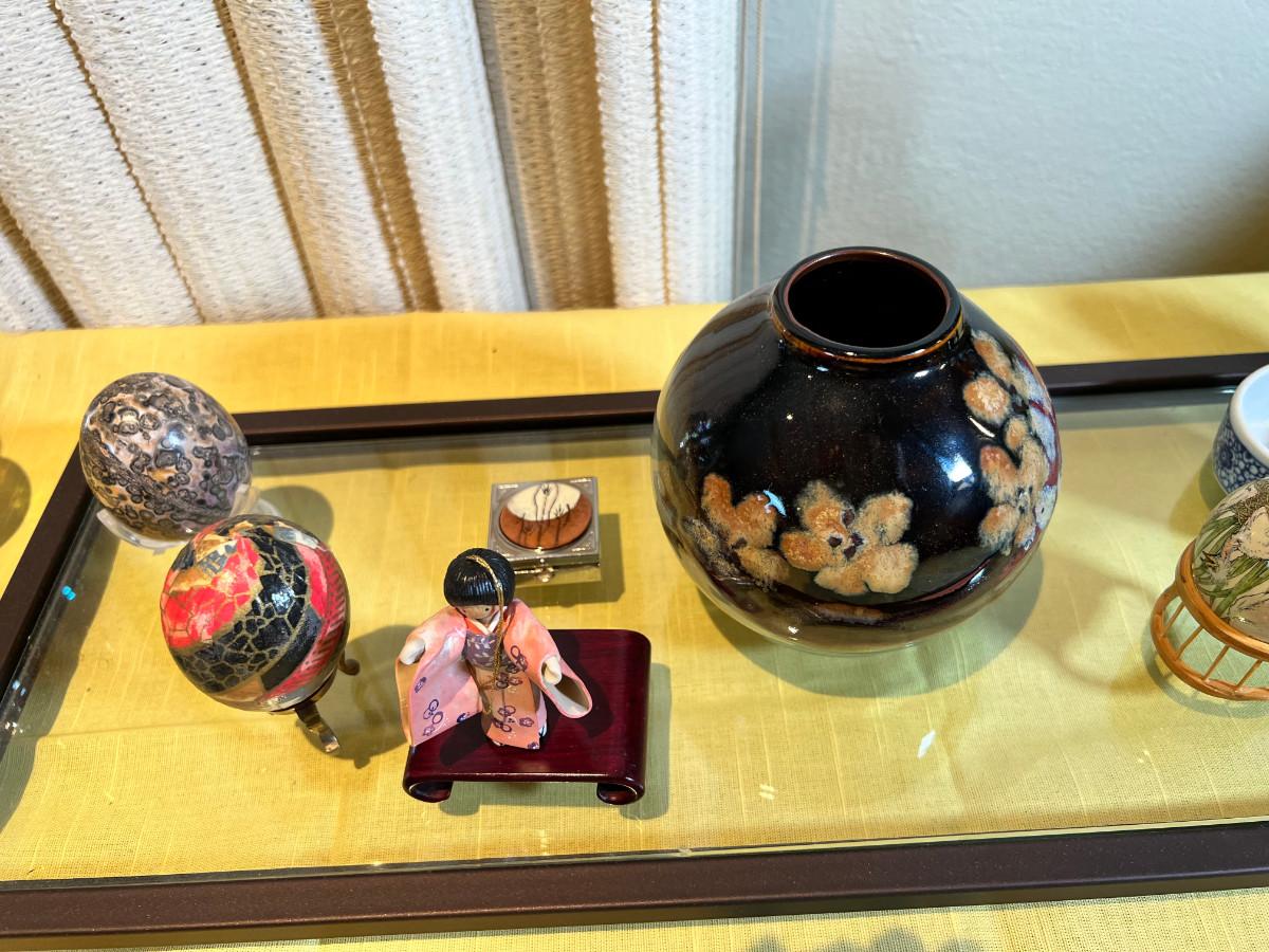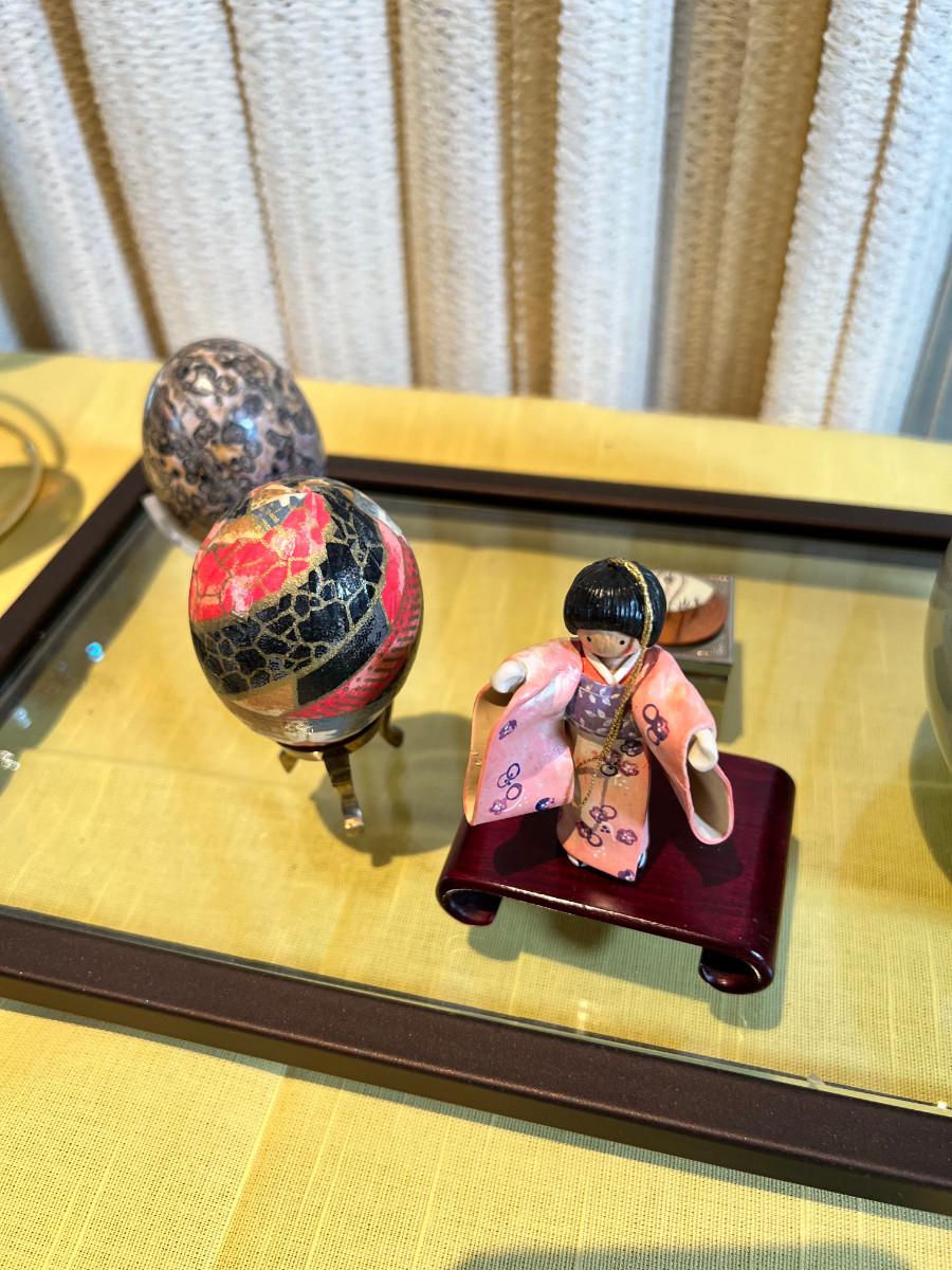 Asian hand painted blown eggs, very beautiful with koi fish and cranes. with hanging egg chain , Wax and Bing flower ceramic vase, stone eggs. small lidded box . Small Japanese figurine on stand, entire lot comes with a long glass framed stand. Please note the blue and white ceramic was a ginger jar lid and was returned to the right lot.