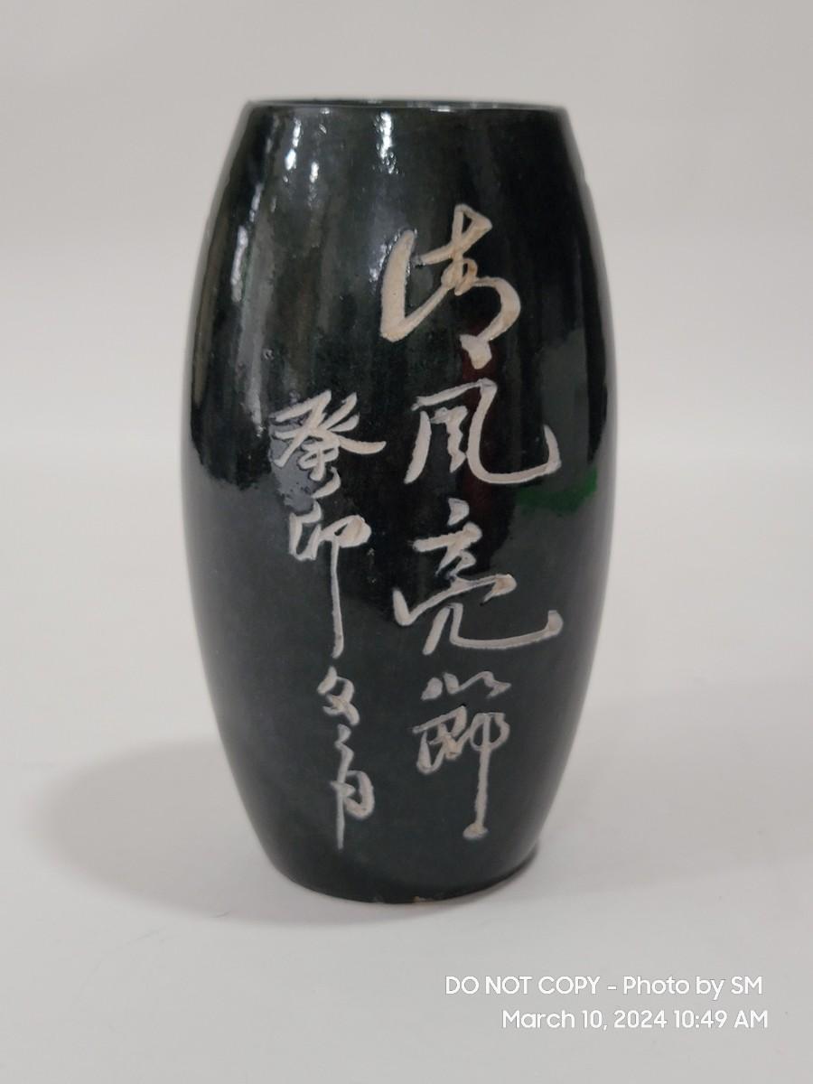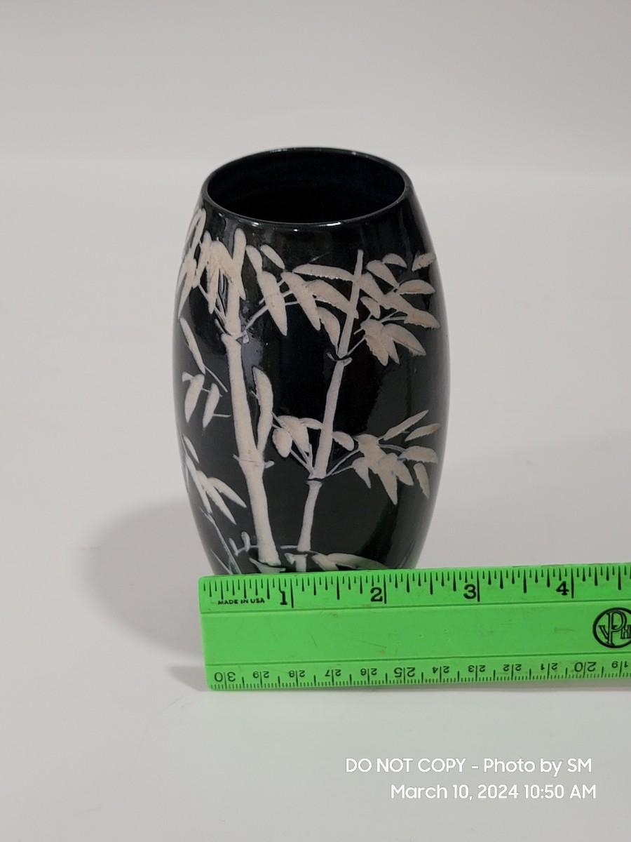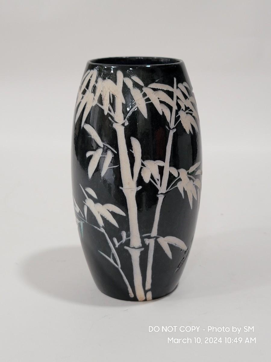 This little vase is heavy, feels like sotneware, perhaps vintage? Etched or carved is a bamboo design and long signature. Some of the white etched area has dirt or staining embedded. Overall, mysterious but lovely.