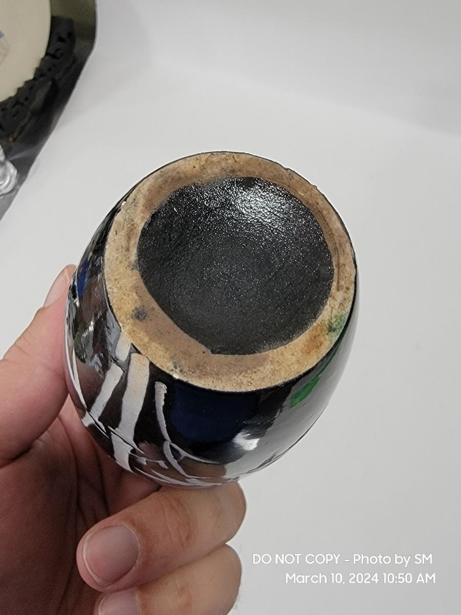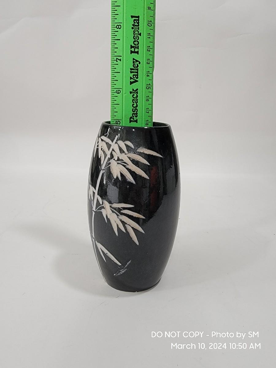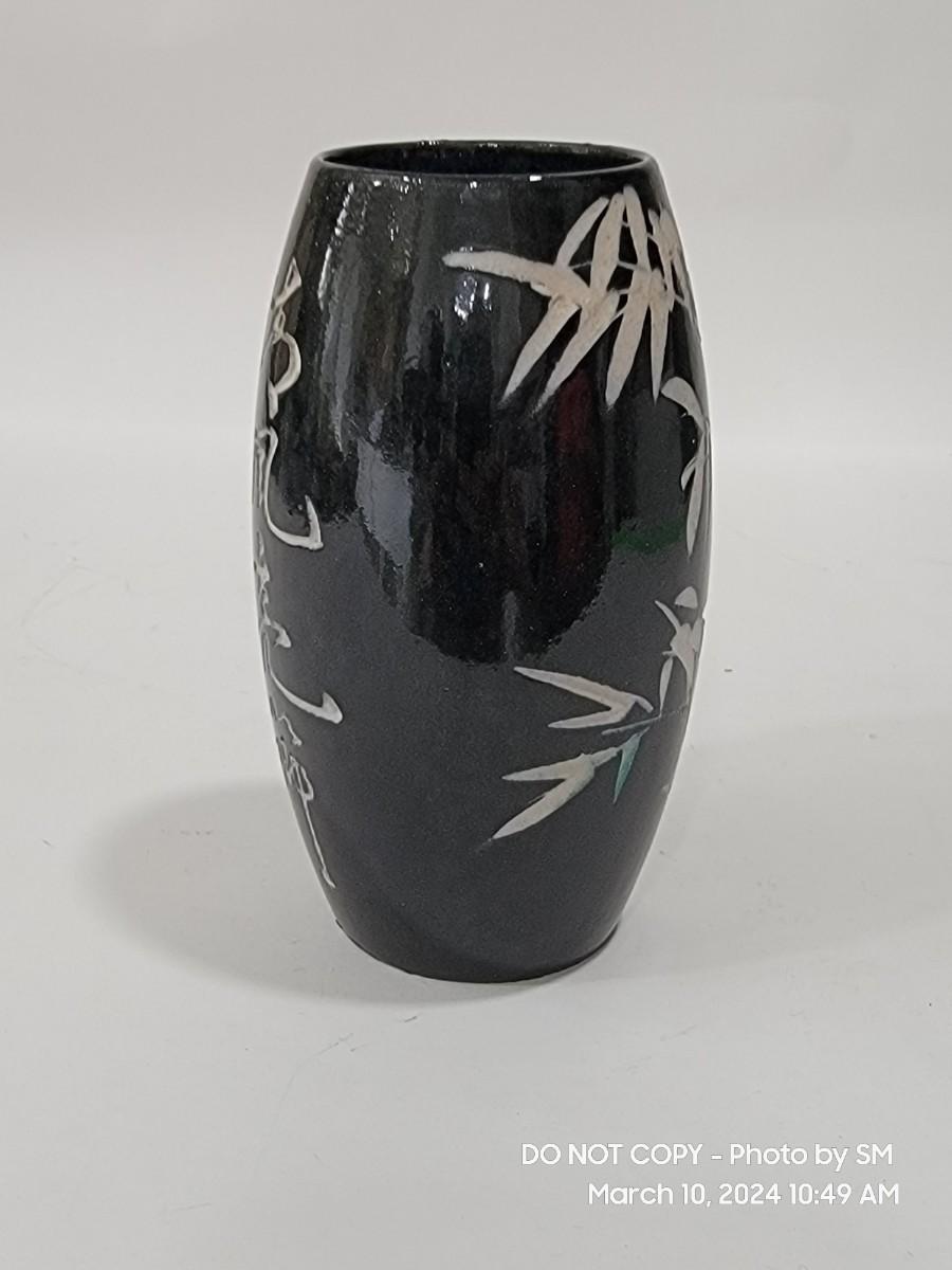 This little vase is heavy, feels like sotneware, perhaps vintage? Etched or carved is a bamboo design and long signature. Some of the white etched area has dirt or staining embedded. Overall, mysterious but lovely.