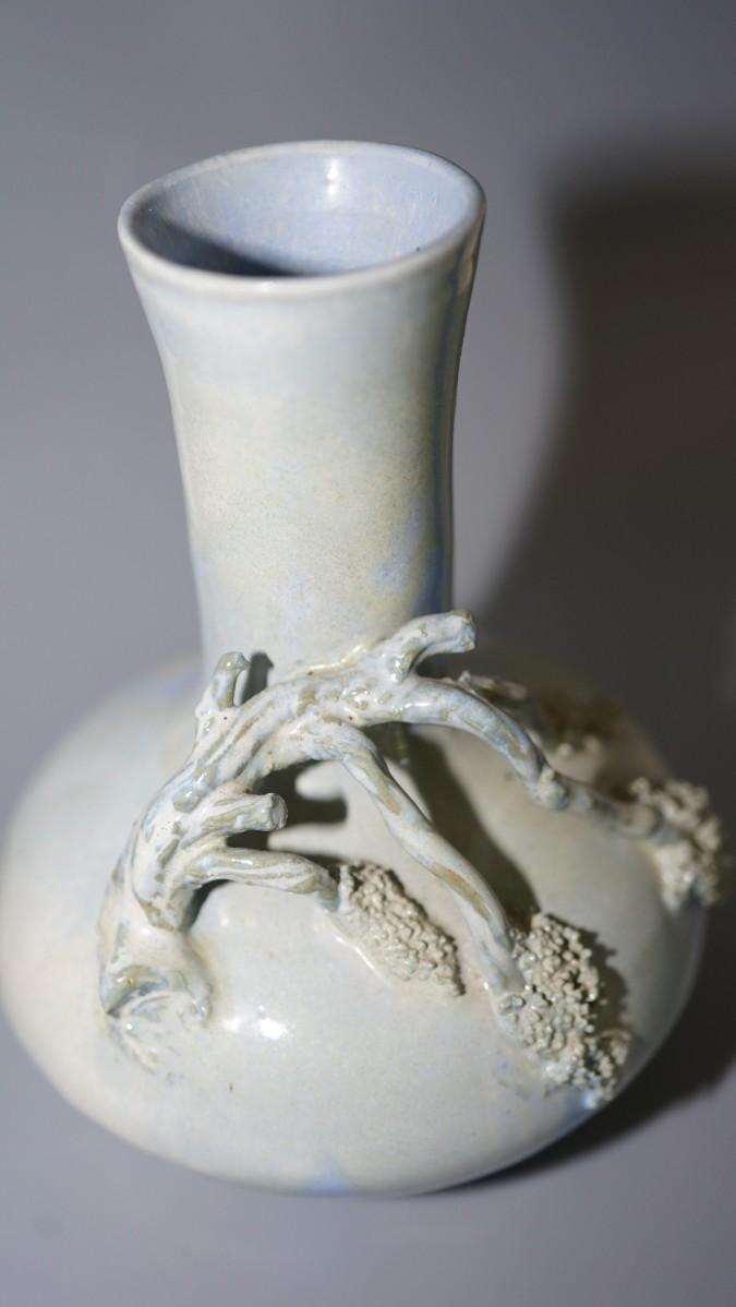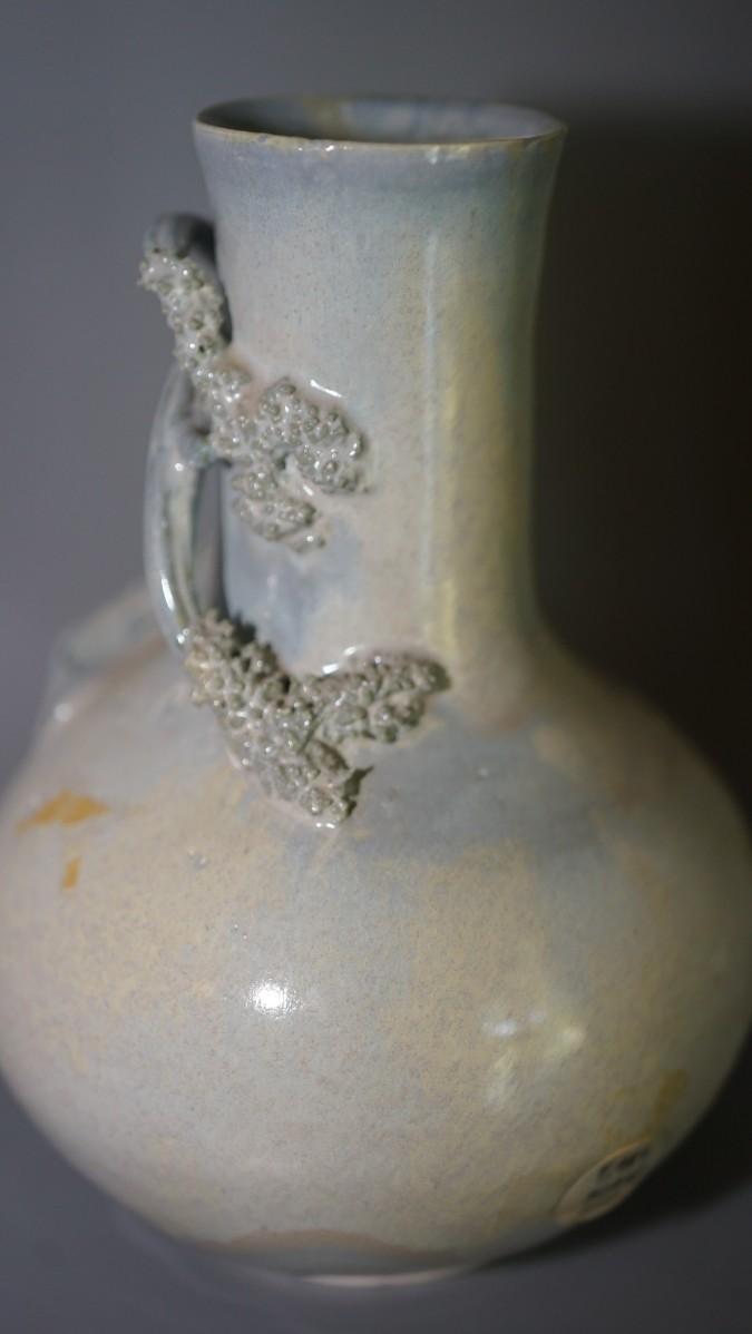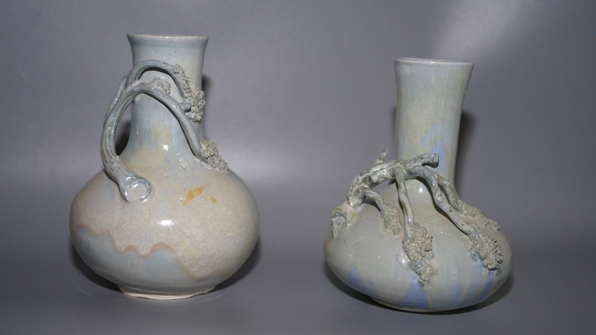 ASIAN INFLUENCE PAIR OF BOTTLE SHAPED VASES W/ APPLIED BLOSSOM BRANCHES SIGNED EDWARD FRIDAY OF MADISON, WI