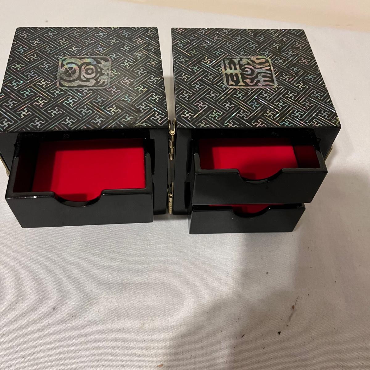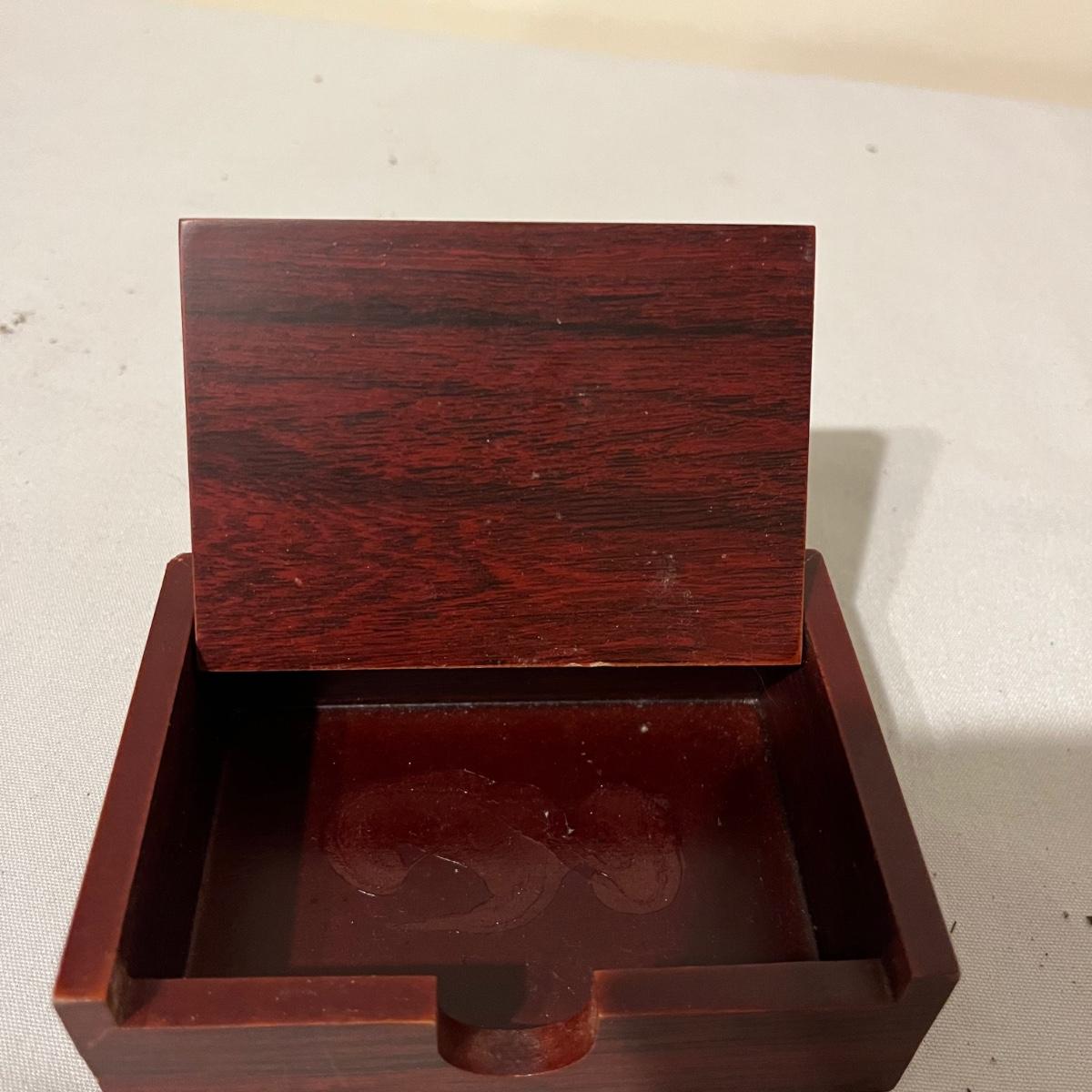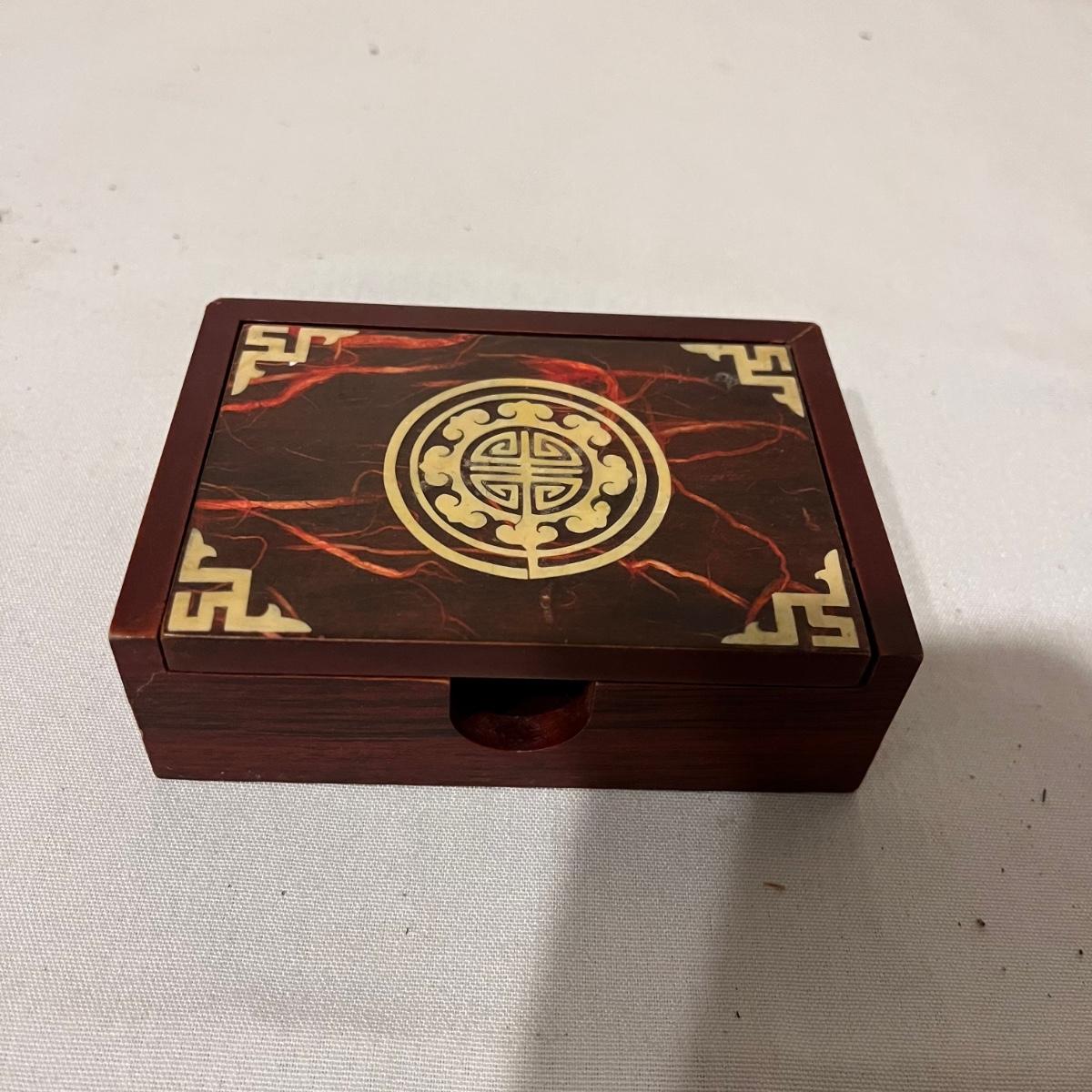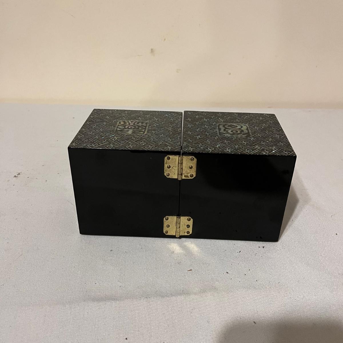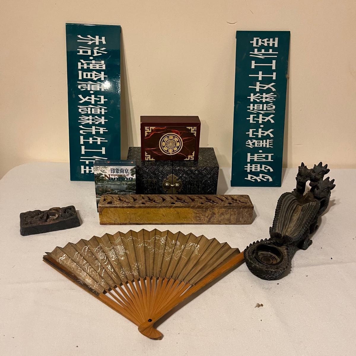 Lot includes stone box, wooden box, plastic double box with four drawers, resin dragon incense holder, paper and wood fan, playing cards and a resin dragon block. Double box measures 3.26” x 6.75” x 3.25”.