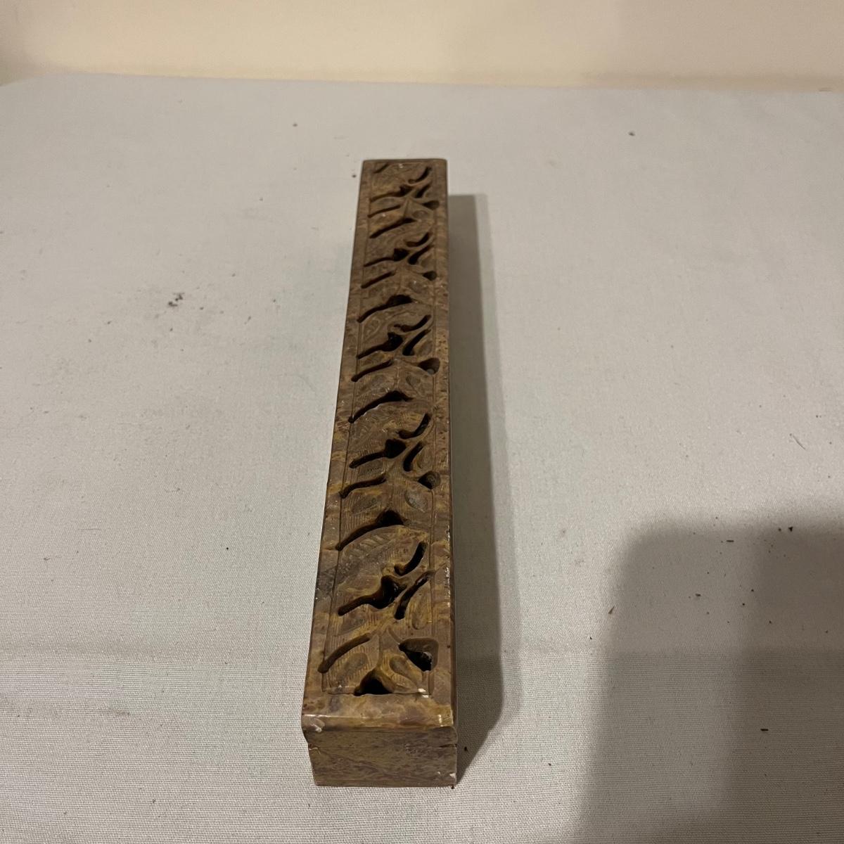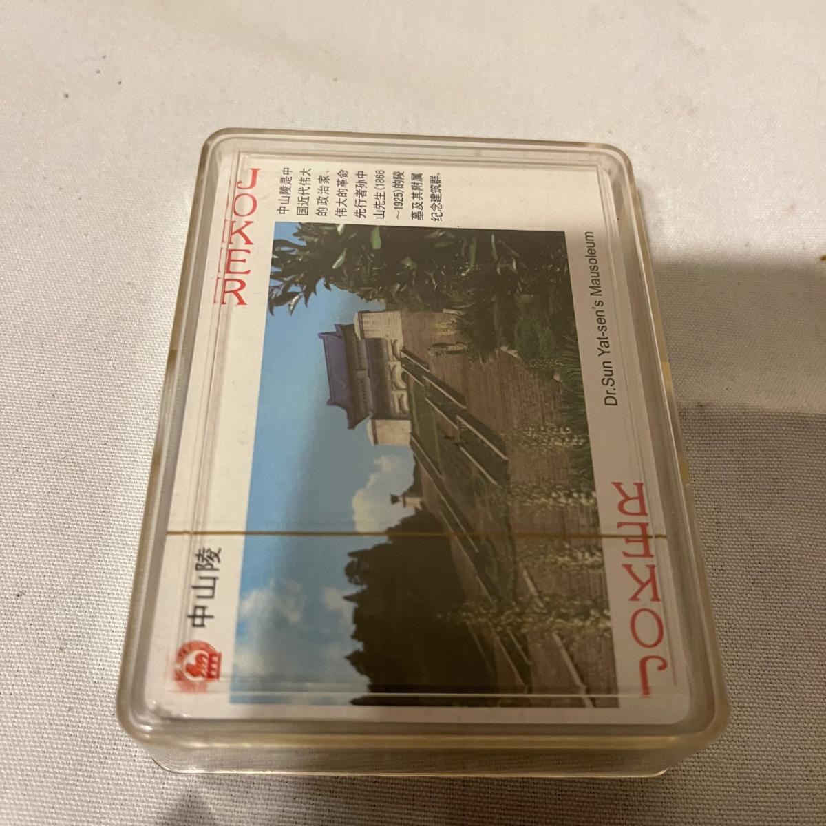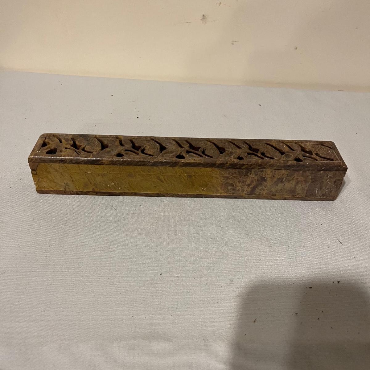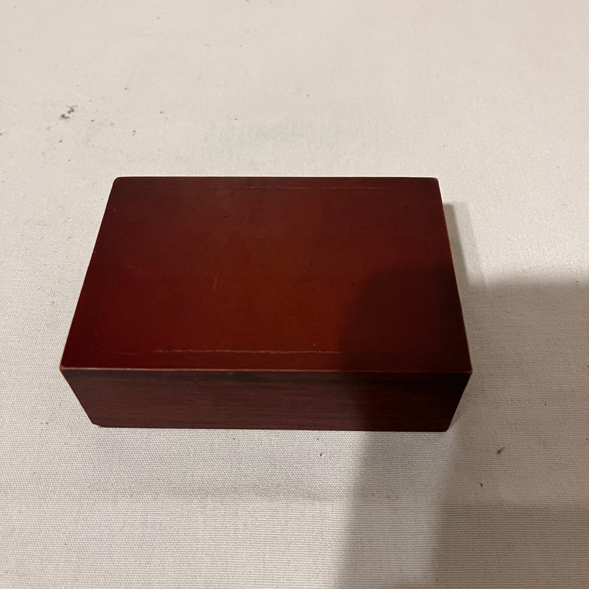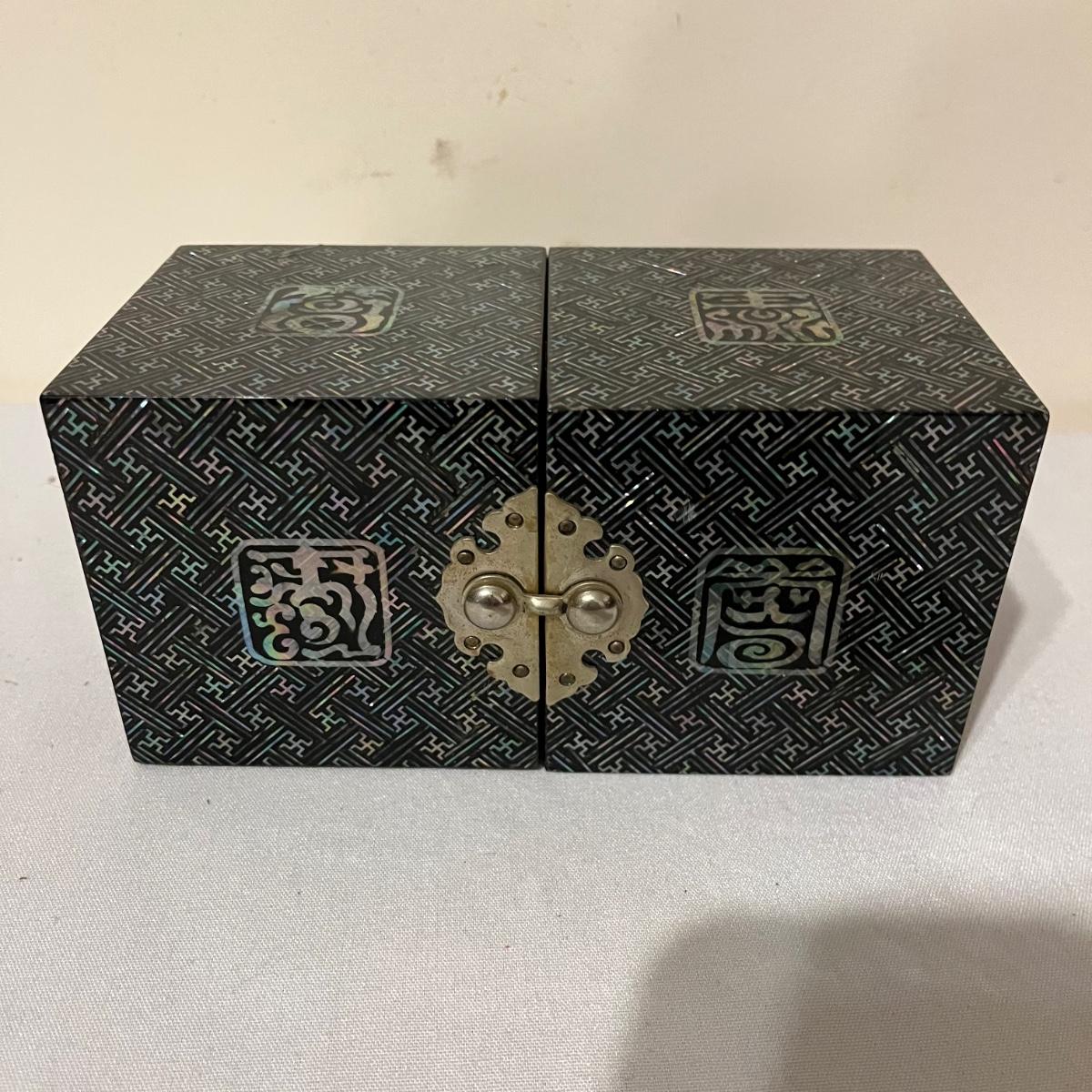 Lot includes stone box, wooden box, plastic double box with four drawers, resin dragon incense holder, paper and wood fan, playing cards and a resin dragon block. Double box measures 3.26” x 6.75” x 3.25”.