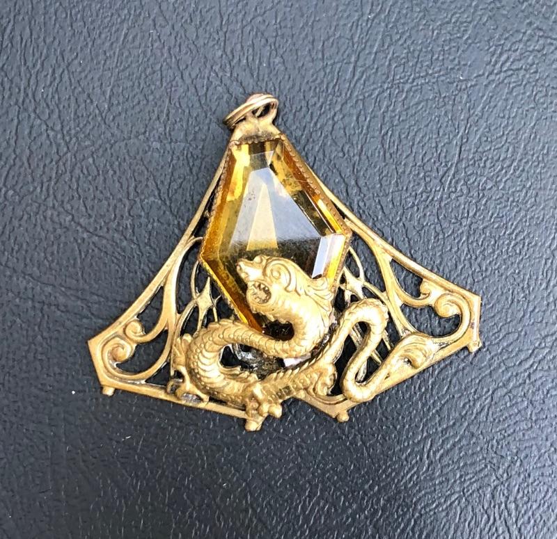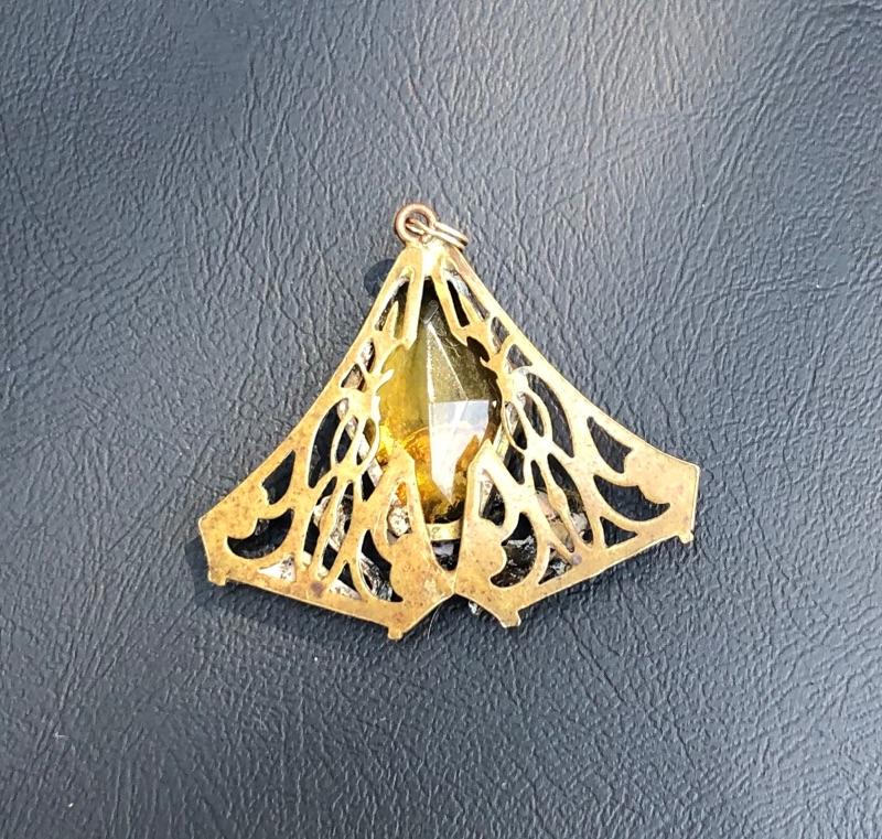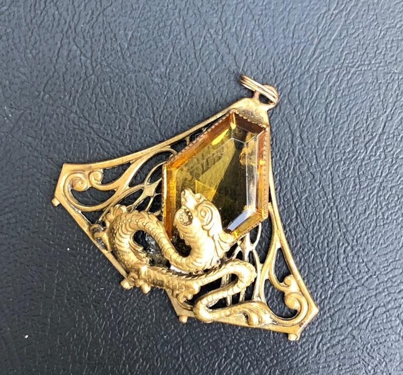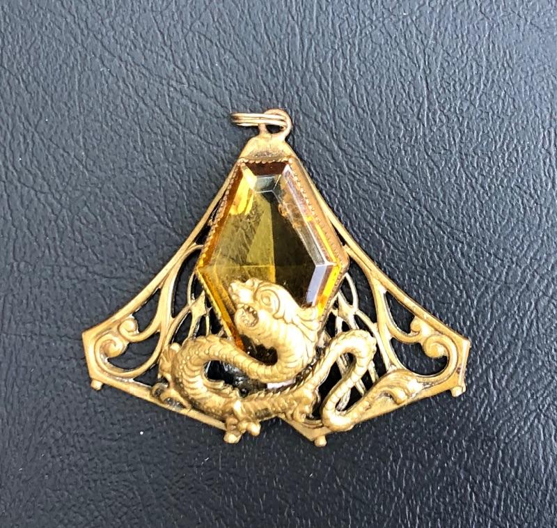 Unique Art Nouveau Style Brass Pendant with Large Yellow Glass Stone and Griffin.