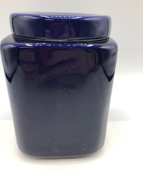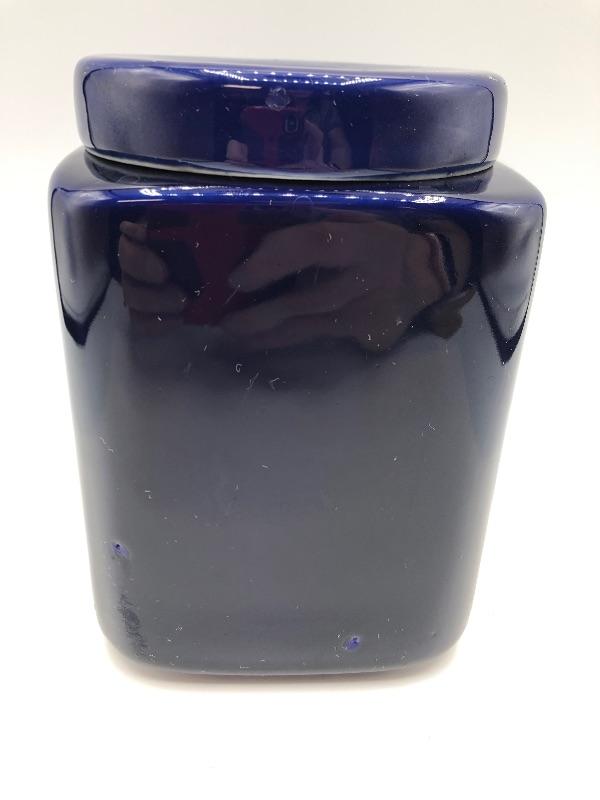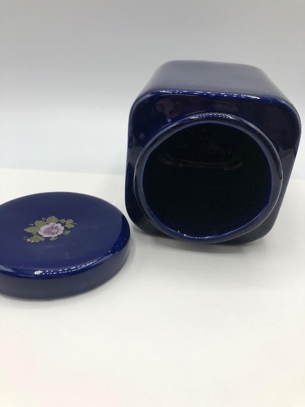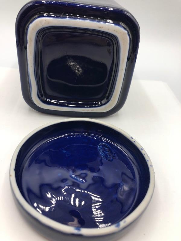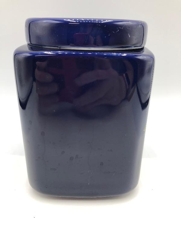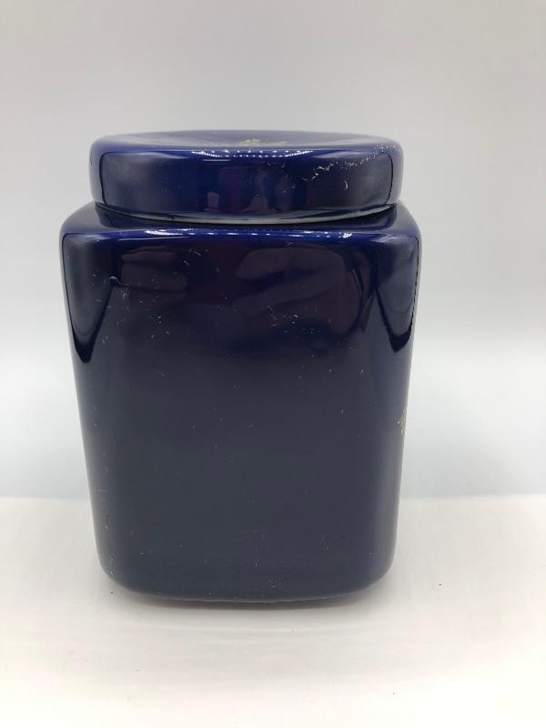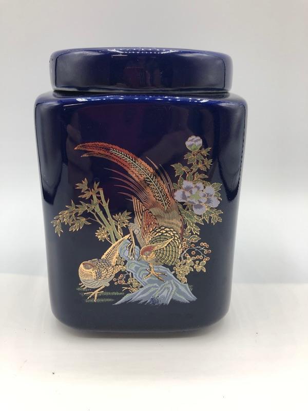 Small Asain inspired ceramic jar. Lidded. Dark blue with a painted scene on one side. Depicts two pheasants, with flowers and bamboo. Gold outlines and details. Good Condition. Some pit marks in the glaze. No chips.
