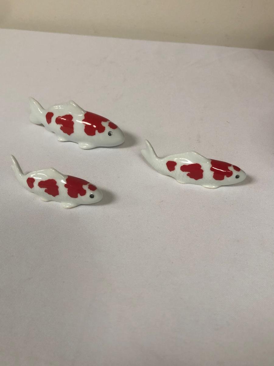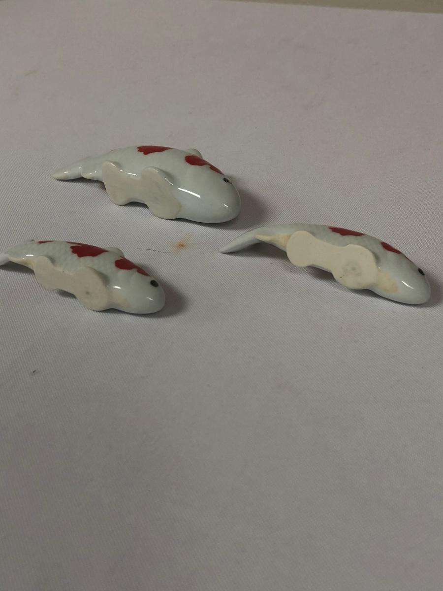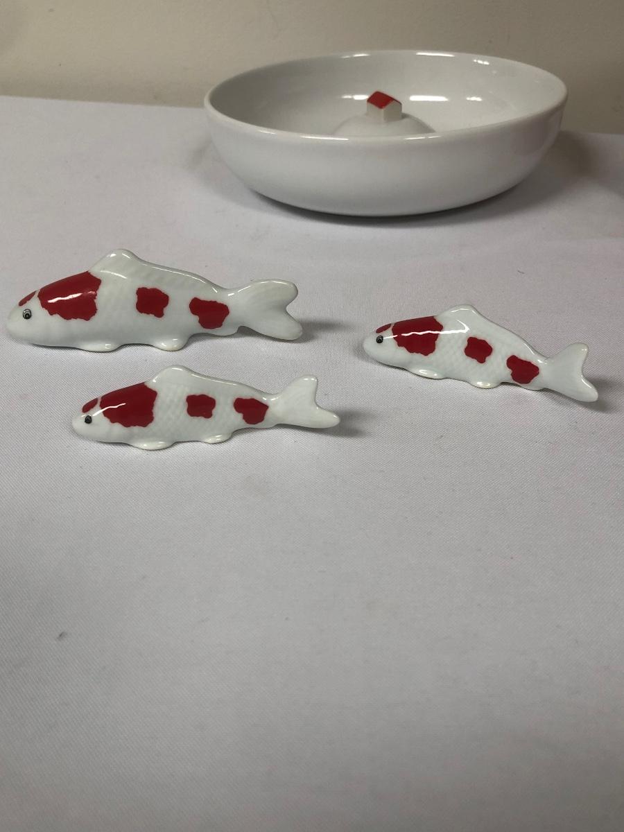 This lot includes three heavy glazed clay coy fish (longest fish is 4” long), a ceramic bowl (7” in diameter) with a raised center and a keepsake box (7” x 5” x 4”). The box is made of a light wood with different stains and finishes and has an insert tray to divide the inside. Shipping Available.