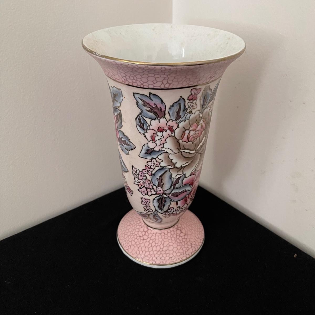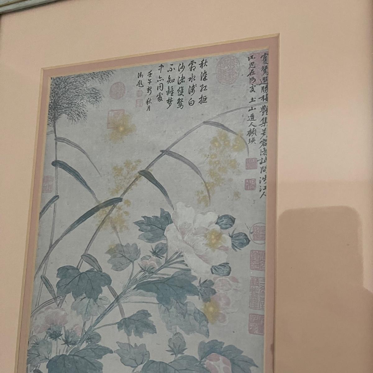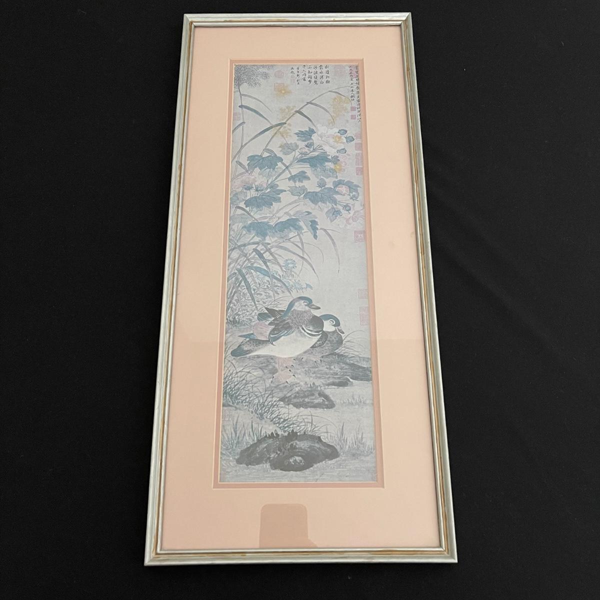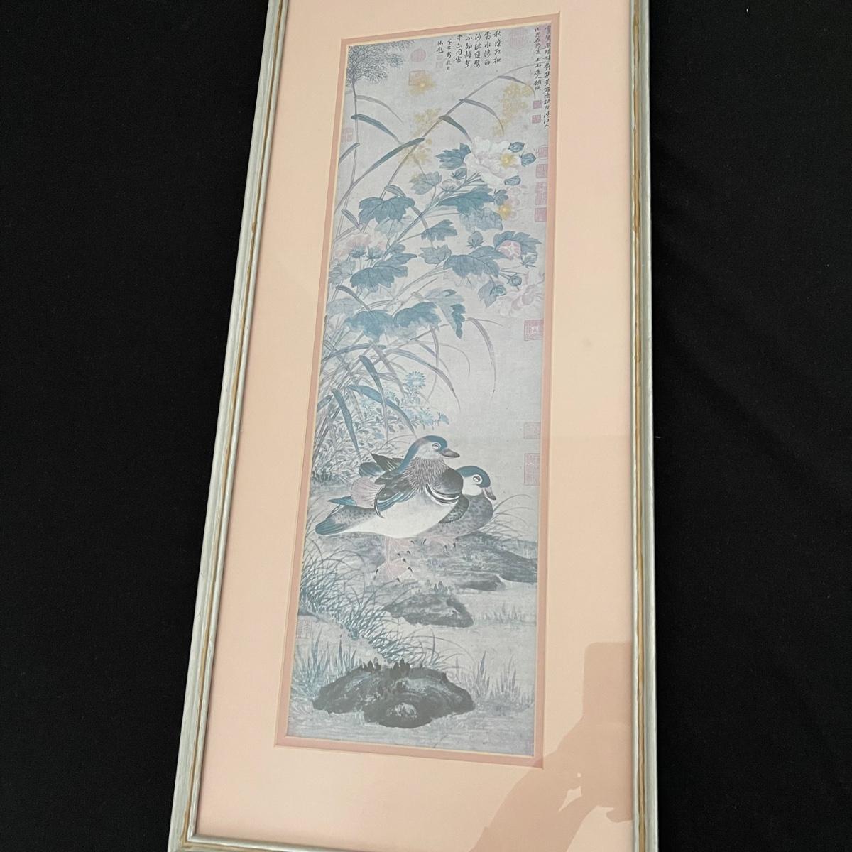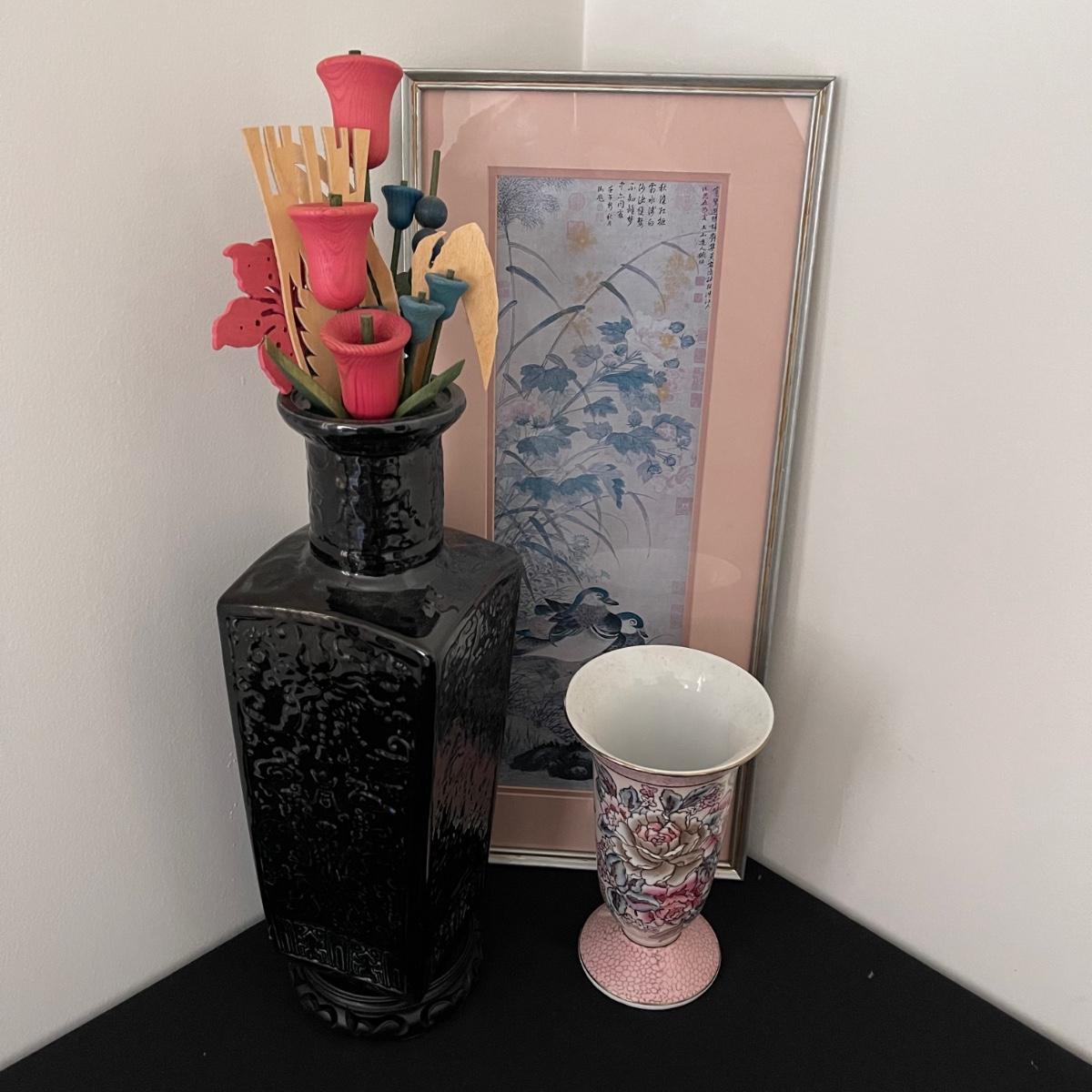 A black vase, wooden flowers, a smaller vase, and framed wall art comprise this lot. The black vase is square bodied and has a textured design on it, with a small round wooden base included. The smaller vase is pink and floral with gold colored accents. Lastly, the wall art is a 10.5” x 23” framed print of ducks by the edge of water, it has some kanji printed in the top right corner.