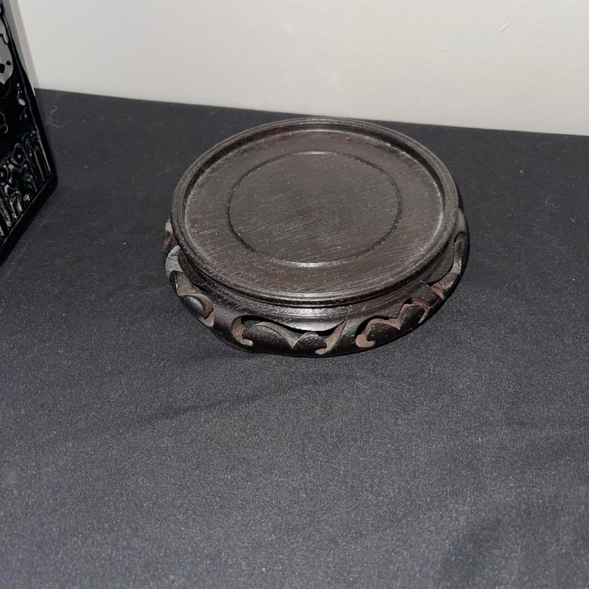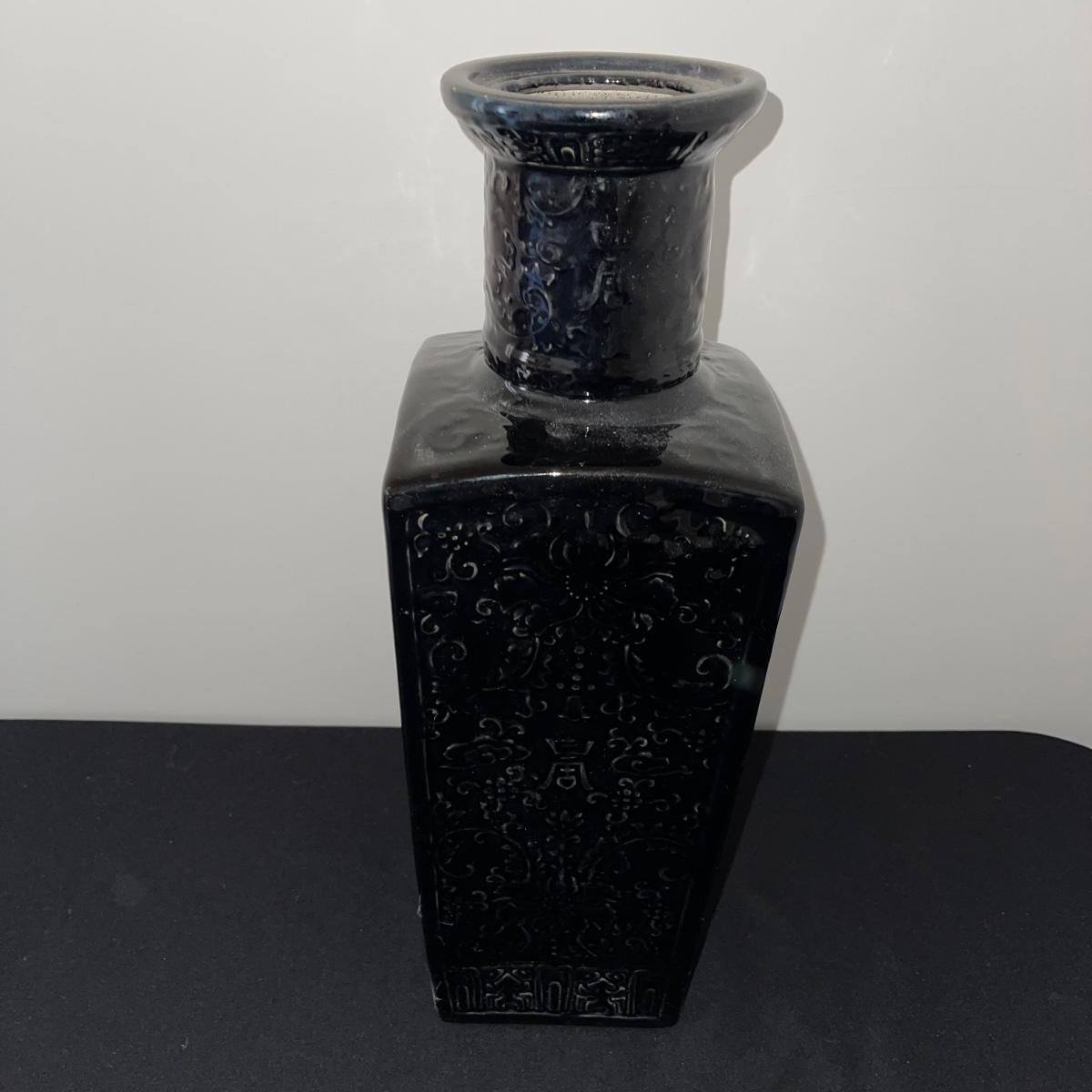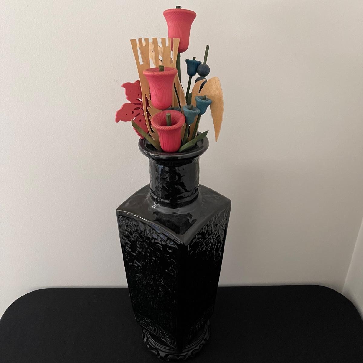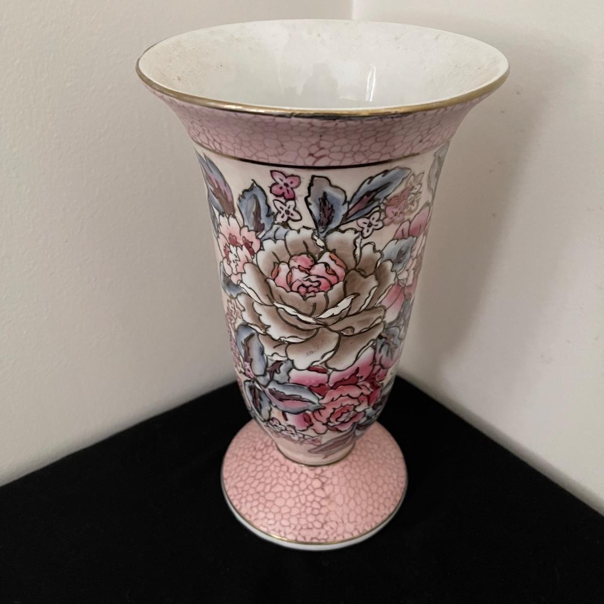 A black vase, wooden flowers, a smaller vase, and framed wall art comprise this lot. The black vase is square bodied and has a textured design on it, with a small round wooden base included. The smaller vase is pink and floral with gold colored accents. Lastly, the wall art is a 10.5” x 23” framed print of ducks by the edge of water, it has some kanji printed in the top right corner.