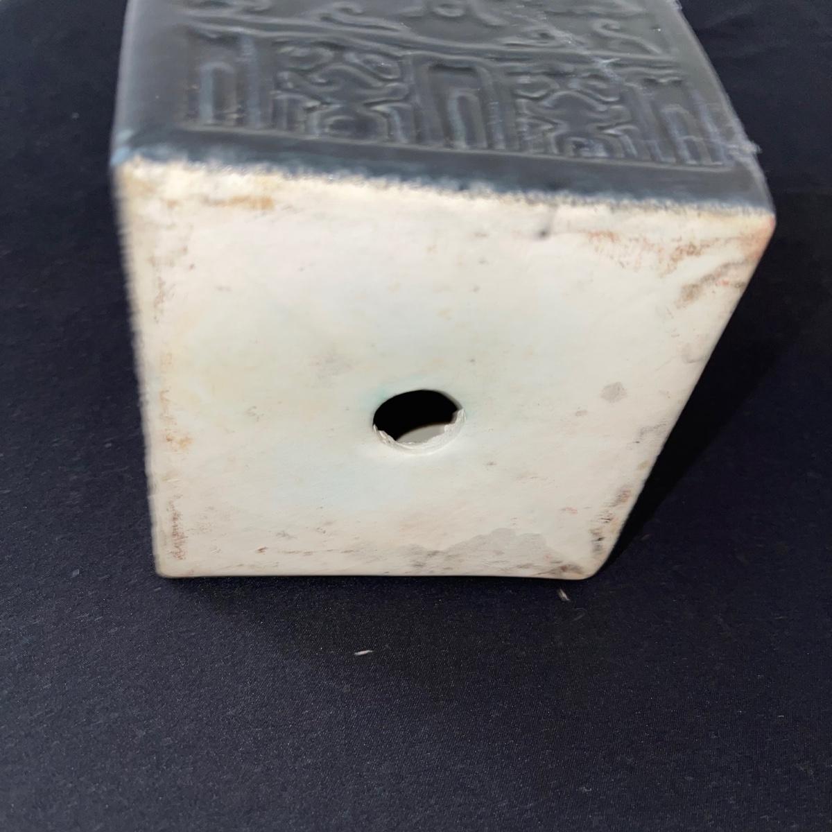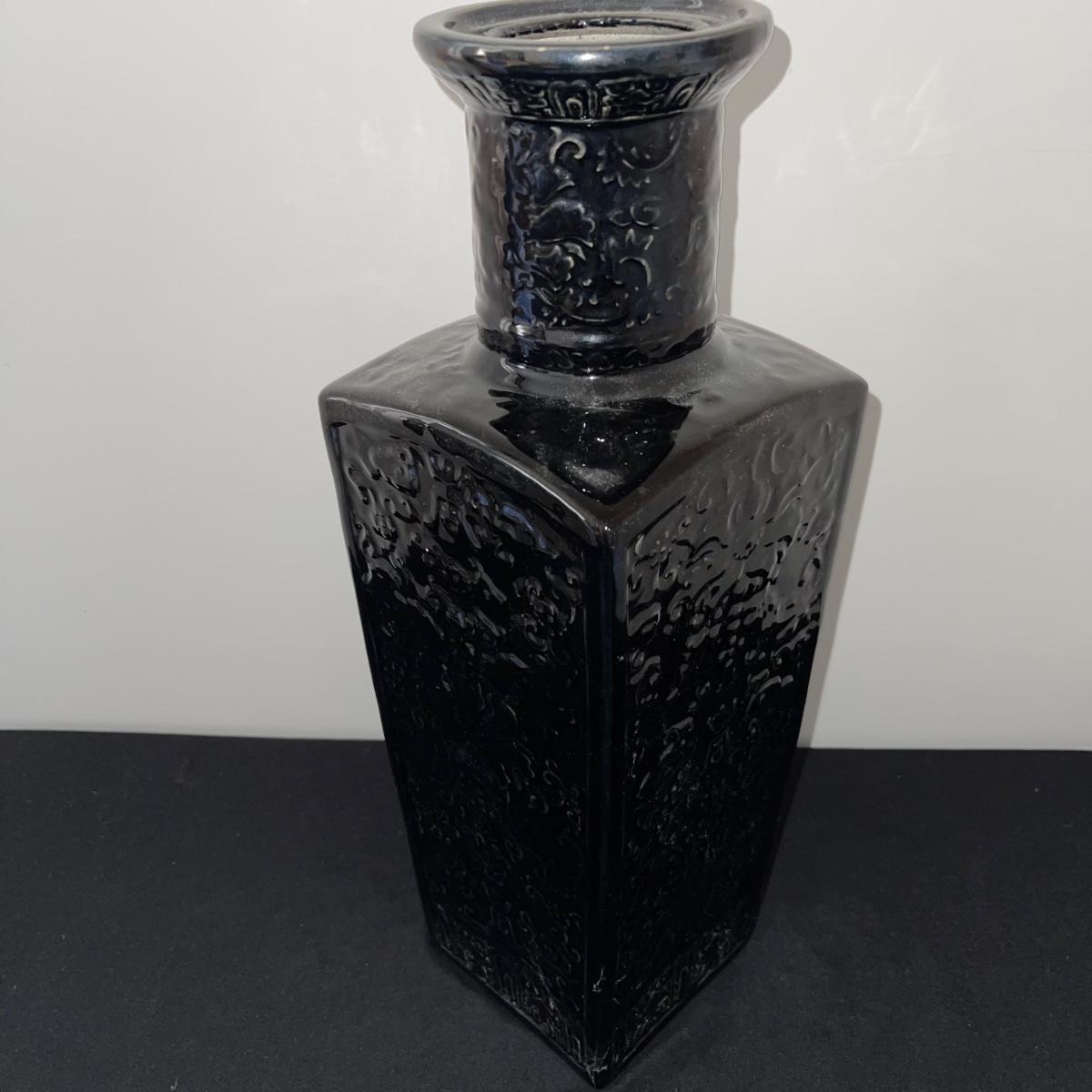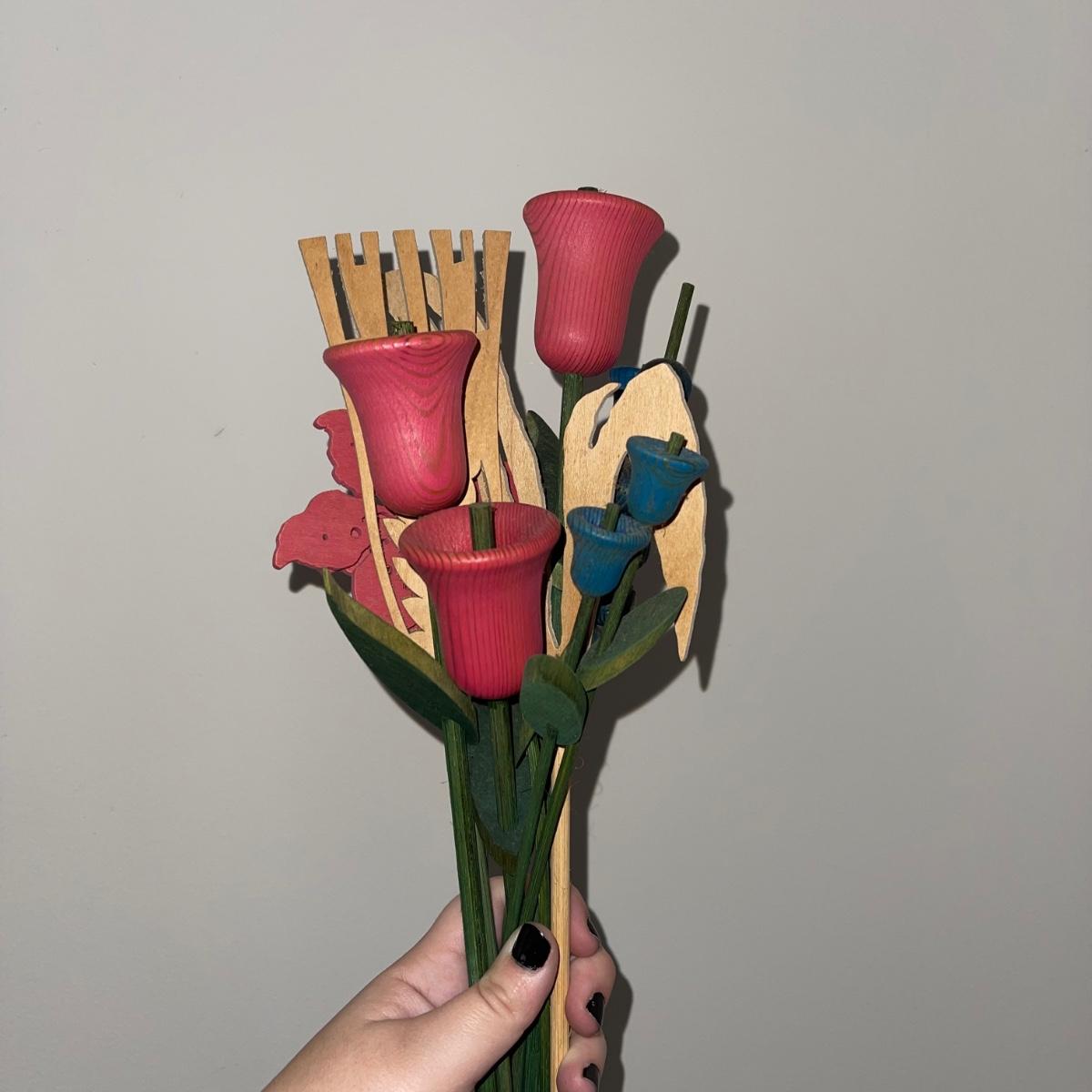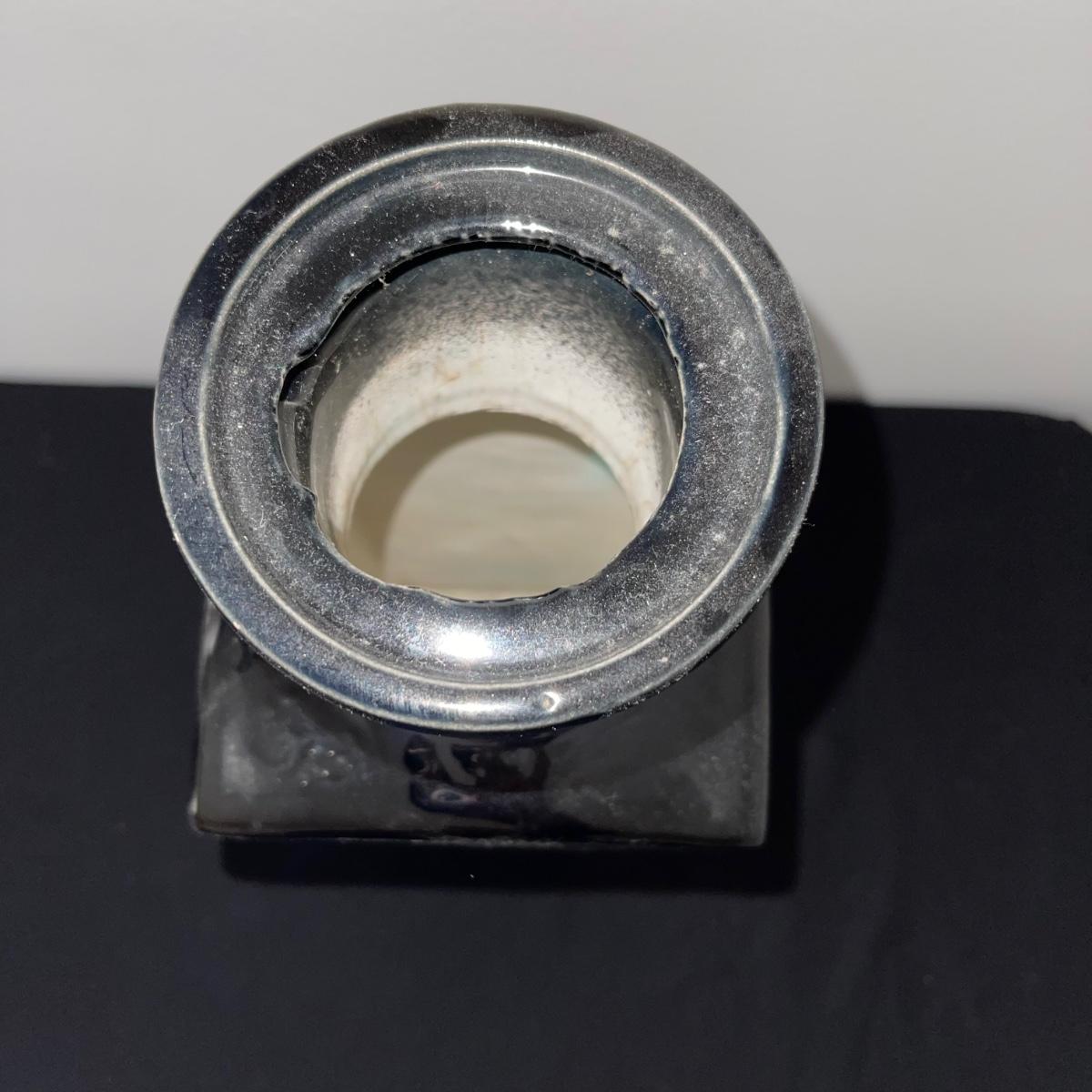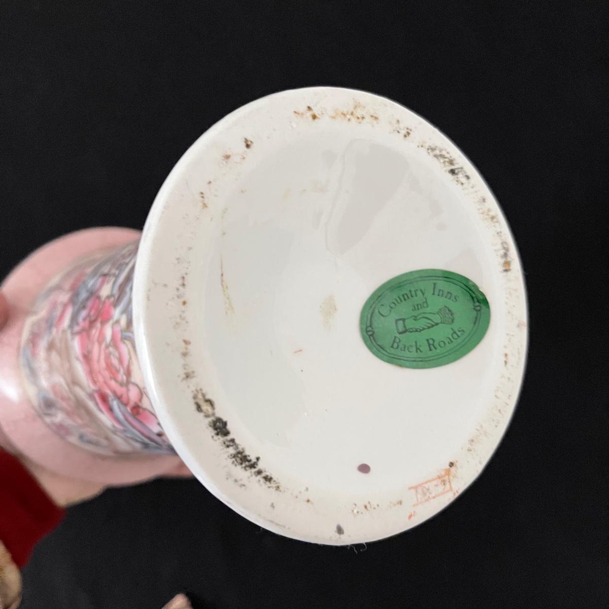 A black vase, wooden flowers, a smaller vase, and framed wall art comprise this lot. The black vase is square bodied and has a textured design on it, with a small round wooden base included. The smaller vase is pink and floral with gold colored accents. Lastly, the wall art is a 10.5” x 23” framed print of ducks by the edge of water, it has some kanji printed in the top right corner.