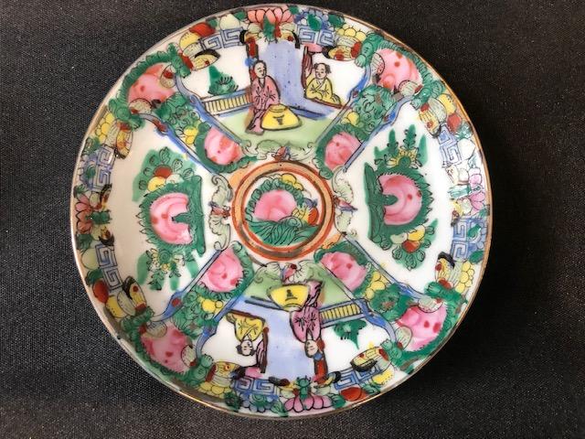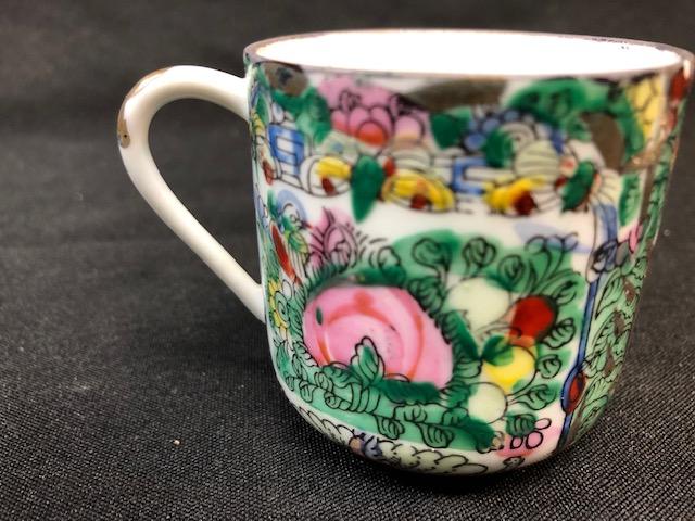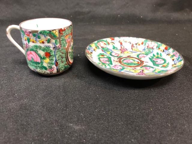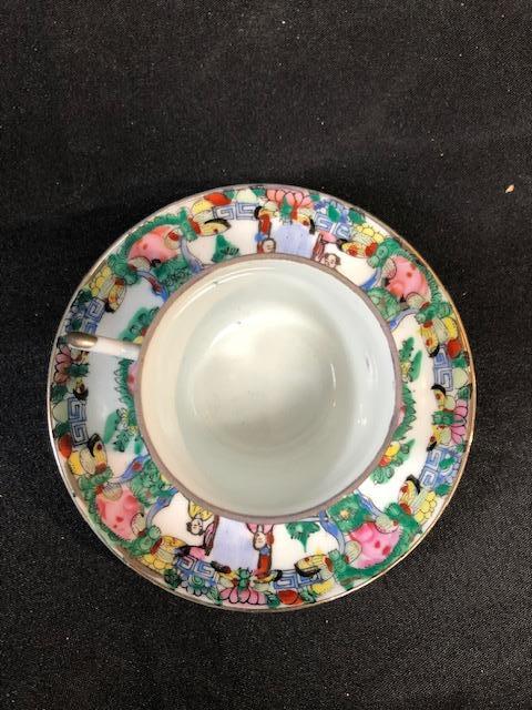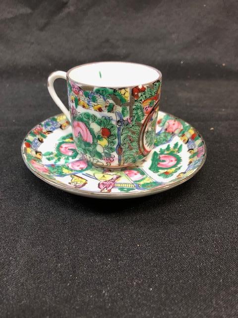 Asian inspired Demitasse Cup & Saucer. Colorful scene, with flowers and people. Good Condition.