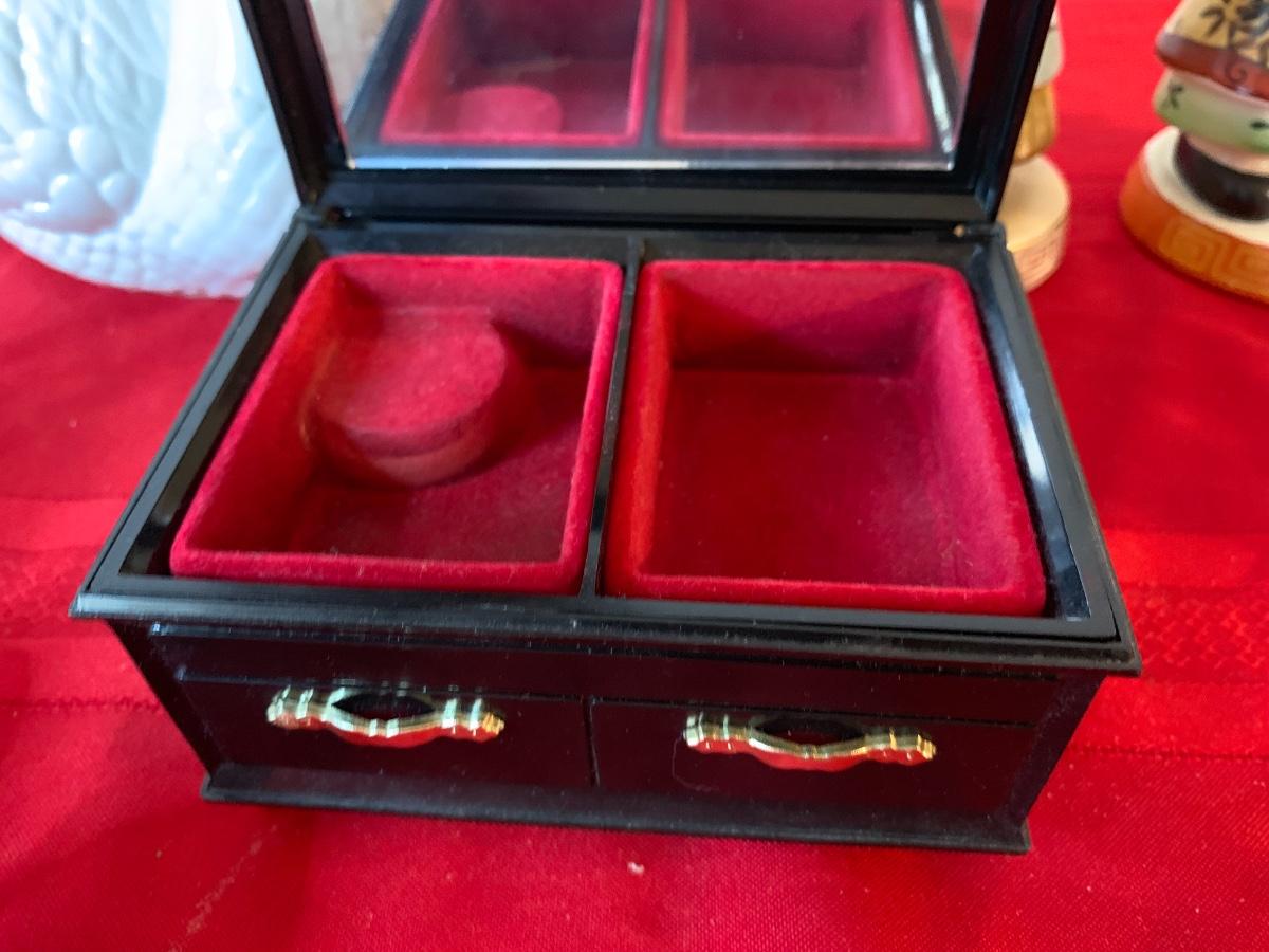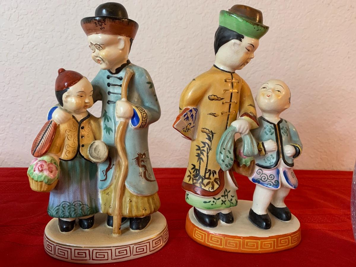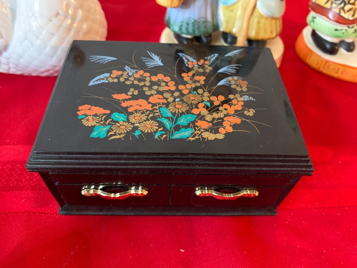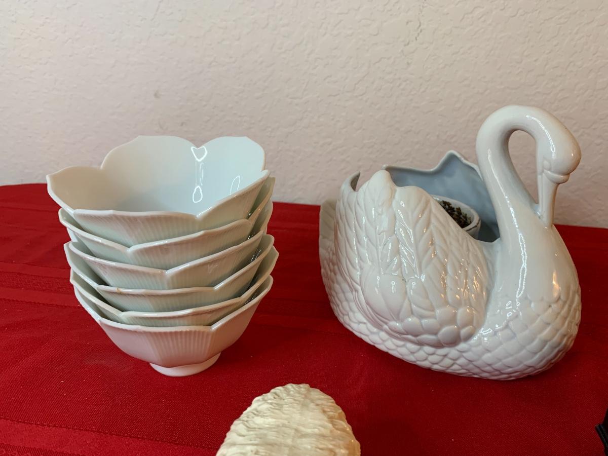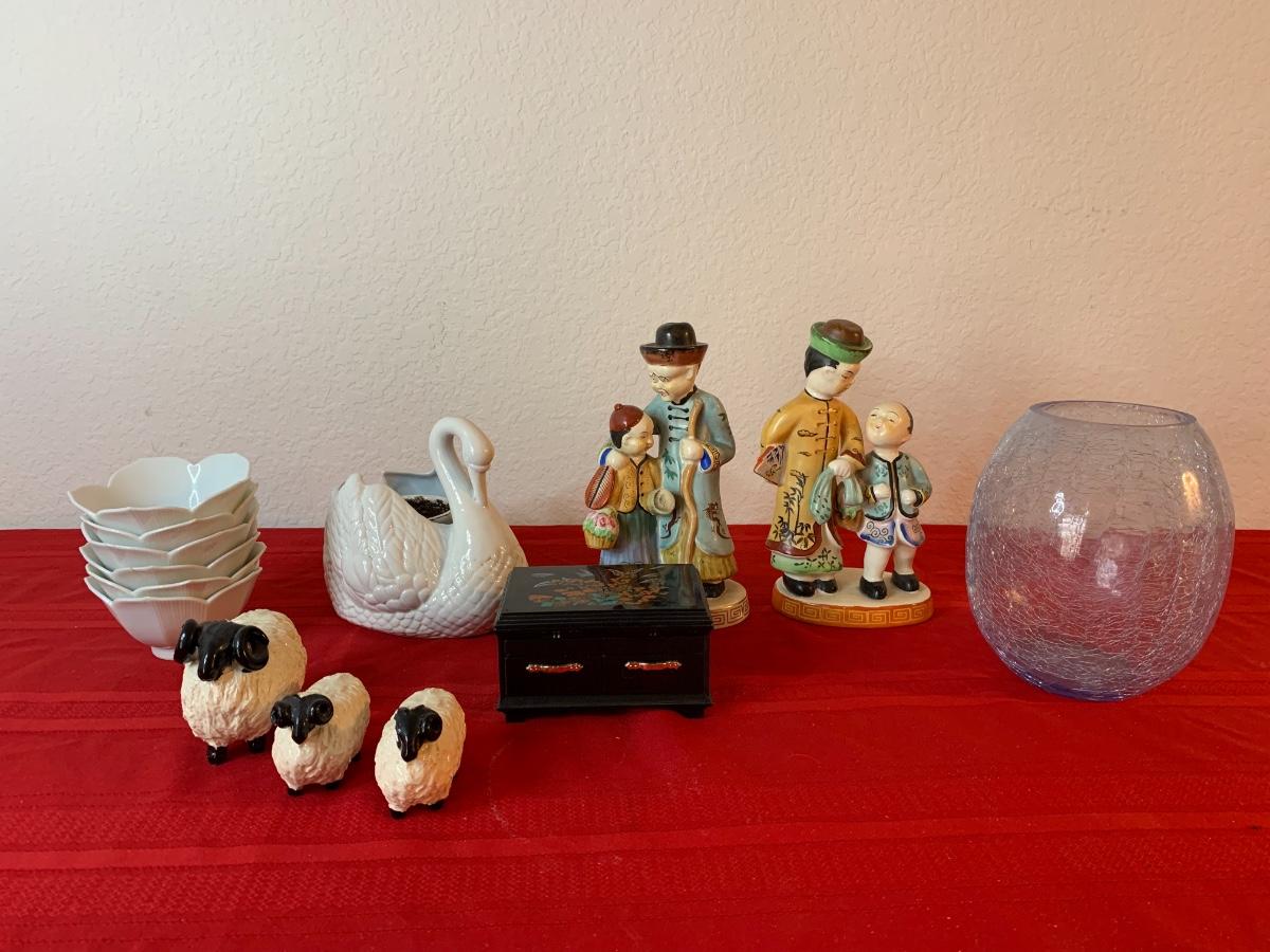 Assortment of asian inspired figurines and home decor. Includes figurines (both large ones made in occupied Japan), small bowls, a jewelry box (lid needs to be fixed) and a swan planter. All pieces in good to great condition
