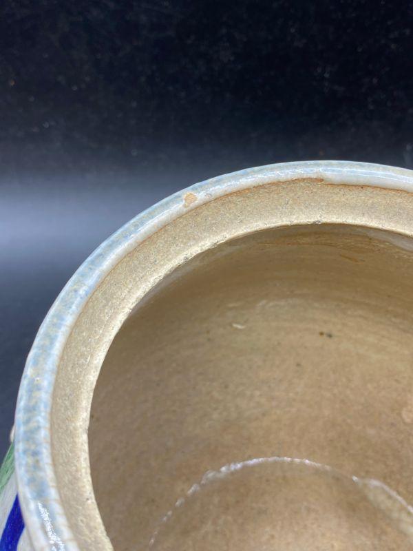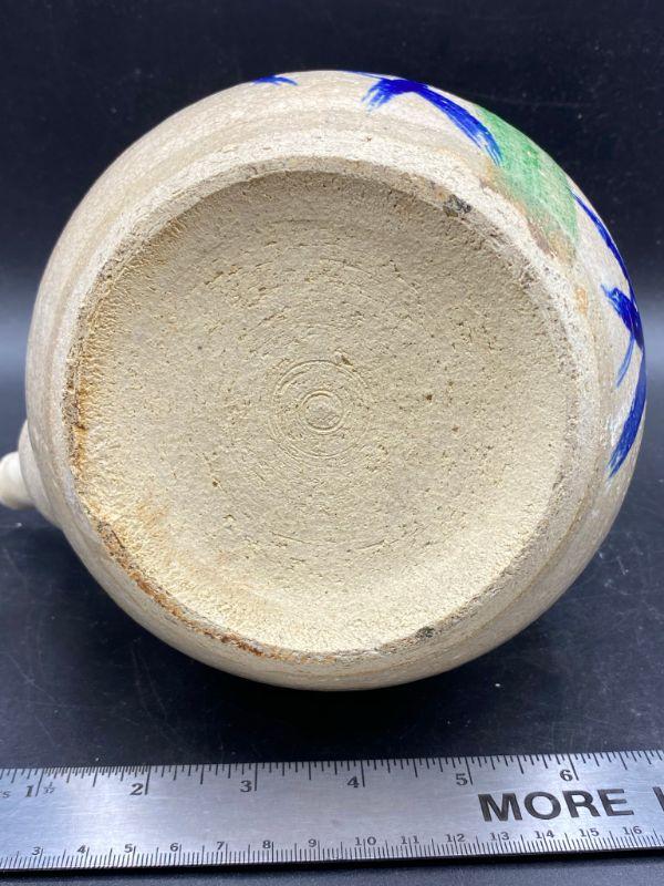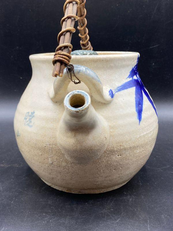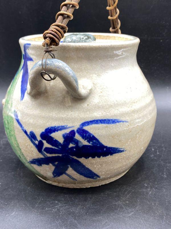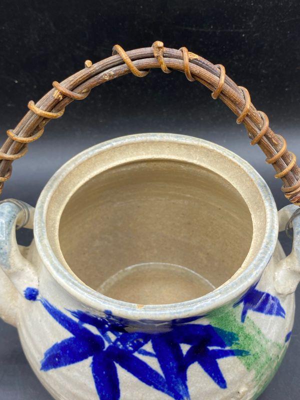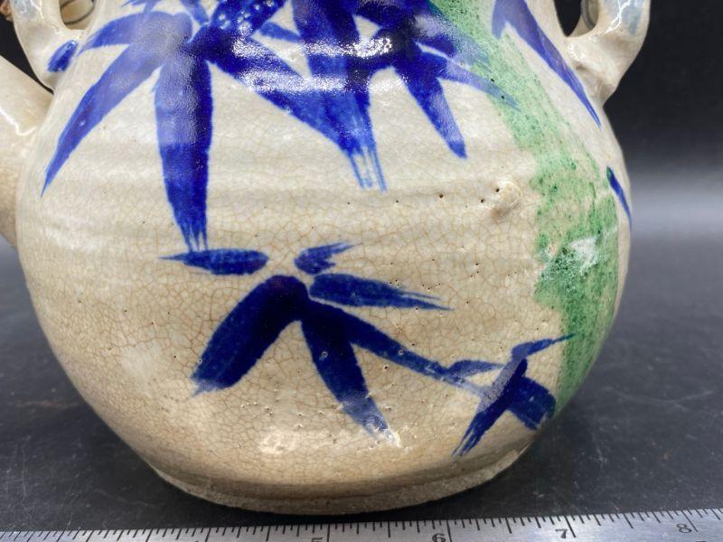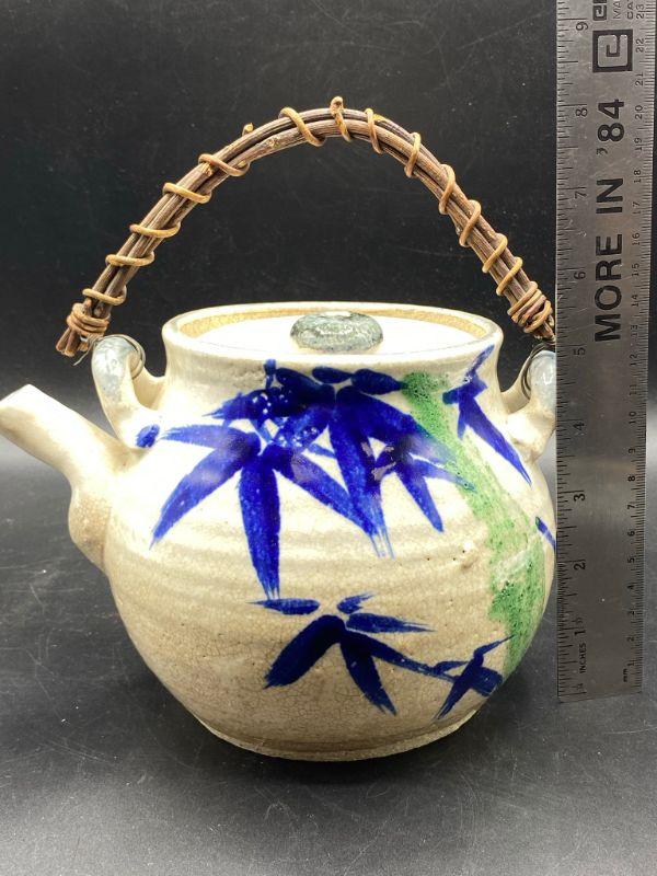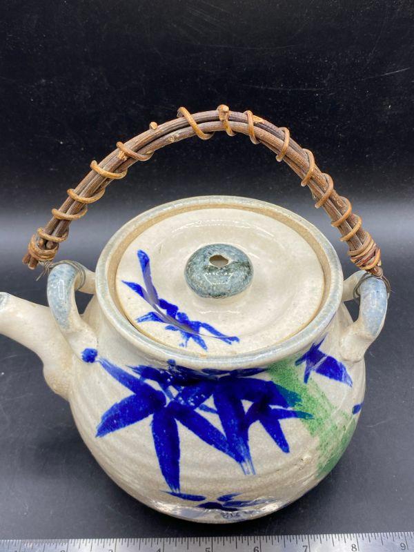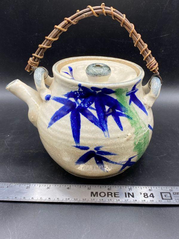 Asian inspired tea pot. Thick pottery with a blue/ green bamboo pattern. Wood handle. Displays wonderfully. Does have crazing in the glaze.