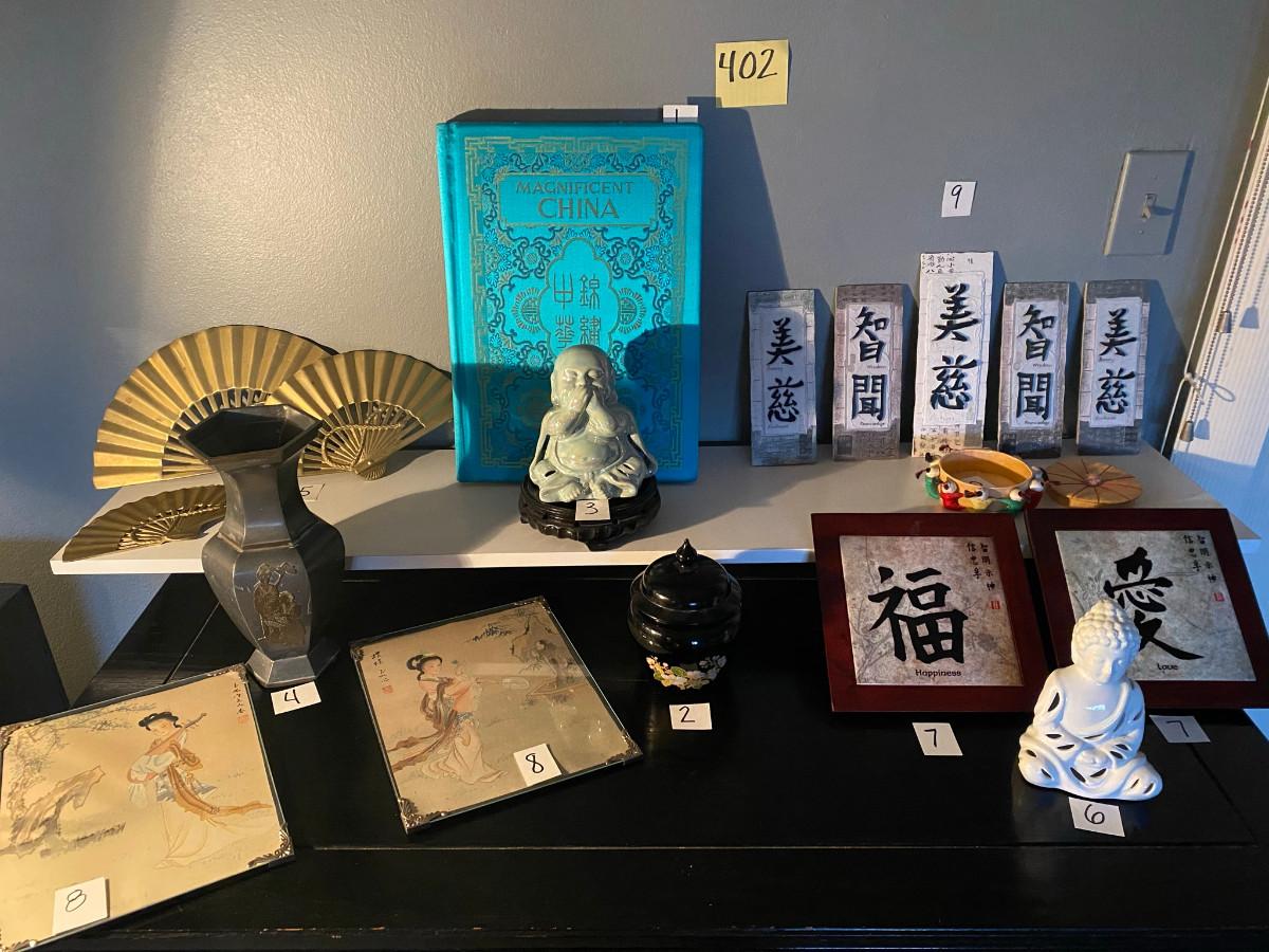 Magnificent China book, candle jar with lid, Buddha statue 4" diam x 6" h with stand 9.5" h x 6" diam, metal vase, 3 brass fans, white statue, 5 wall hangings, 2 asian pictures, 2 wall hangings, and small sewing basket