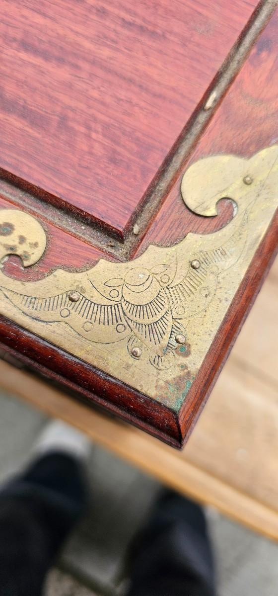 Pleased to offer this gorgeous vintage Rosewood and Brass Jewelry Box. It features a hand-carved Chinoiserie emblem on the hinged top. The top opens to a vibrant turquoise silk compartment. The front has two drawers the have campaign style sunken pulls. One drawer is a single compartment. The other has a center compartment with two ring sections on the sides. Each side of the box has brass handles and the front a brass clasp.
