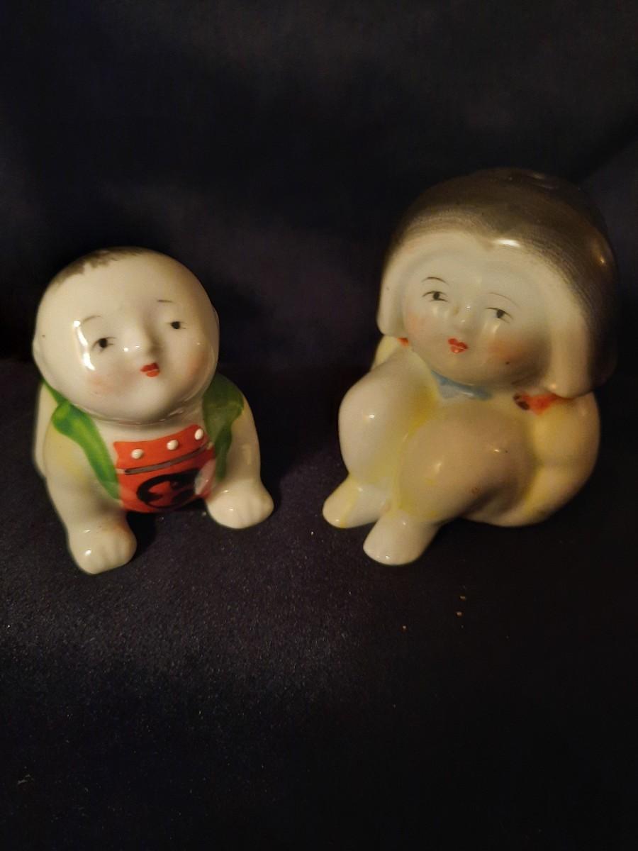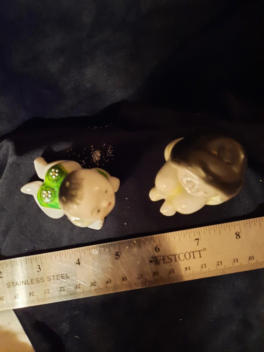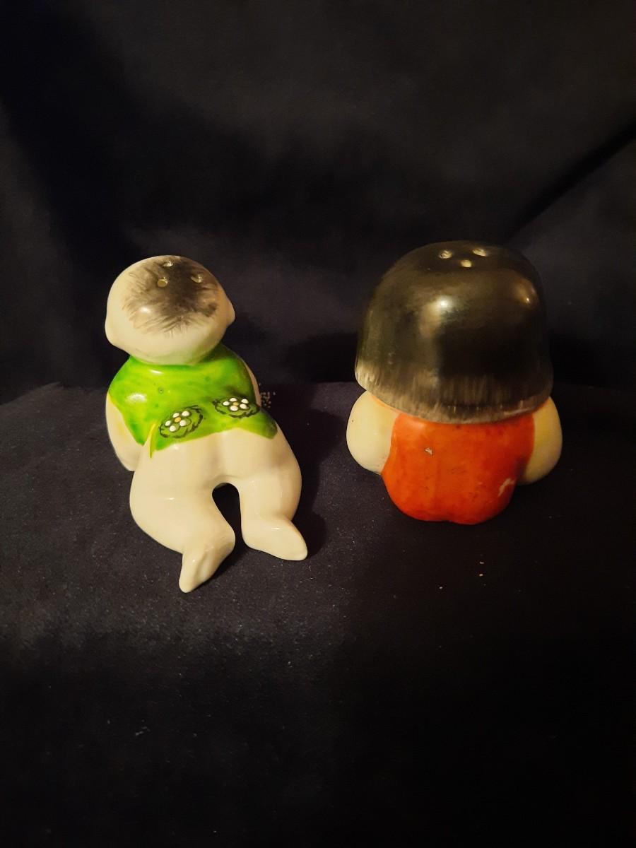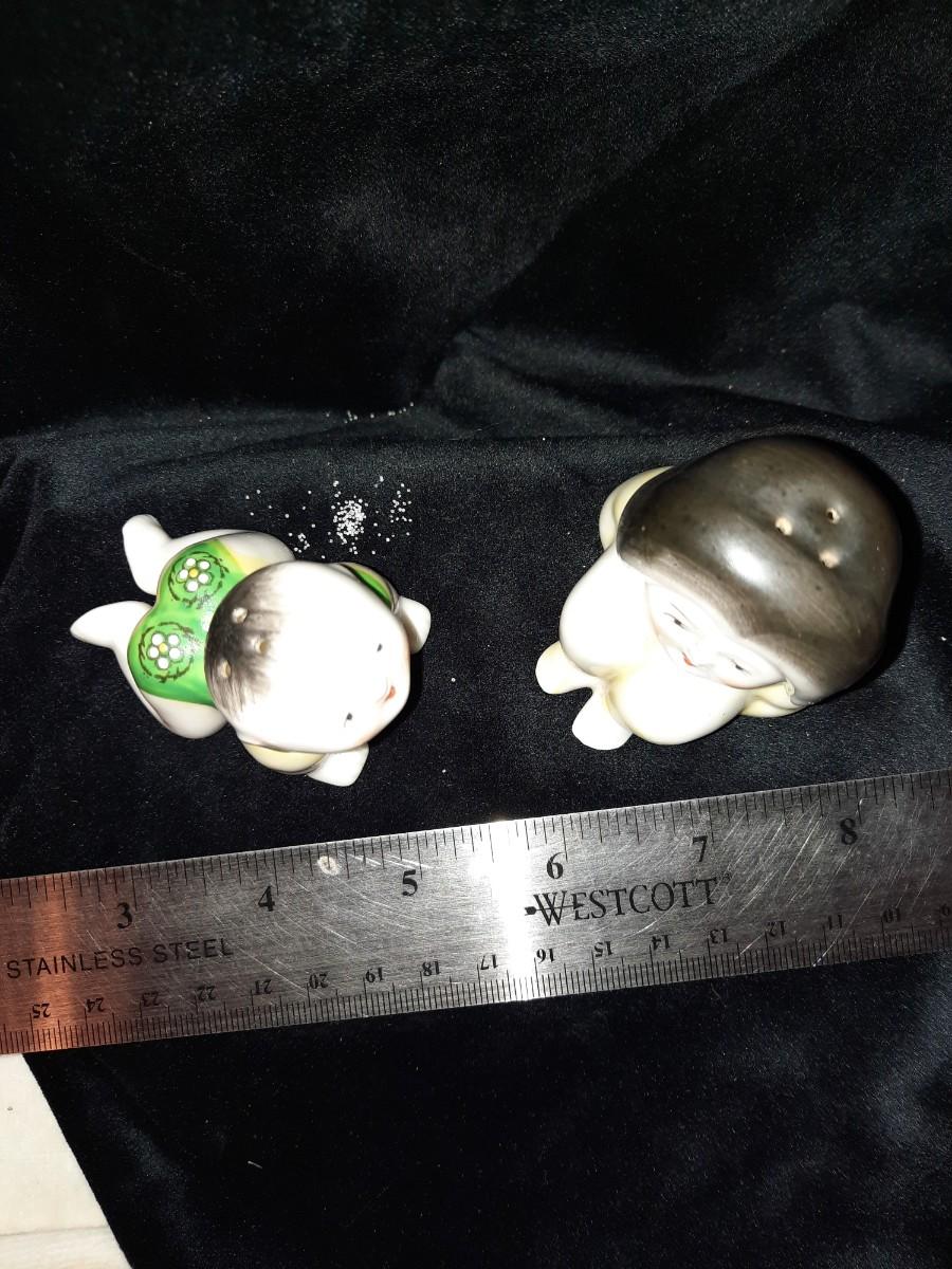 Cute litttle asian kids salt and pepoer shakers. Solid thick Japan ceramic.