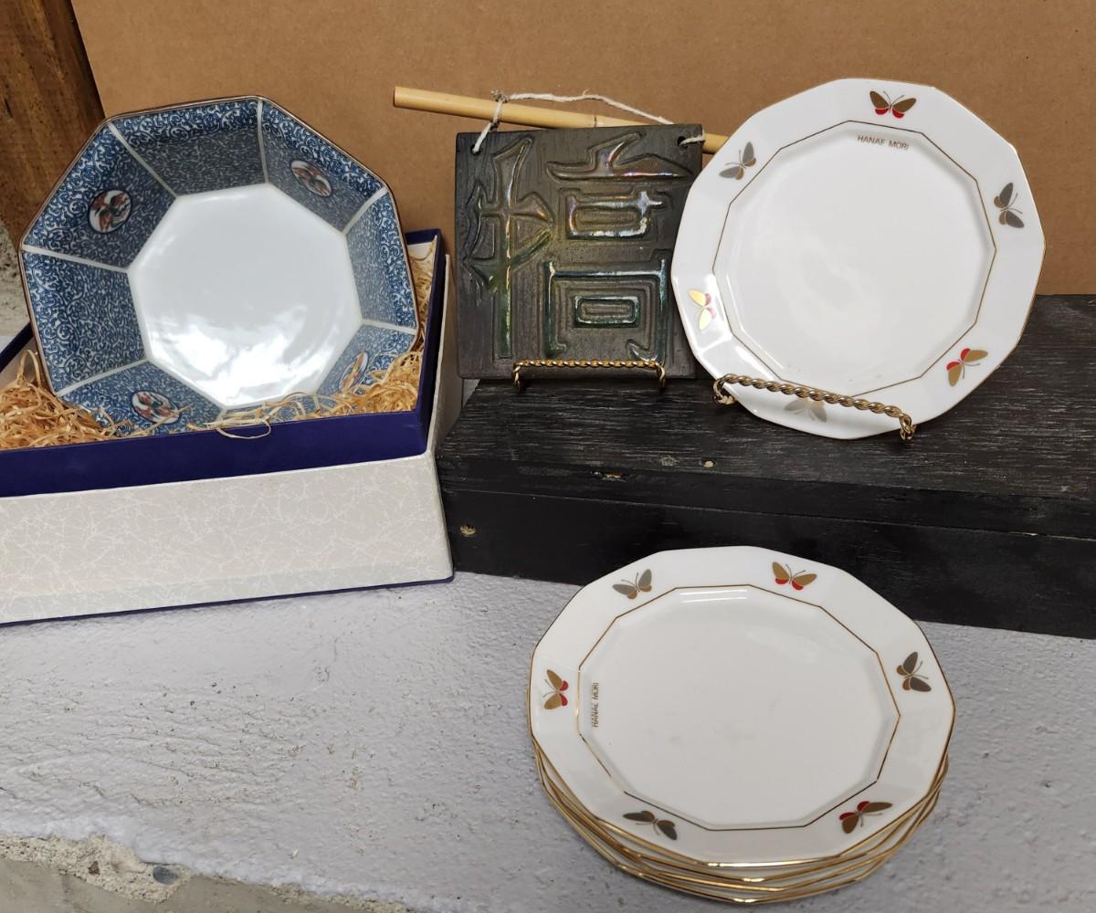 set of 5 Hanae Mori dessert plates, beautiful Raku piece by local Brad Bachmeier and a fantastic bowl still in its box. Fabulous lot