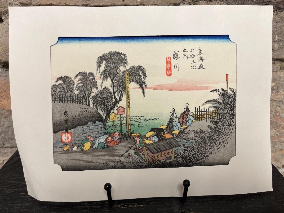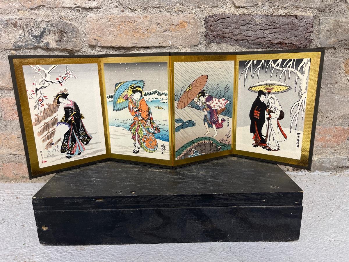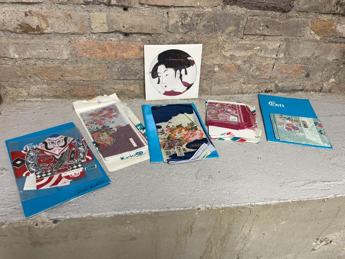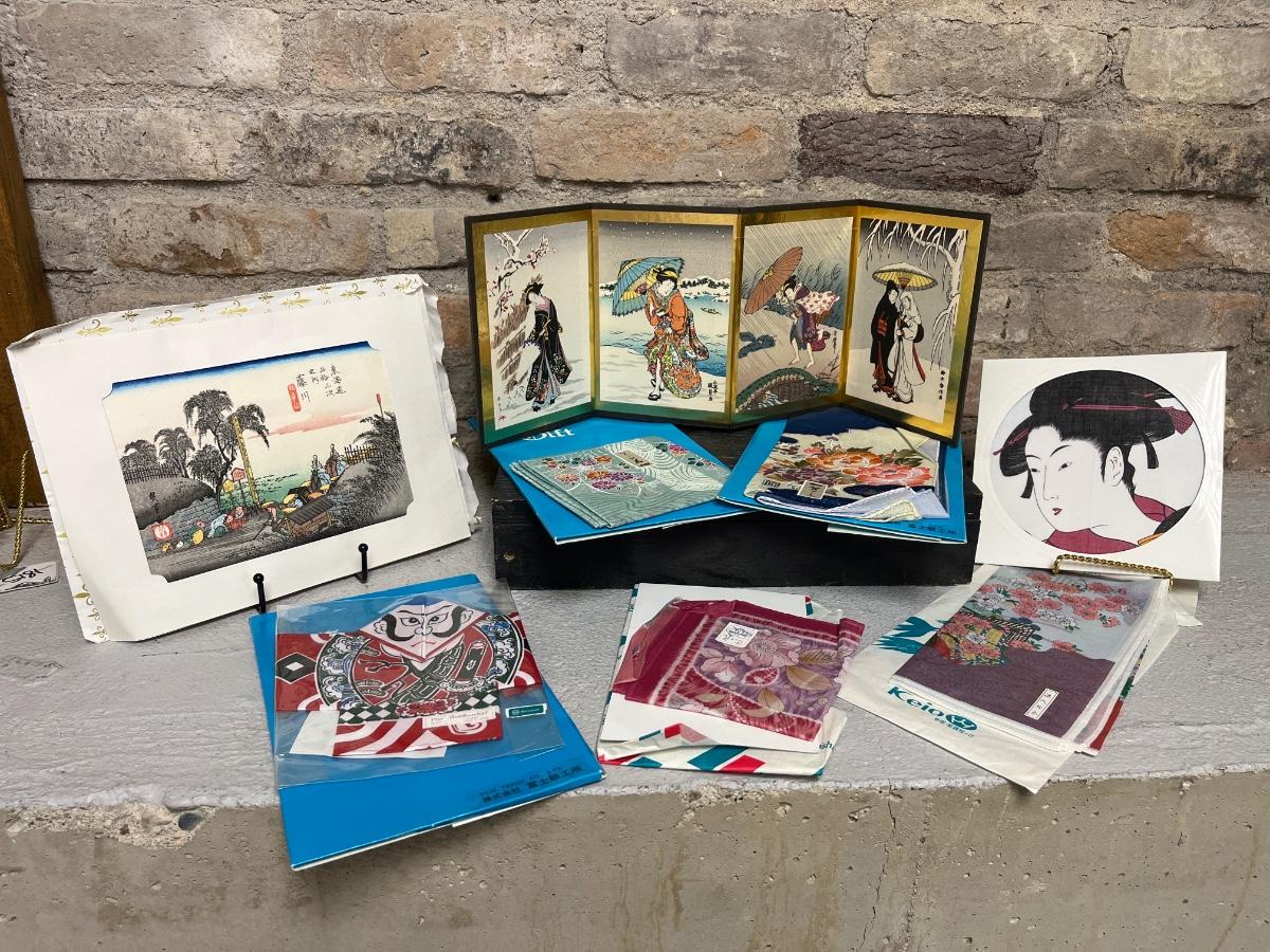 Fun collection! Japanese folding screen and wood block print, and an assortment of handkerchiefs