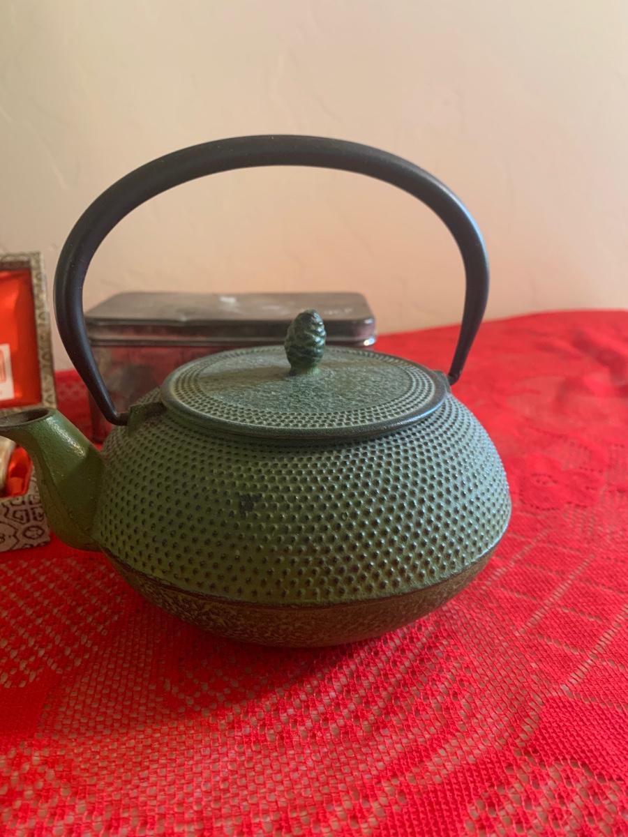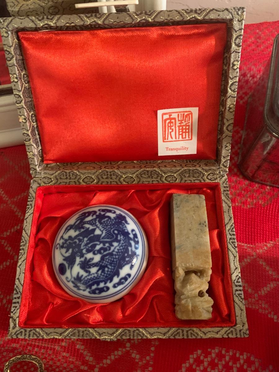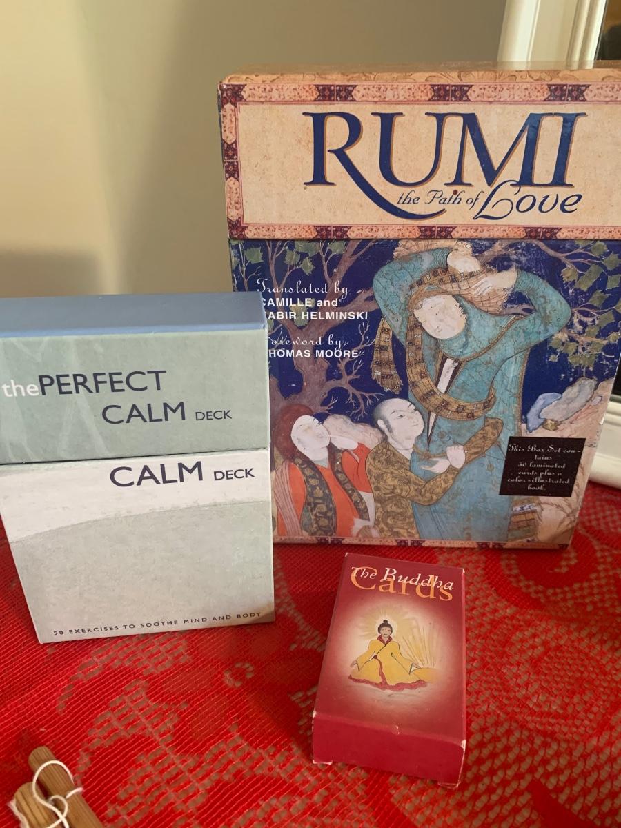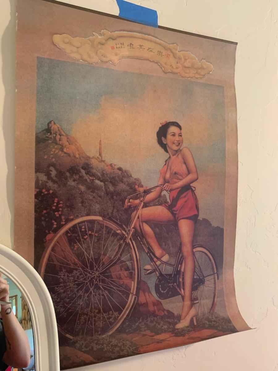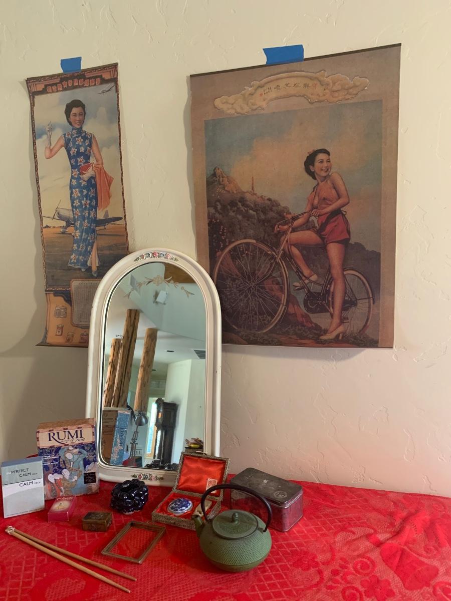 2 vintage Shanghai cigarette advertising posters, white wood framed mirror, Rumy cards, Buddha cards, perfect calm cards, cast iron tea pot, wax stamp kit and more
