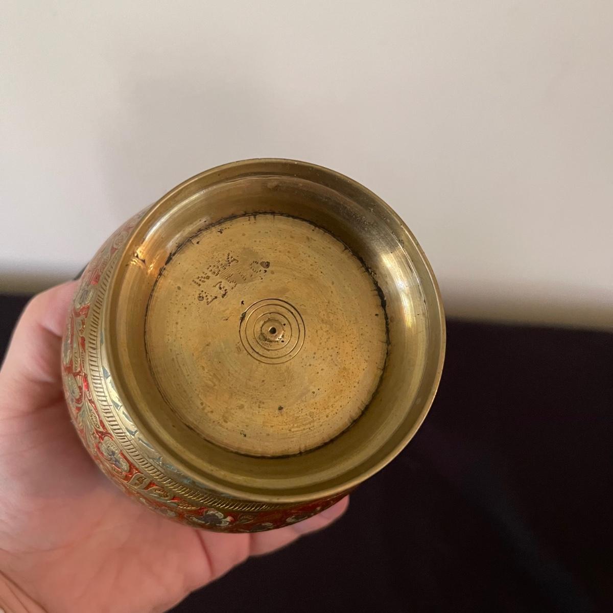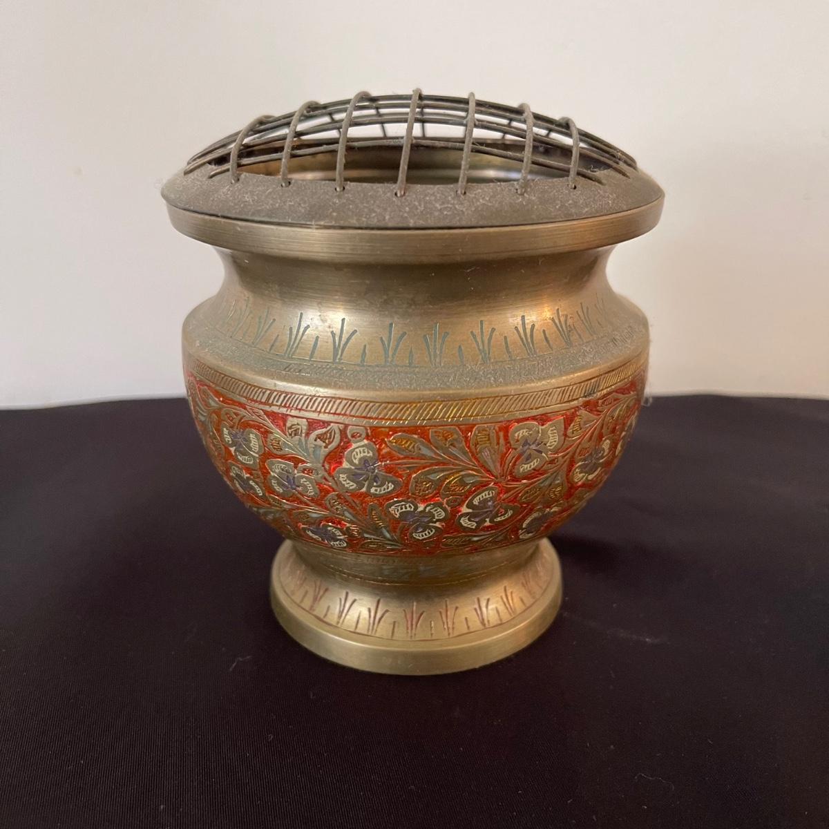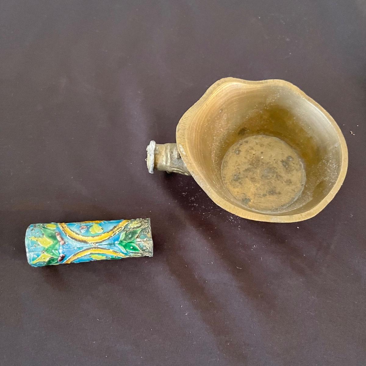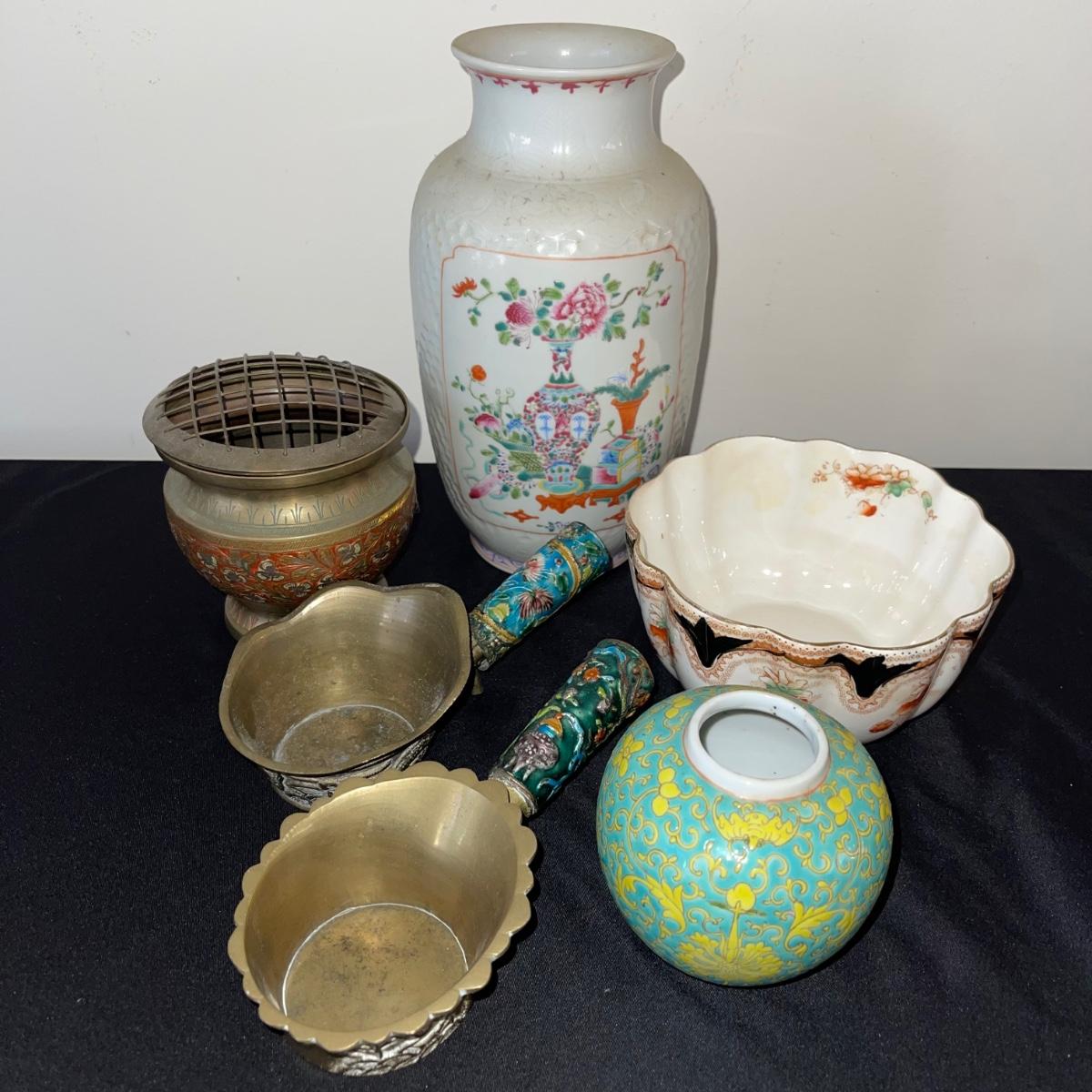 Items include a decorative bowl, a ceramic vase, a metal vase with flower stays on top, a small green and blue ceramic vase, and two brass basins with decorative handles. One handle has come off but could be glued back on to keep sturdy. Some items have signatures and some do not. The tall vase is about 9 inches tall.