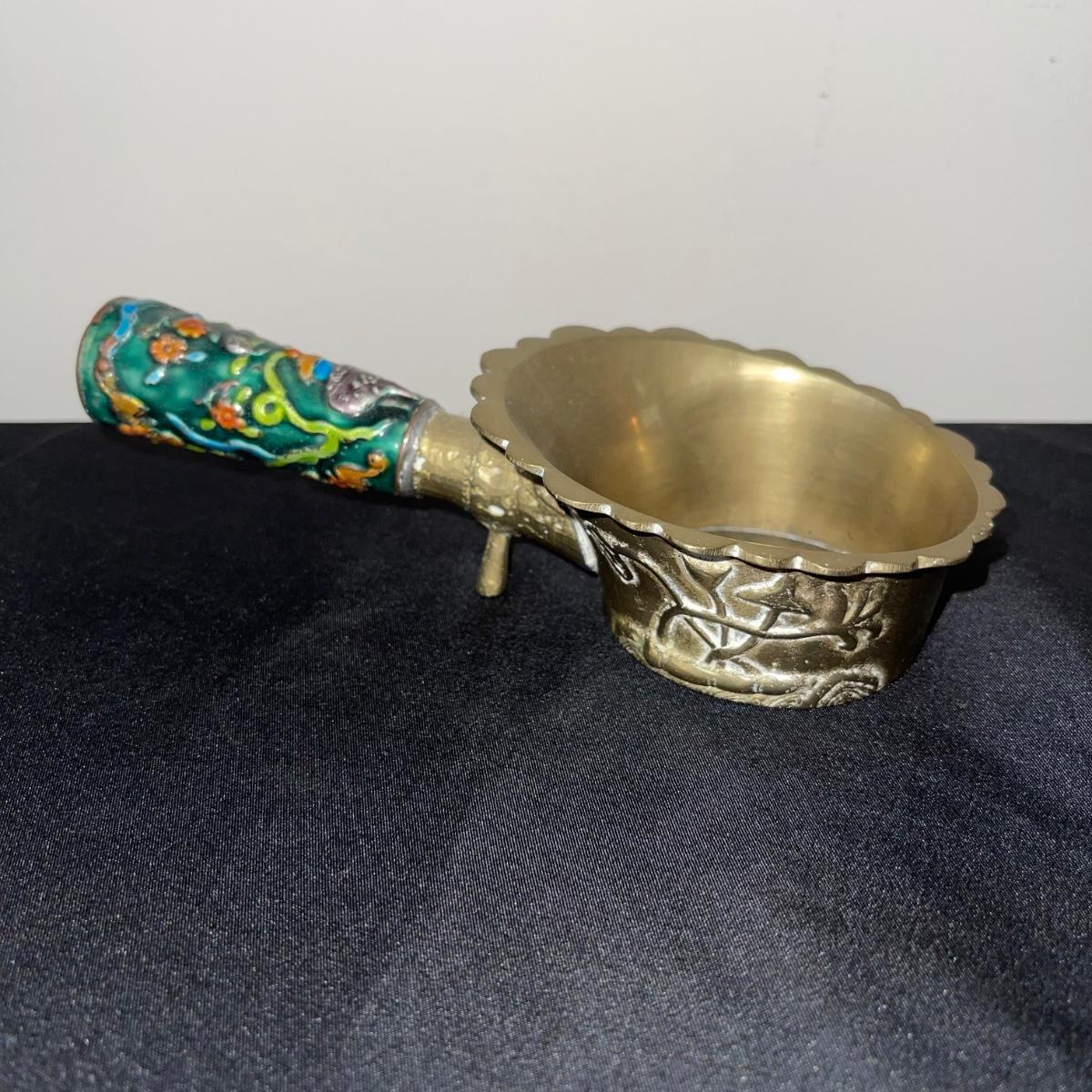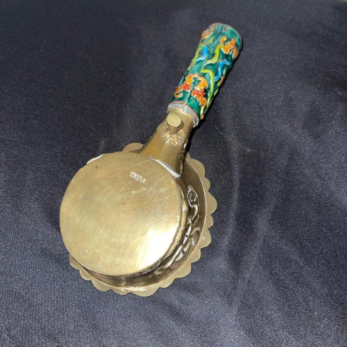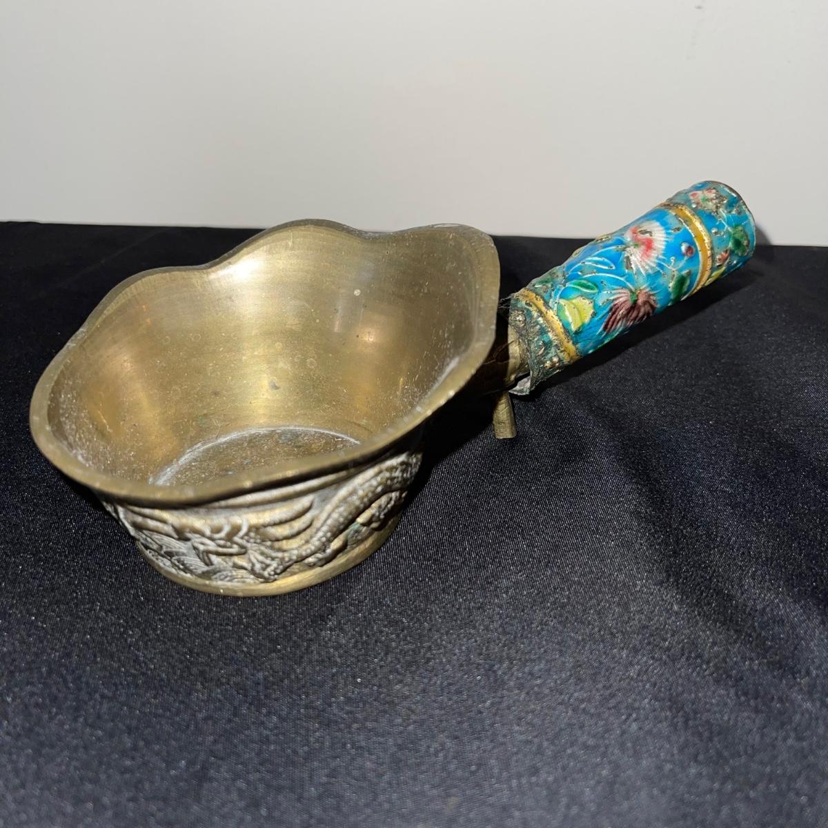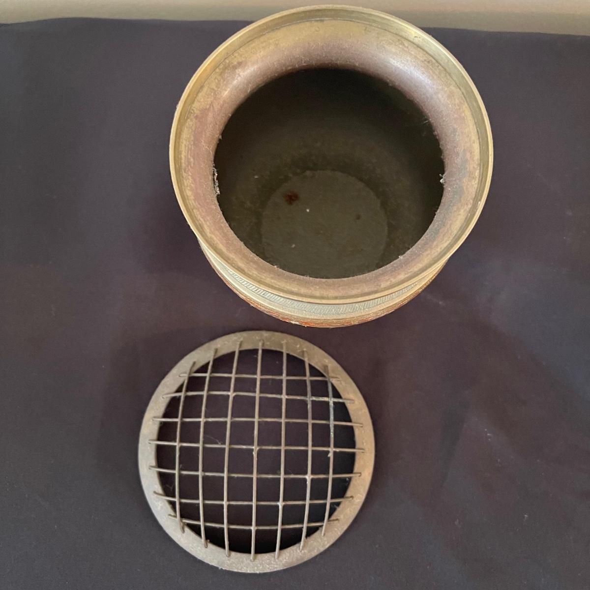 Items include a decorative bowl, a ceramic vase, a metal vase with flower stays on top, a small green and blue ceramic vase, and two brass basins with decorative handles. One handle has come off but could be glued back on to keep sturdy. Some items have signatures and some do not. The tall vase is about 9 inches tall.
