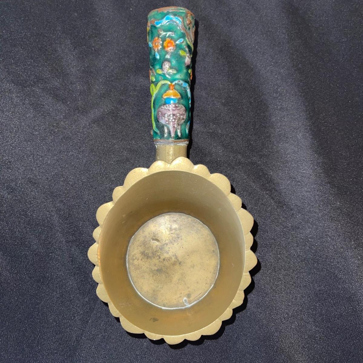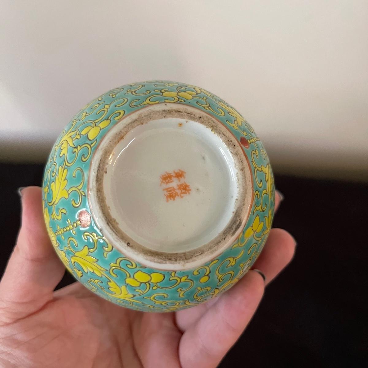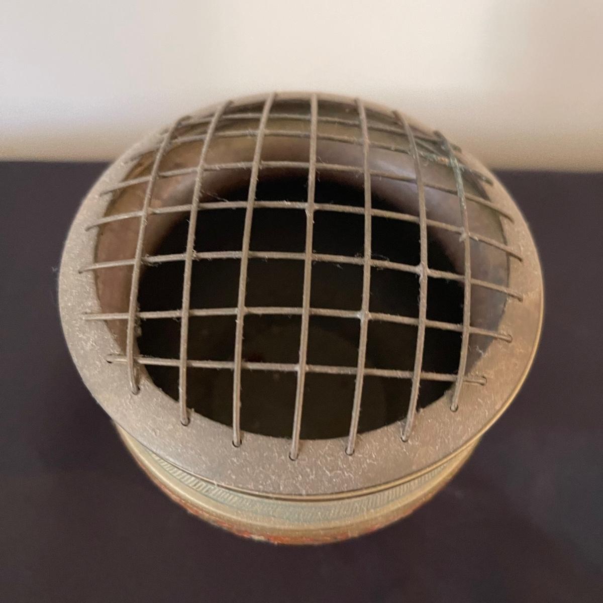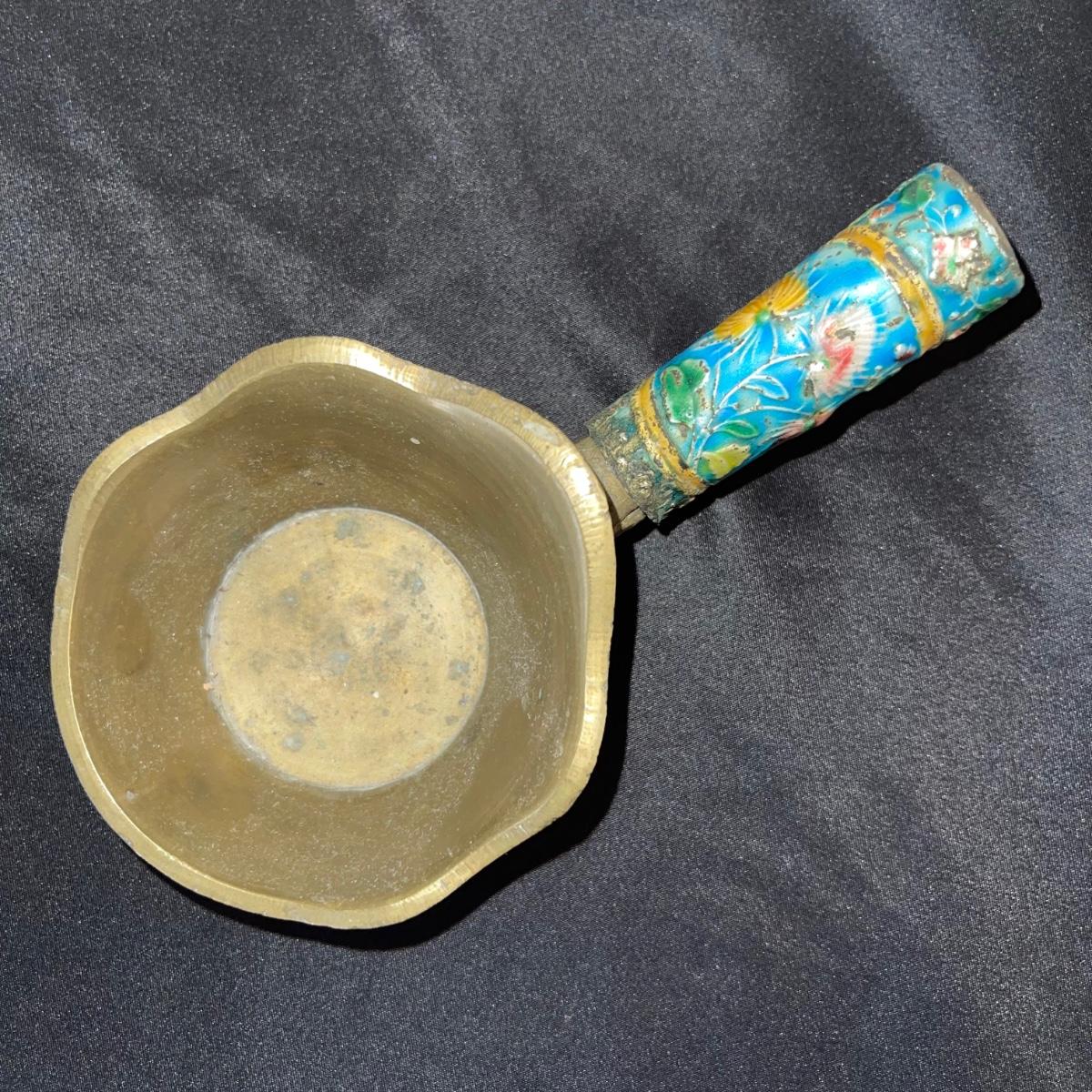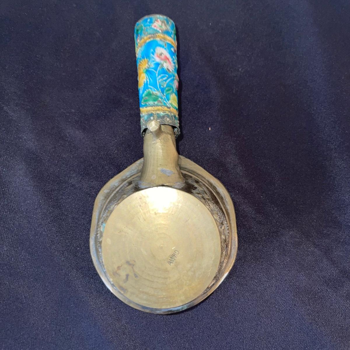 Items include a decorative bowl, a ceramic vase, a metal vase with flower stays on top, a small green and blue ceramic vase, and two brass basins with decorative handles. One handle has come off but could be glued back on to keep sturdy. Some items have signatures and some do not. The tall vase is about 9 inches tall.