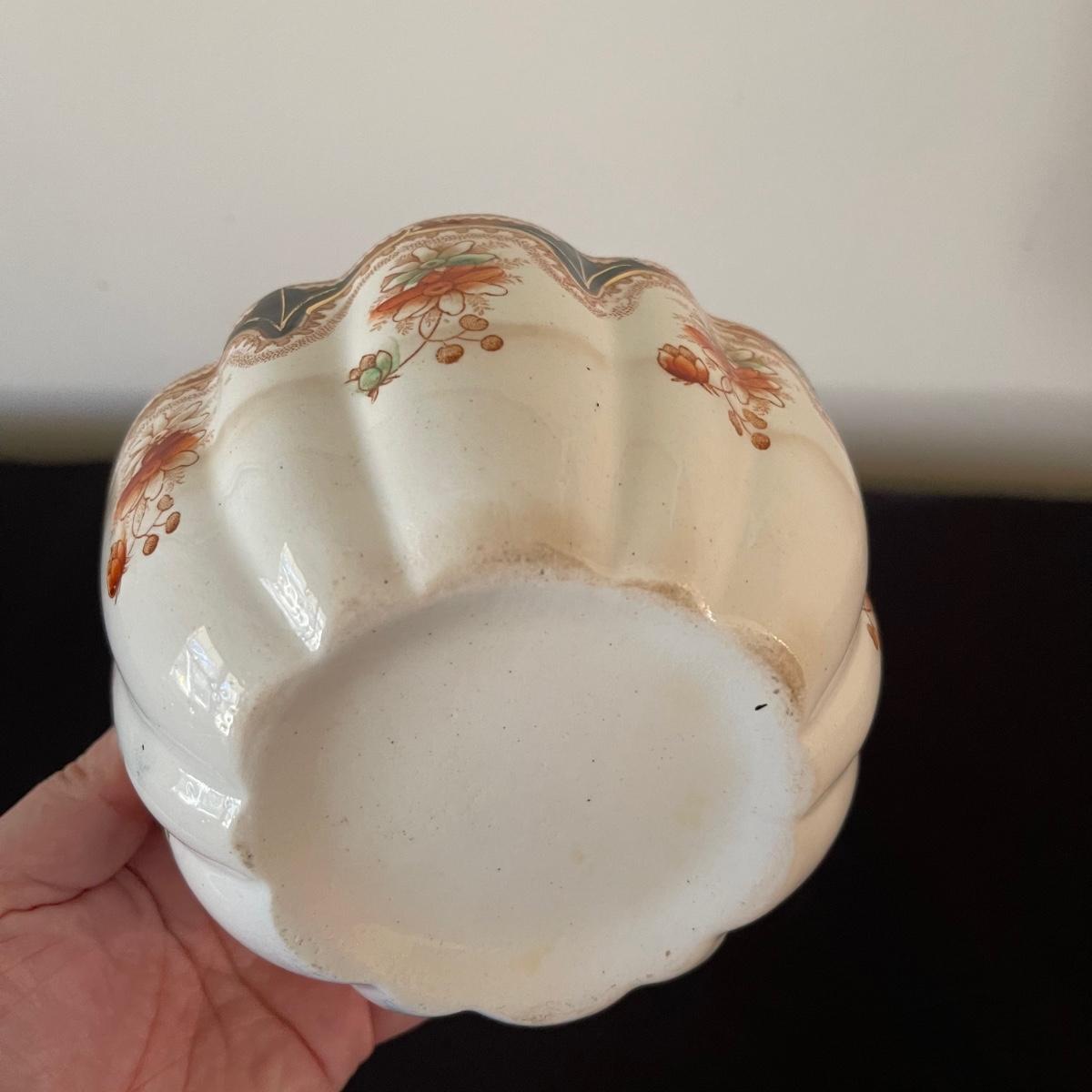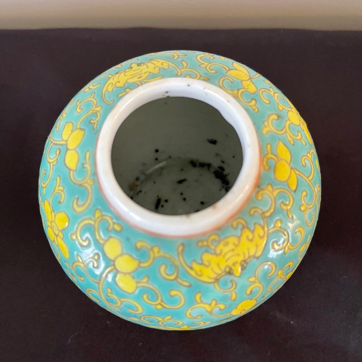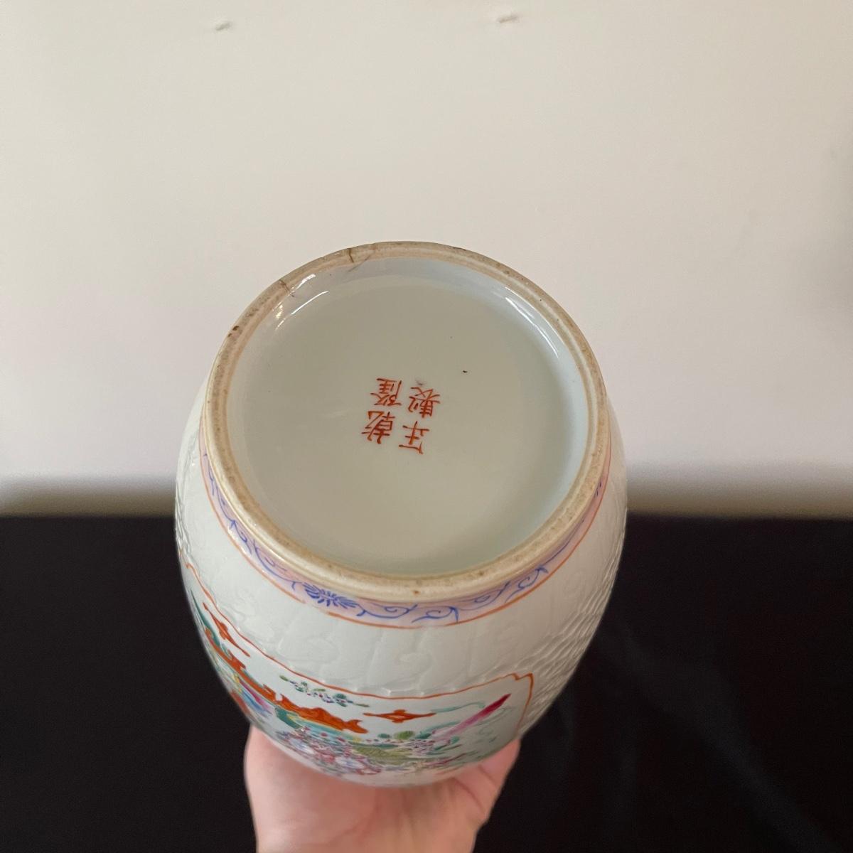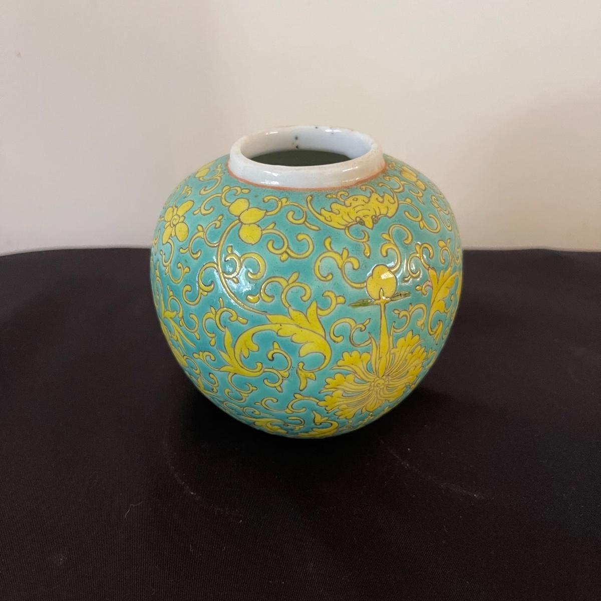 Items include a decorative bowl, a ceramic vase, a metal vase with flower stays on top, a small green and blue ceramic vase, and two brass basins with decorative handles. One handle has come off but could be glued back on to keep sturdy. Some items have signatures and some do not. The tall vase is about 9 inches tall.