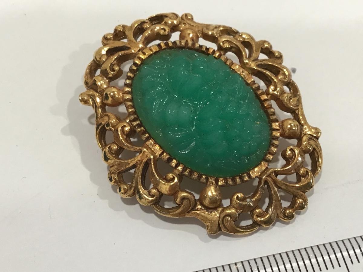 Asian oval Green Faux Glass Scroll Jade Brooch