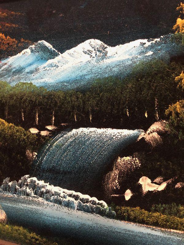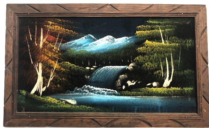 With an Asian motif featuring a central waterfall here is a framed 23 x 14" painting on velvet...