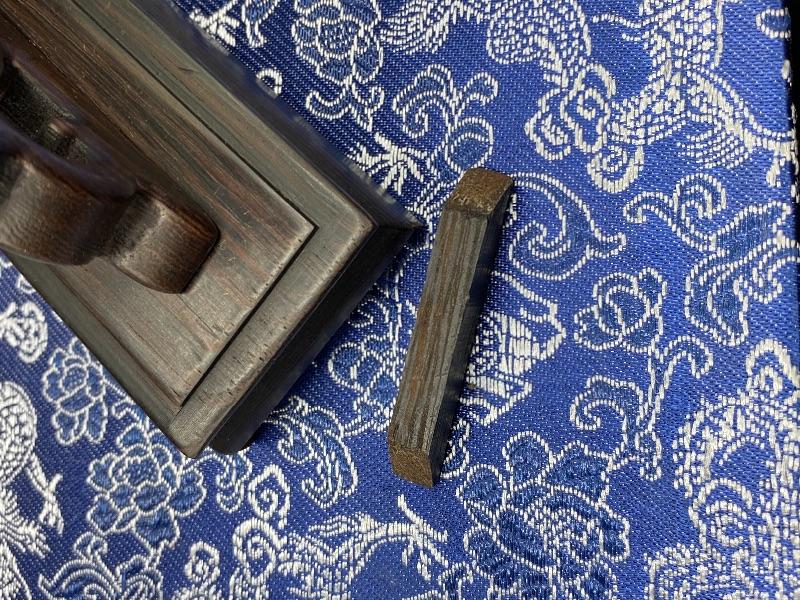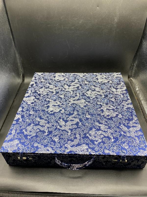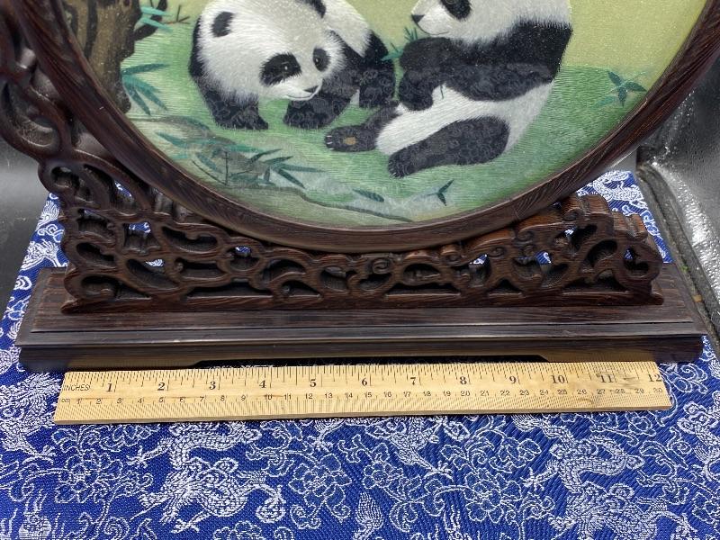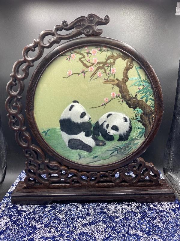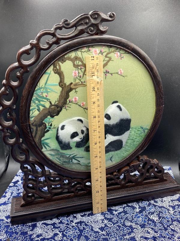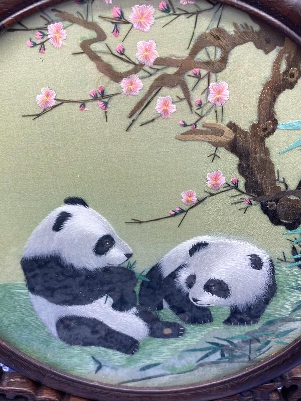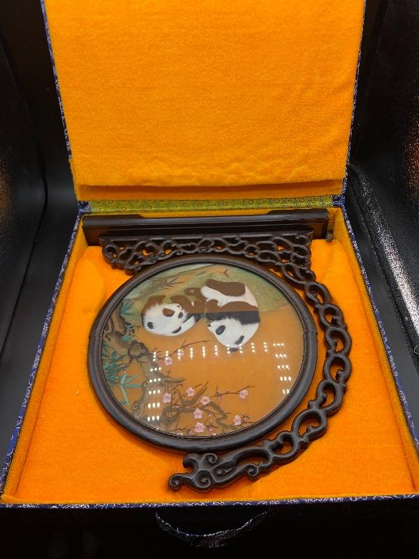 Beautiful embroidered Asian silk art. Set in a wood frame. Features a pair of panda bears and a tree with cherry blossoms. Beautifully done. Comes in original box. A small piece of wood from the base needs to be reglued. About 15" size.