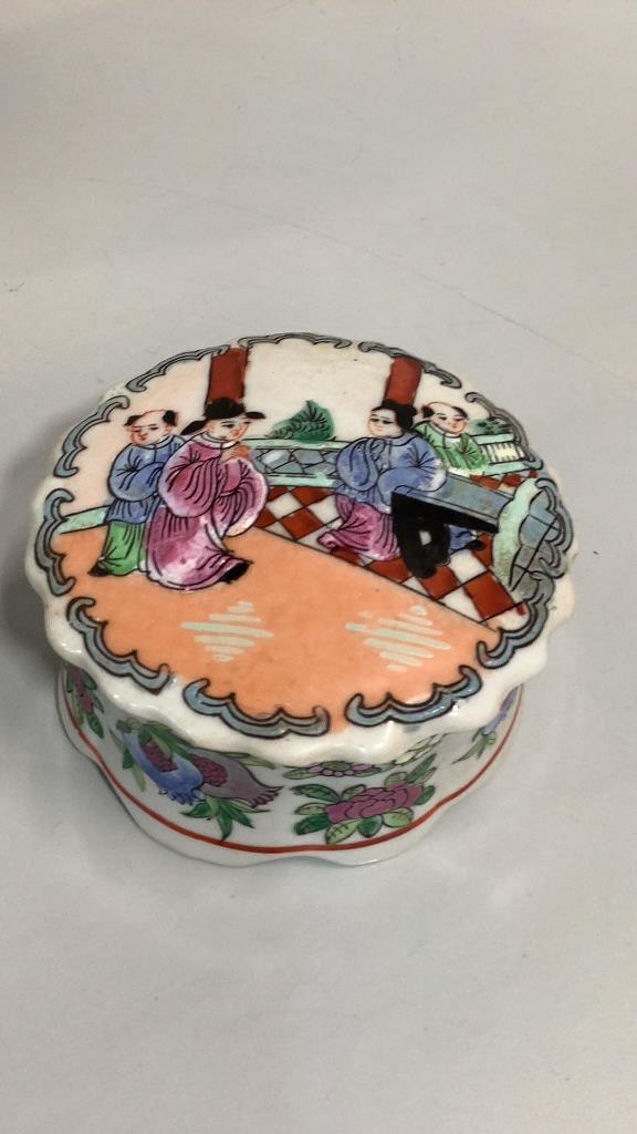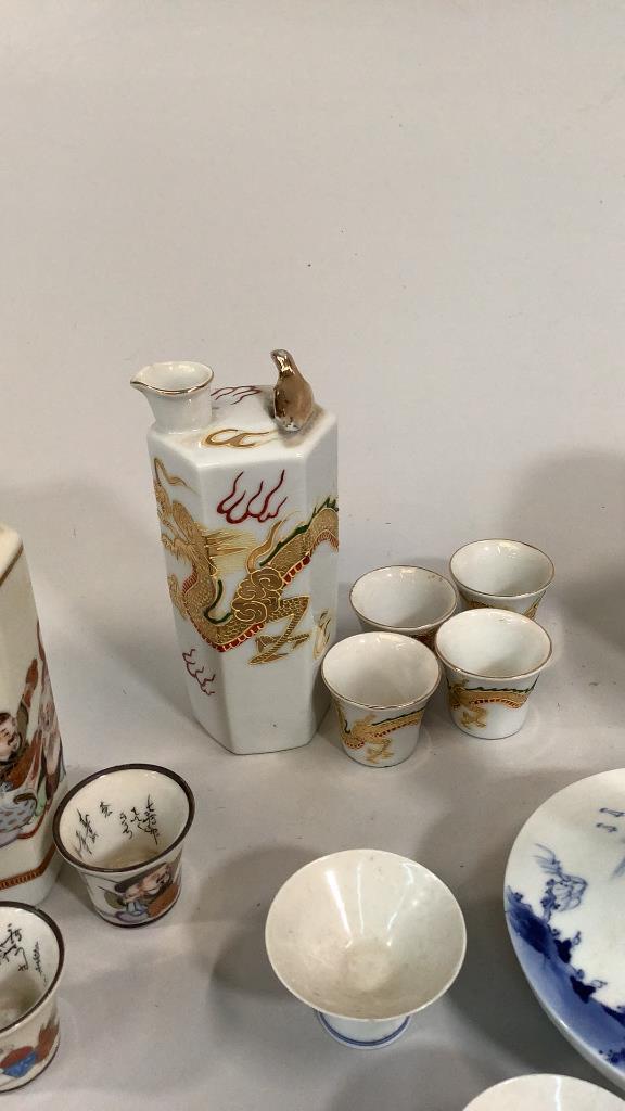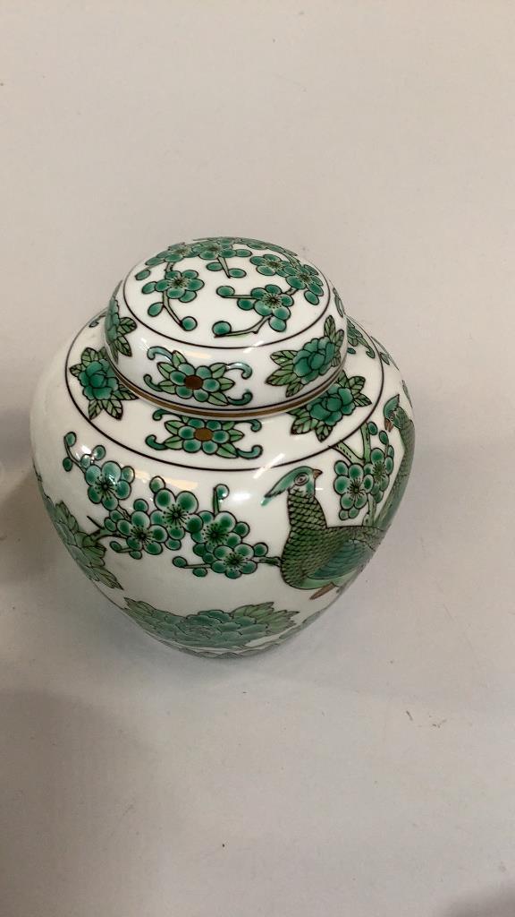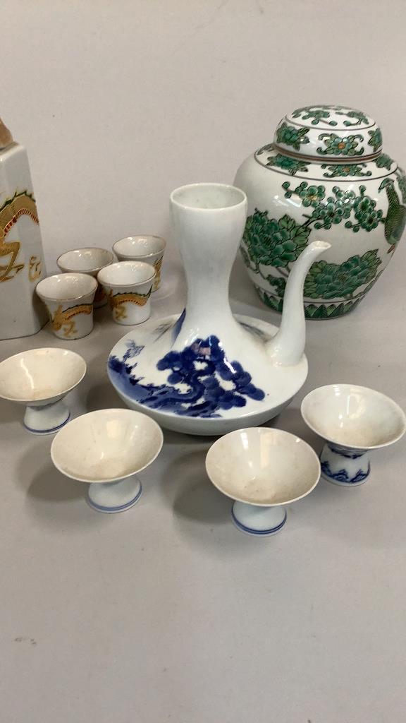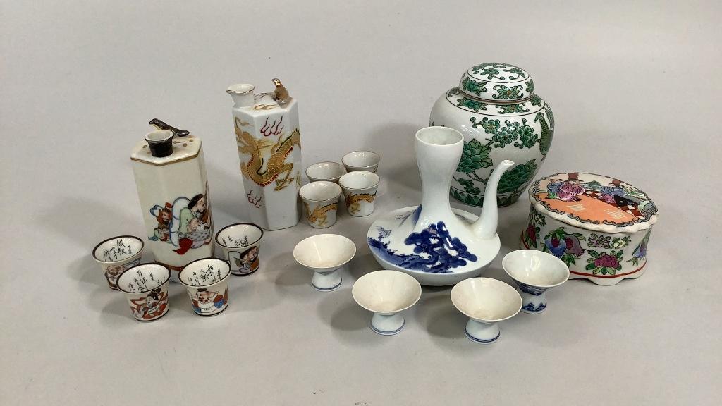 7 inch Gold Imari Ginger Jar with peacocksÂ…Saki Blue and White SetÂ…2 - 6 inch Saki Sets, Famille Lidded Jar..4 character mark in Red