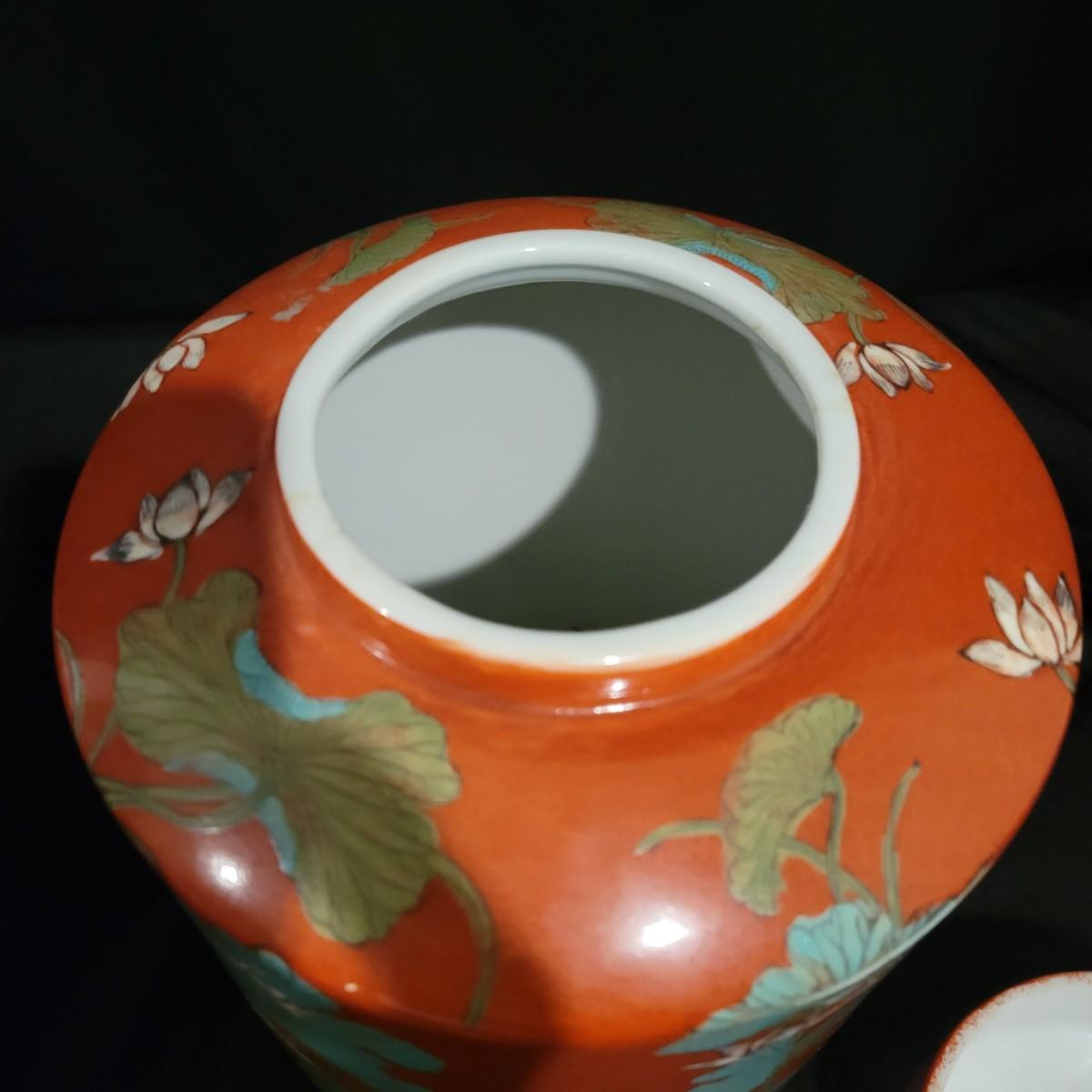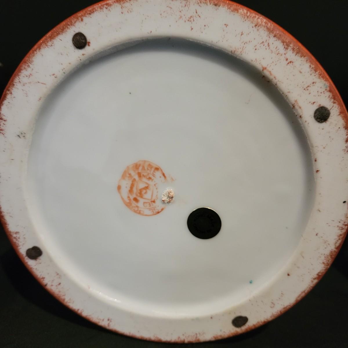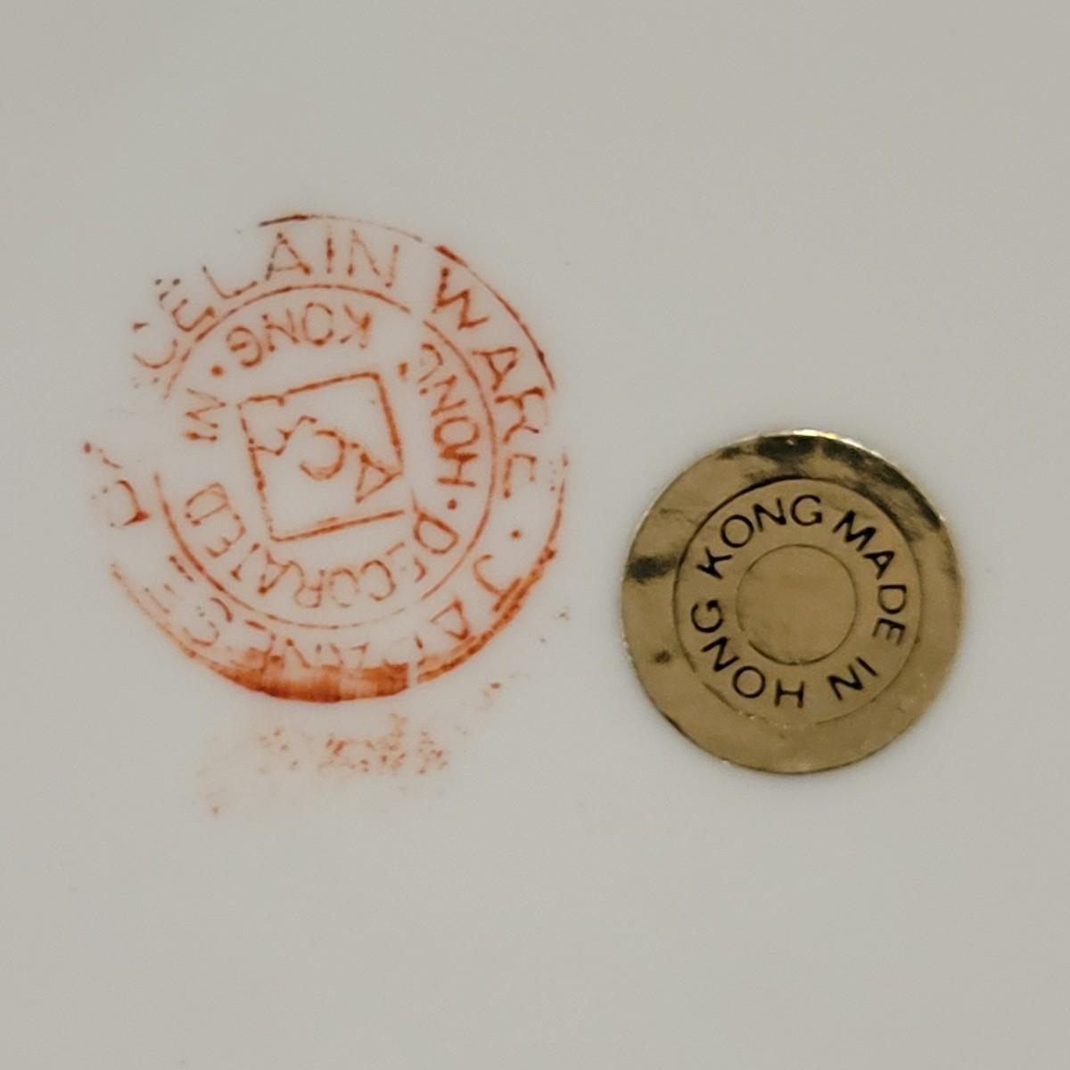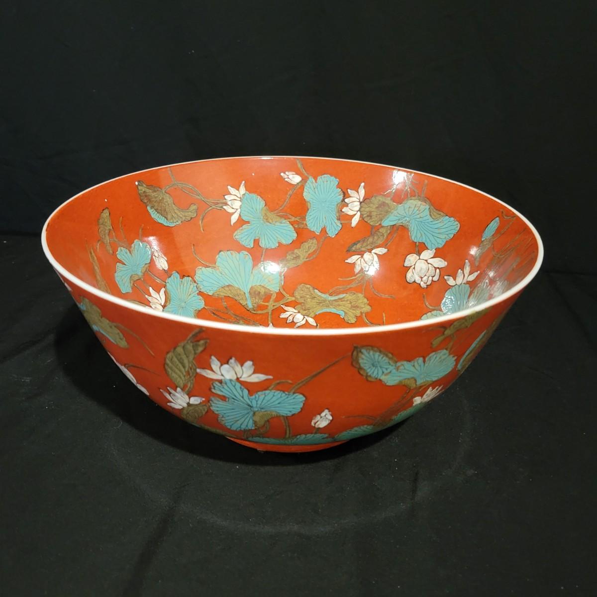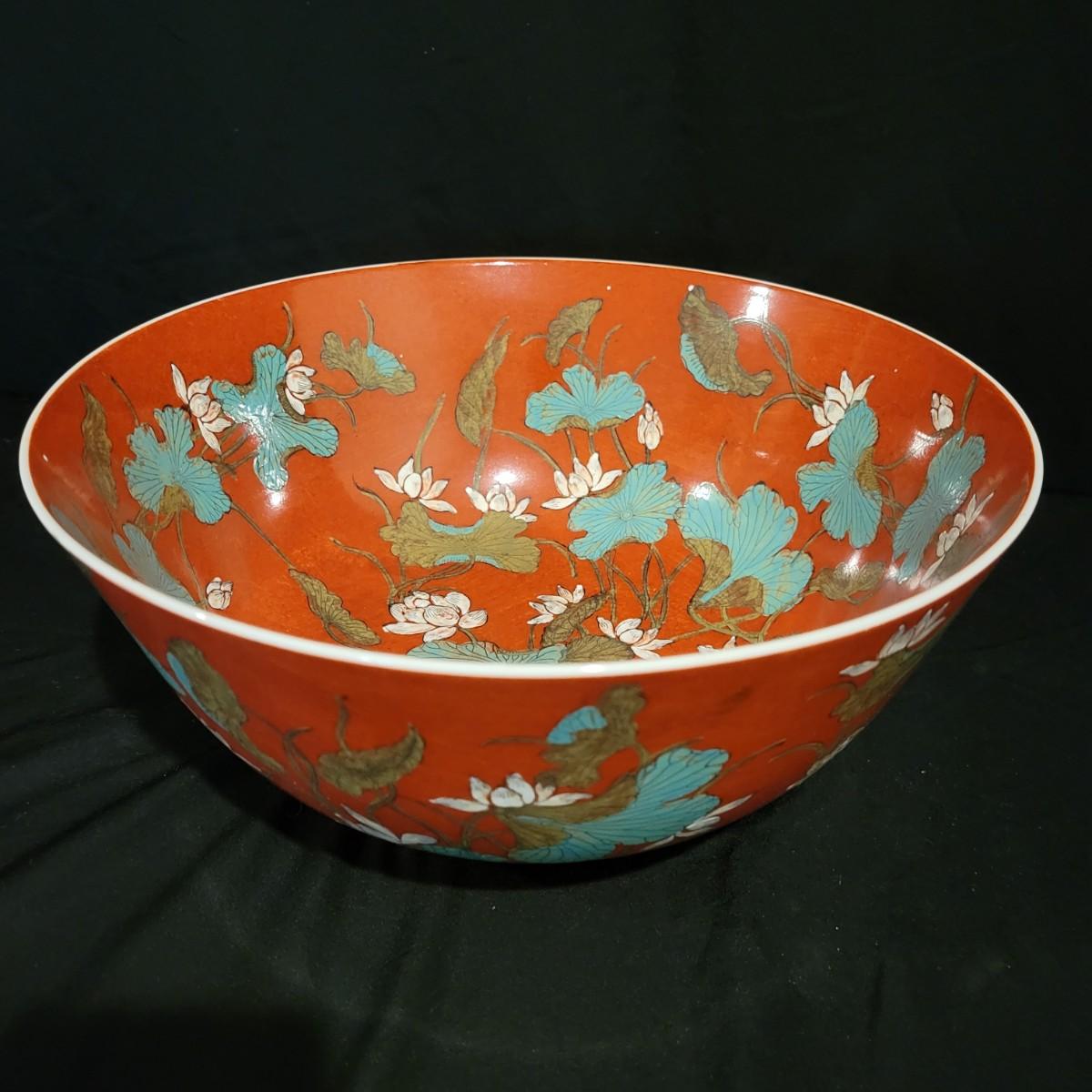 A porcelain bowl and lidded jar stamped "made in Hong Kong". They feature a rich, brick red glaze with a blue and white floral pattern. The bowl measures approximately 12"D x 5.5"H. Shipping available