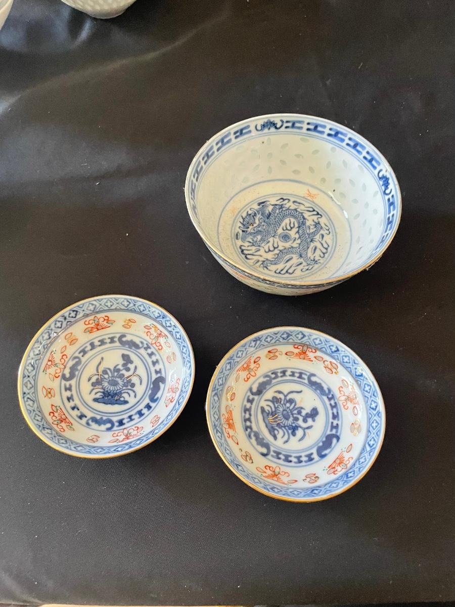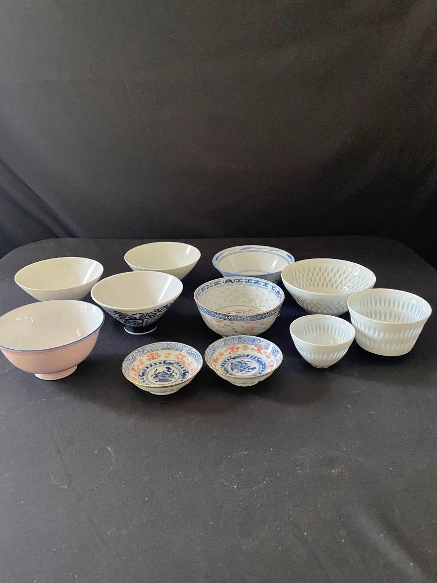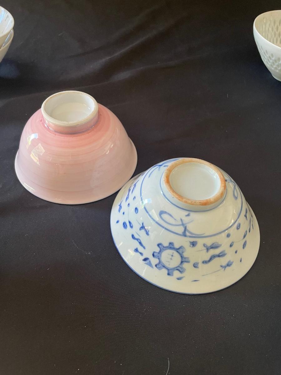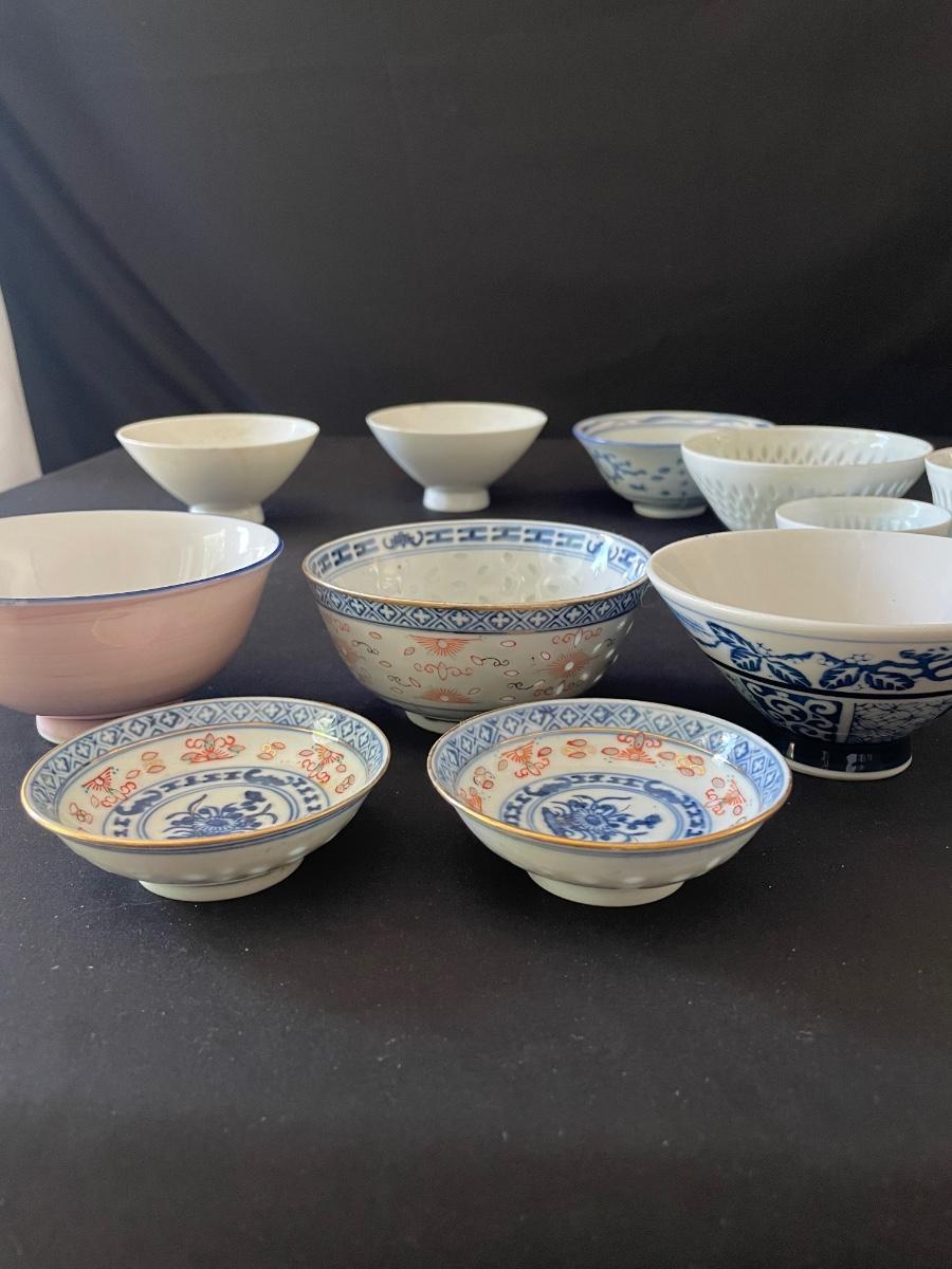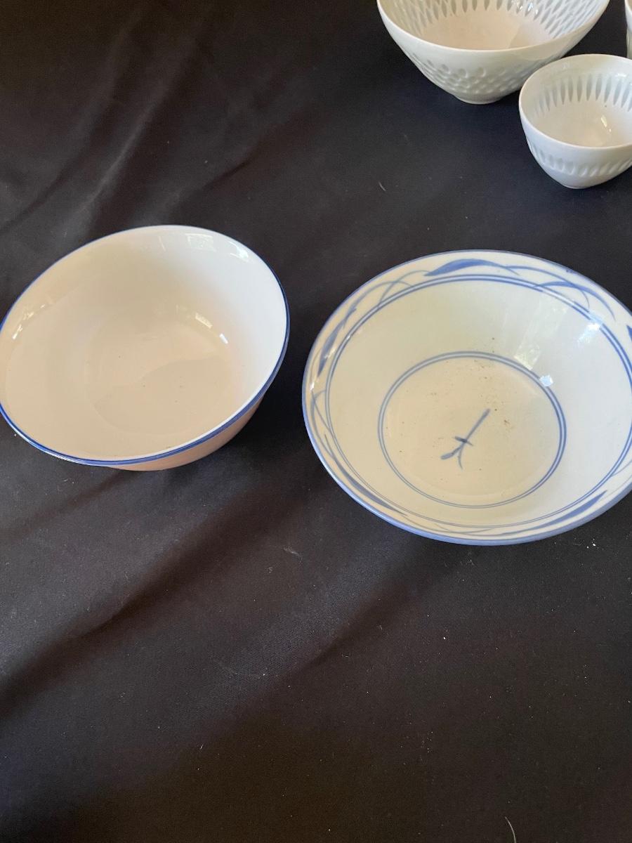 This lot includes 11 porcelain dishes and bowls. 2 small bowls do have artist signature, see image. Of the set of 3 different size bowls, the medium sized one has a small chip in the rim, all the rest are in good condition, but need cleaning.
