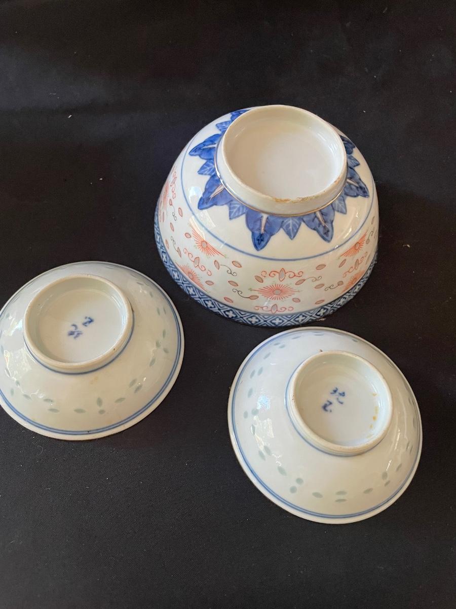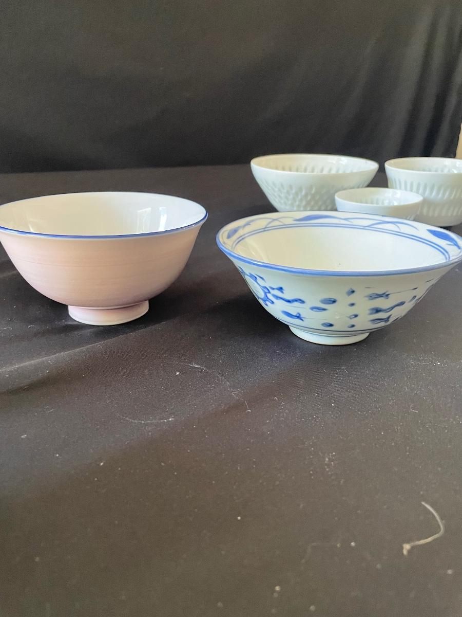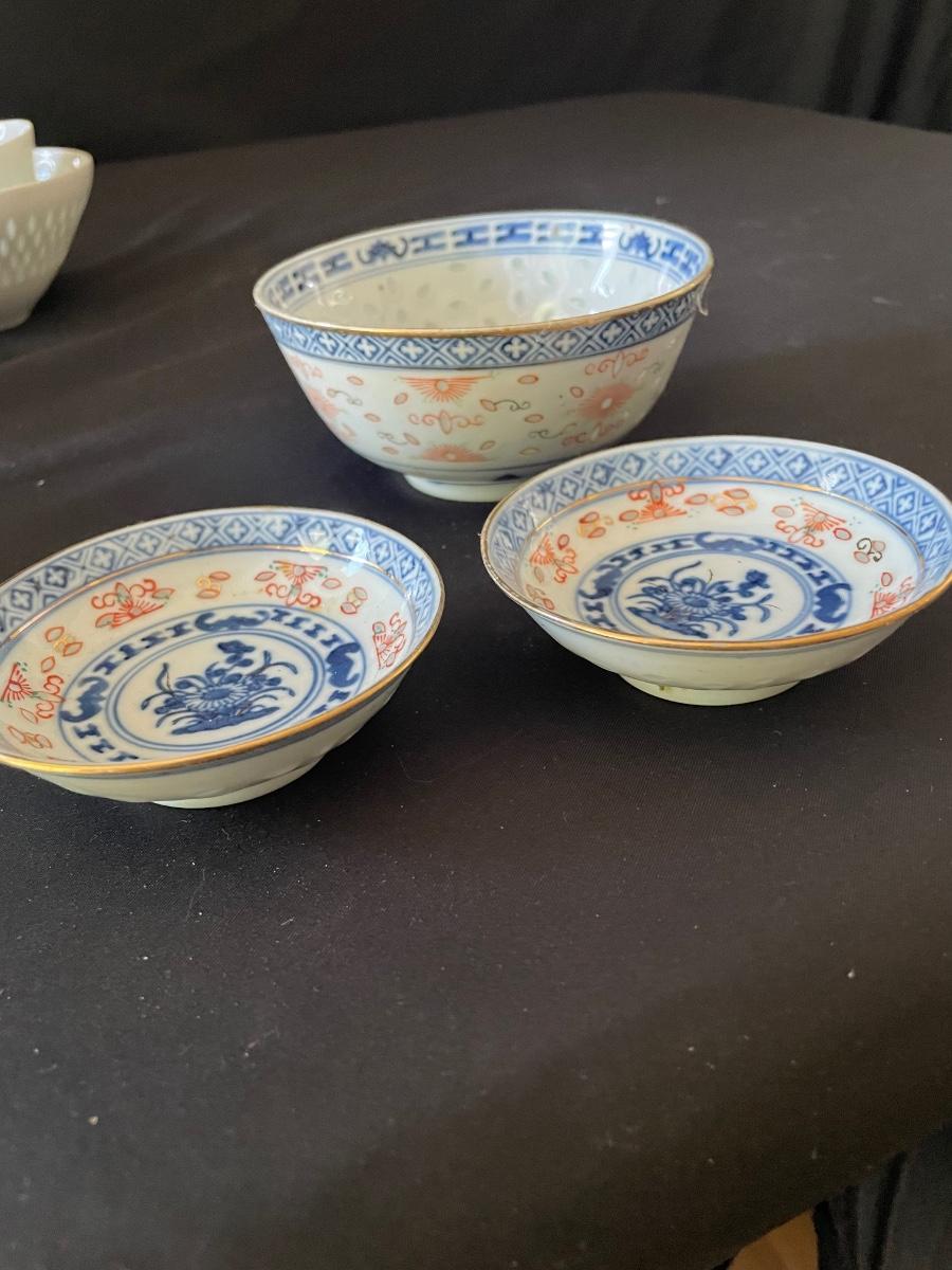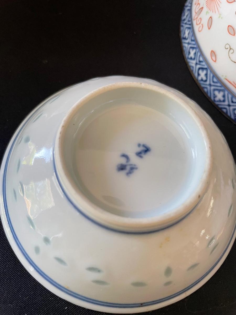 This lot includes 11 porcelain dishes and bowls. 2 small bowls do have artist signature, see image. Of the set of 3 different size bowls, the medium sized one has a small chip in the rim, all the rest are in good condition, but need cleaning.