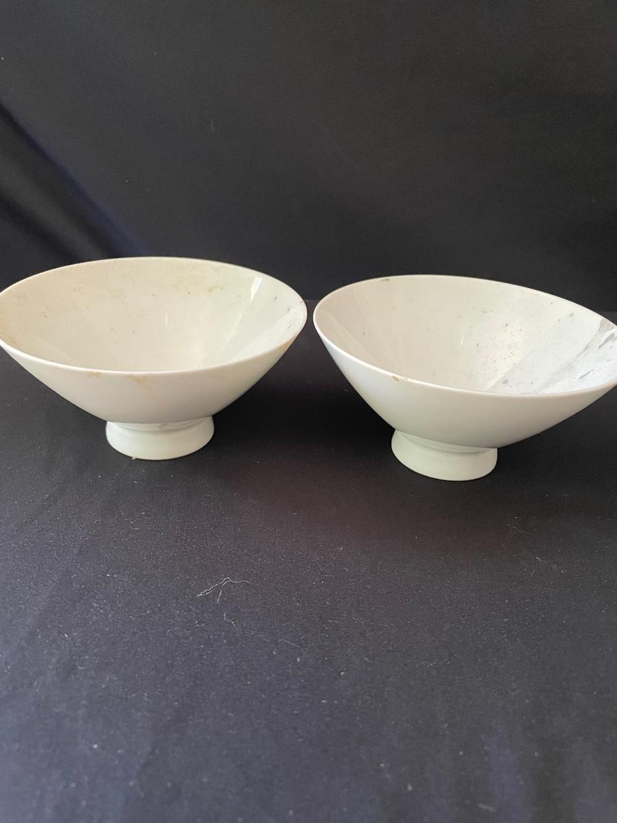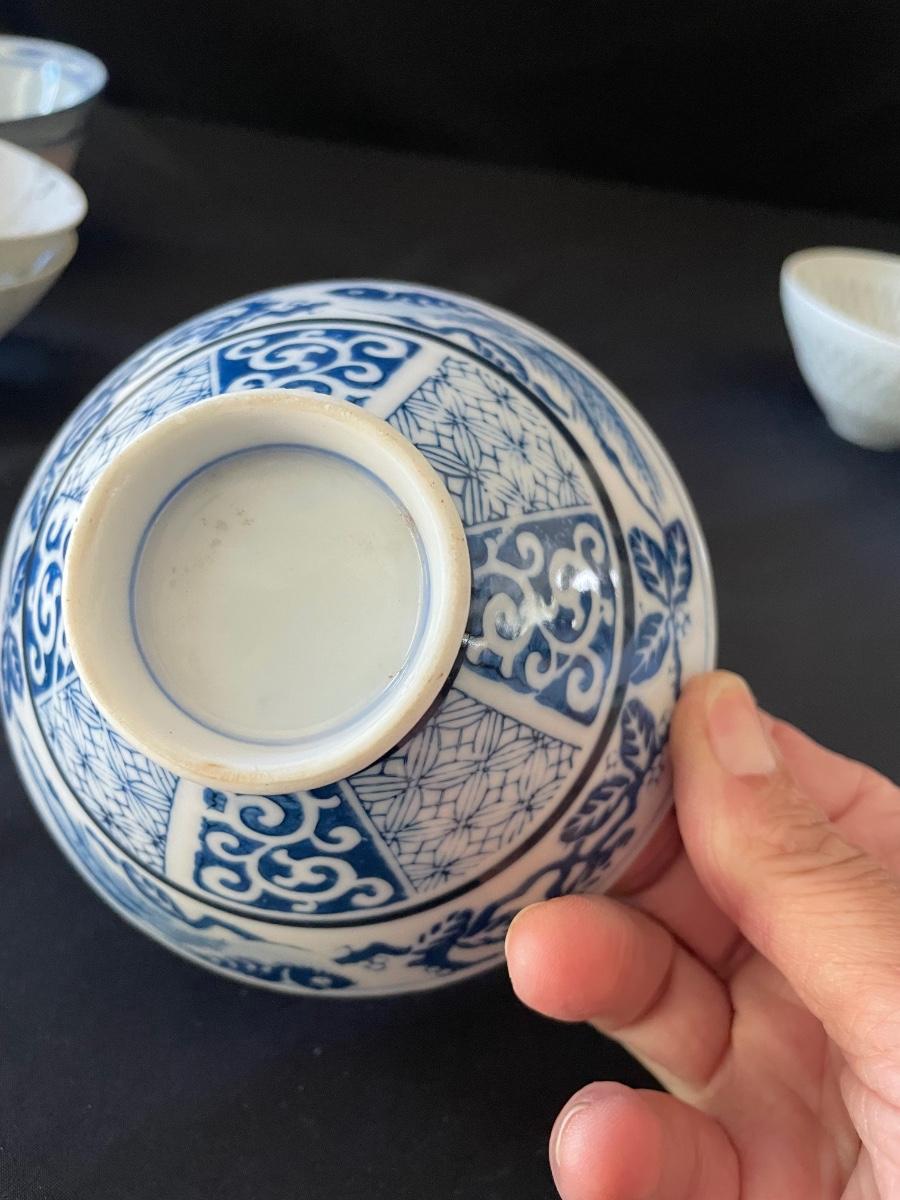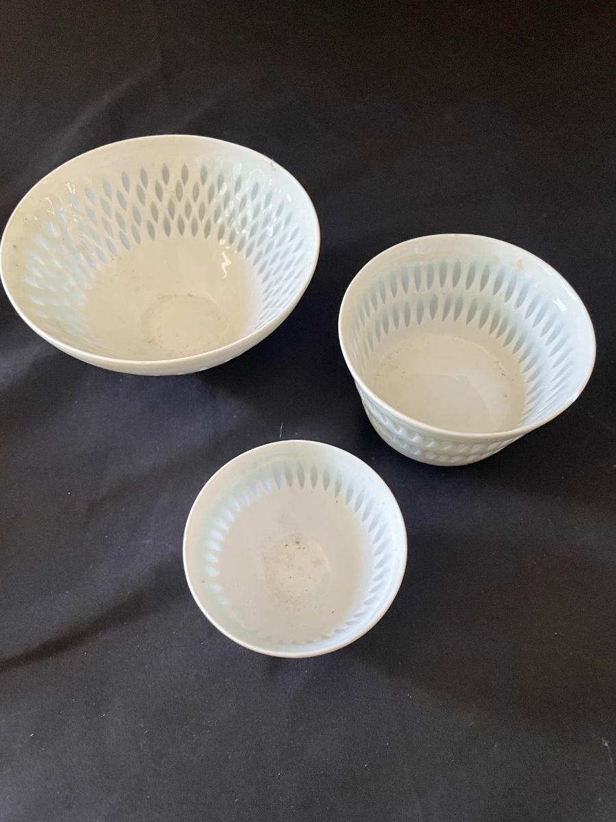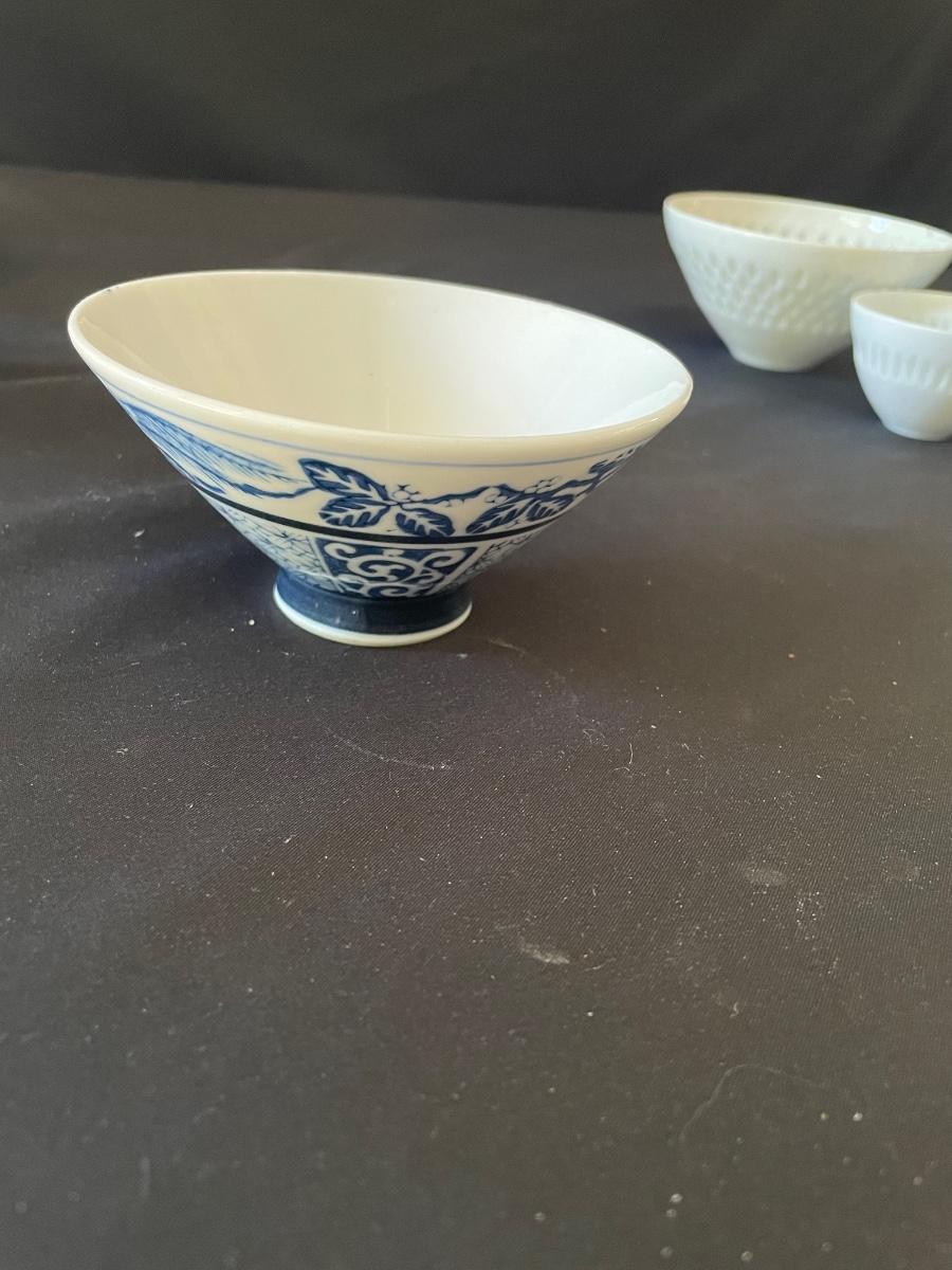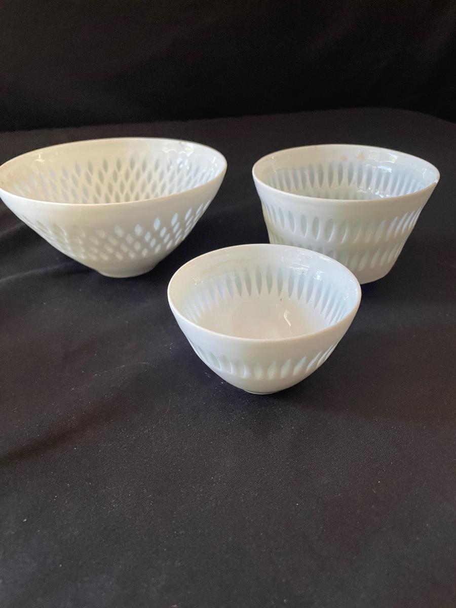 This lot includes 11 porcelain dishes and bowls. 2 small bowls do have artist signature, see image. Of the set of 3 different size bowls, the medium sized one has a small chip in the rim, all the rest are in good condition, but need cleaning.