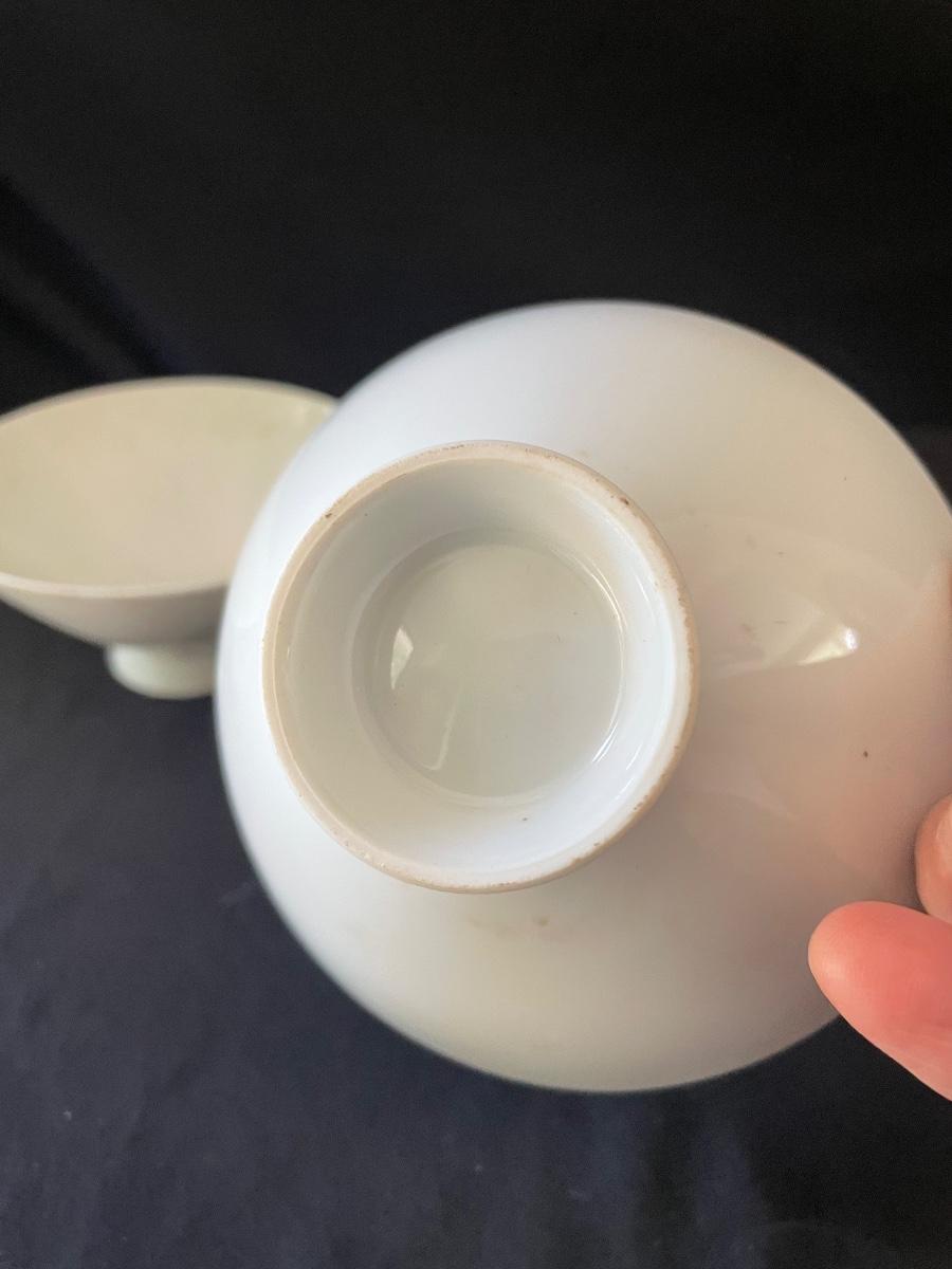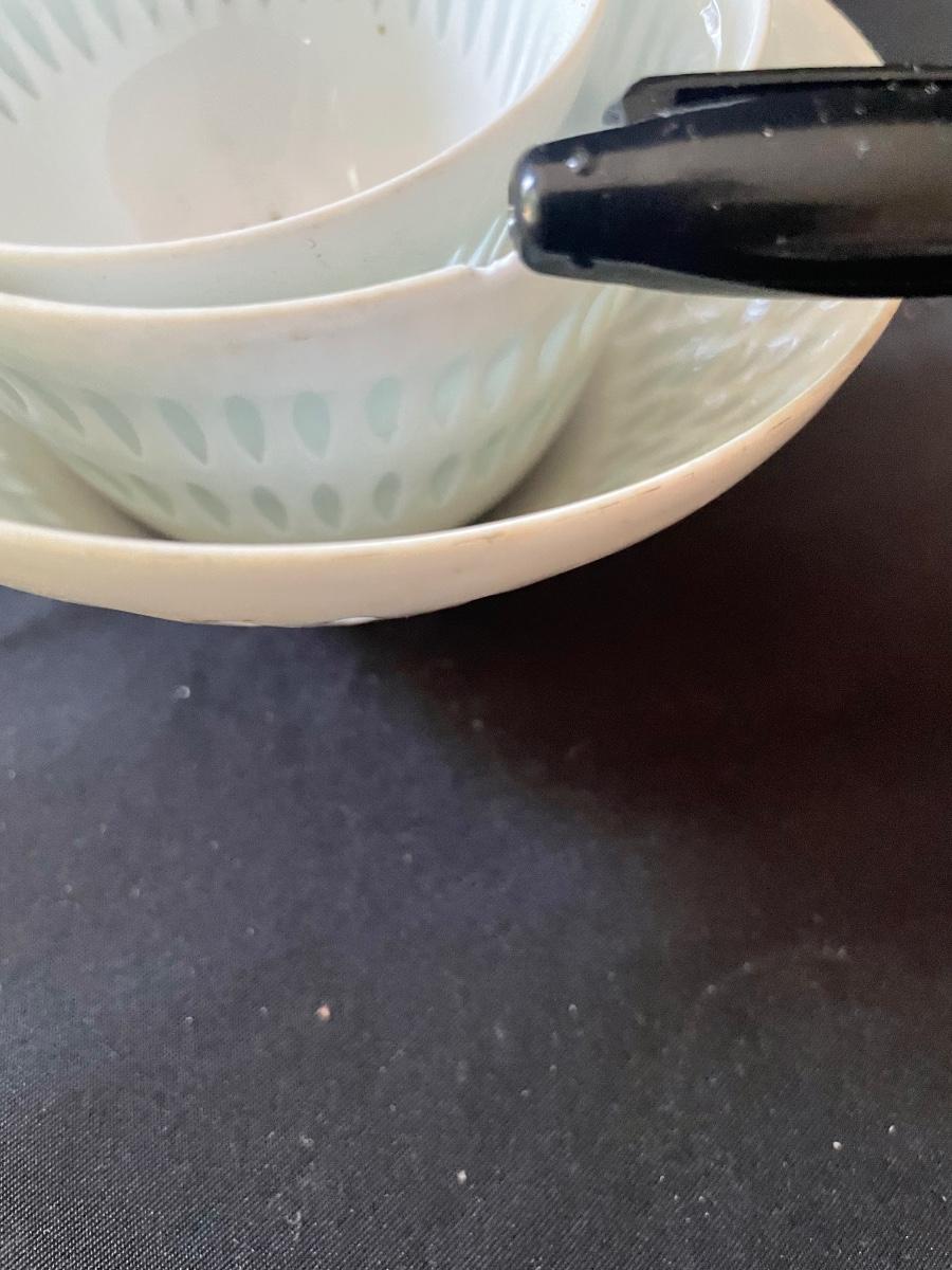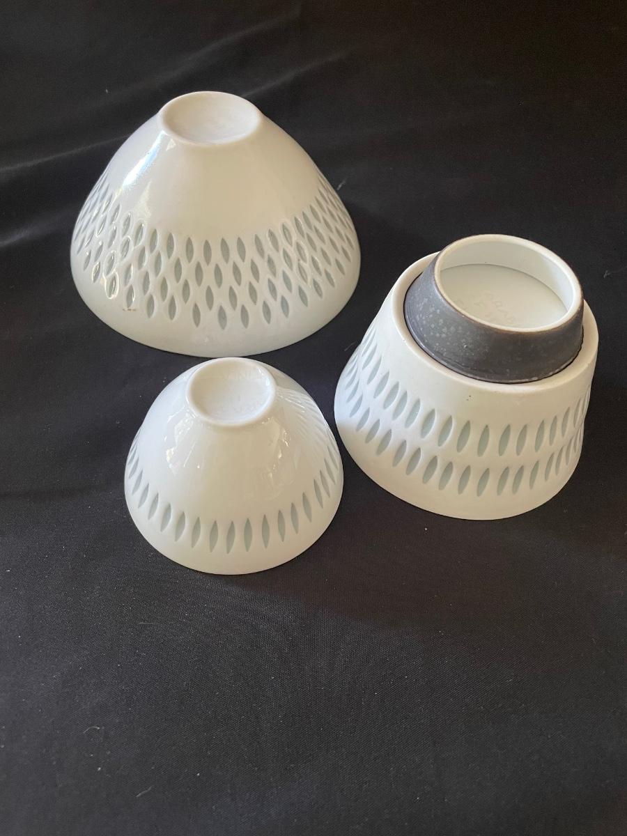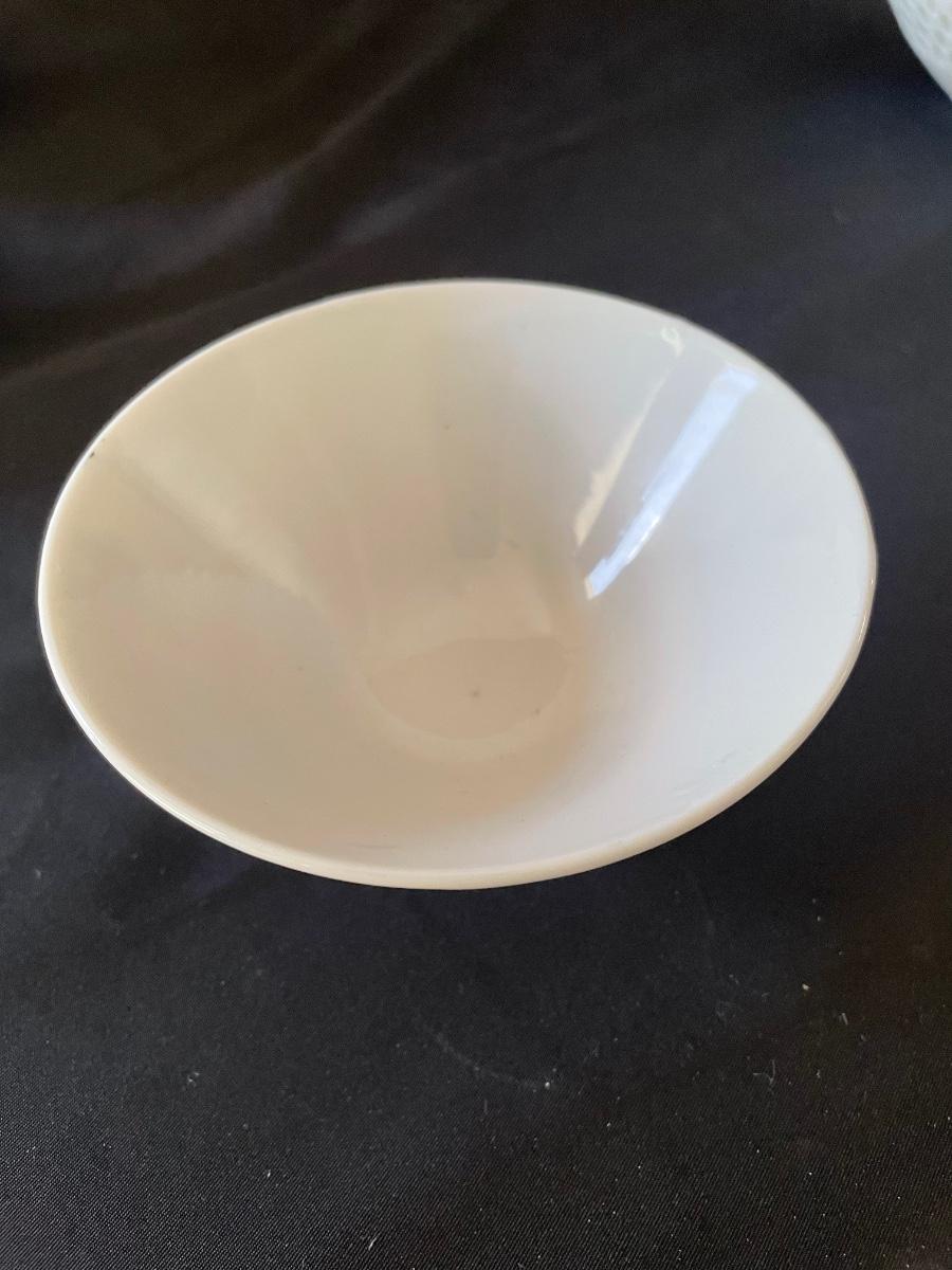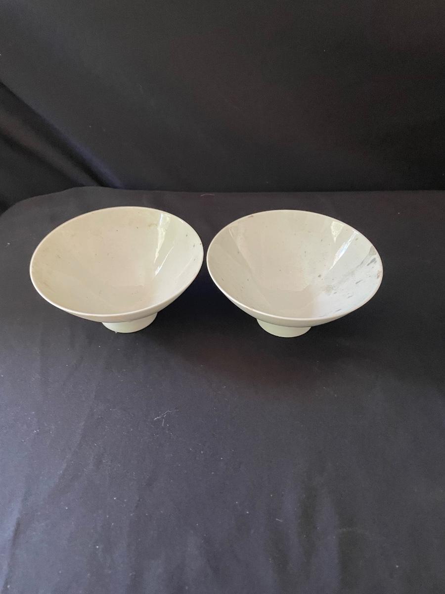 This lot includes 11 porcelain dishes and bowls. 2 small bowls do have artist signature, see image. Of the set of 3 different size bowls, the medium sized one has a small chip in the rim, all the rest are in good condition, but need cleaning.