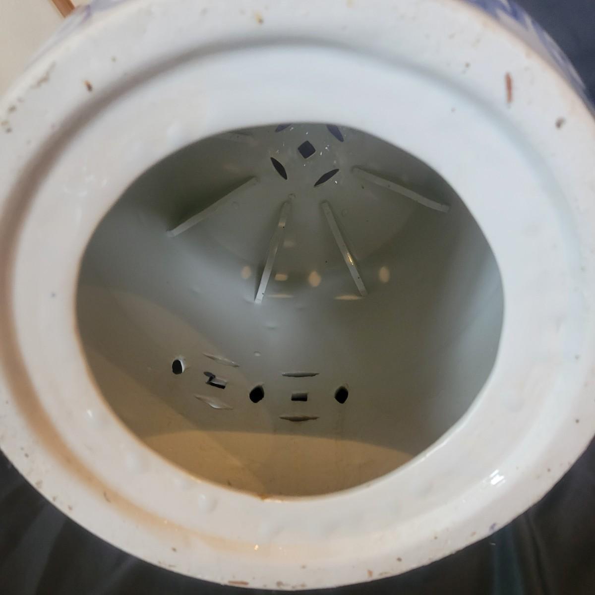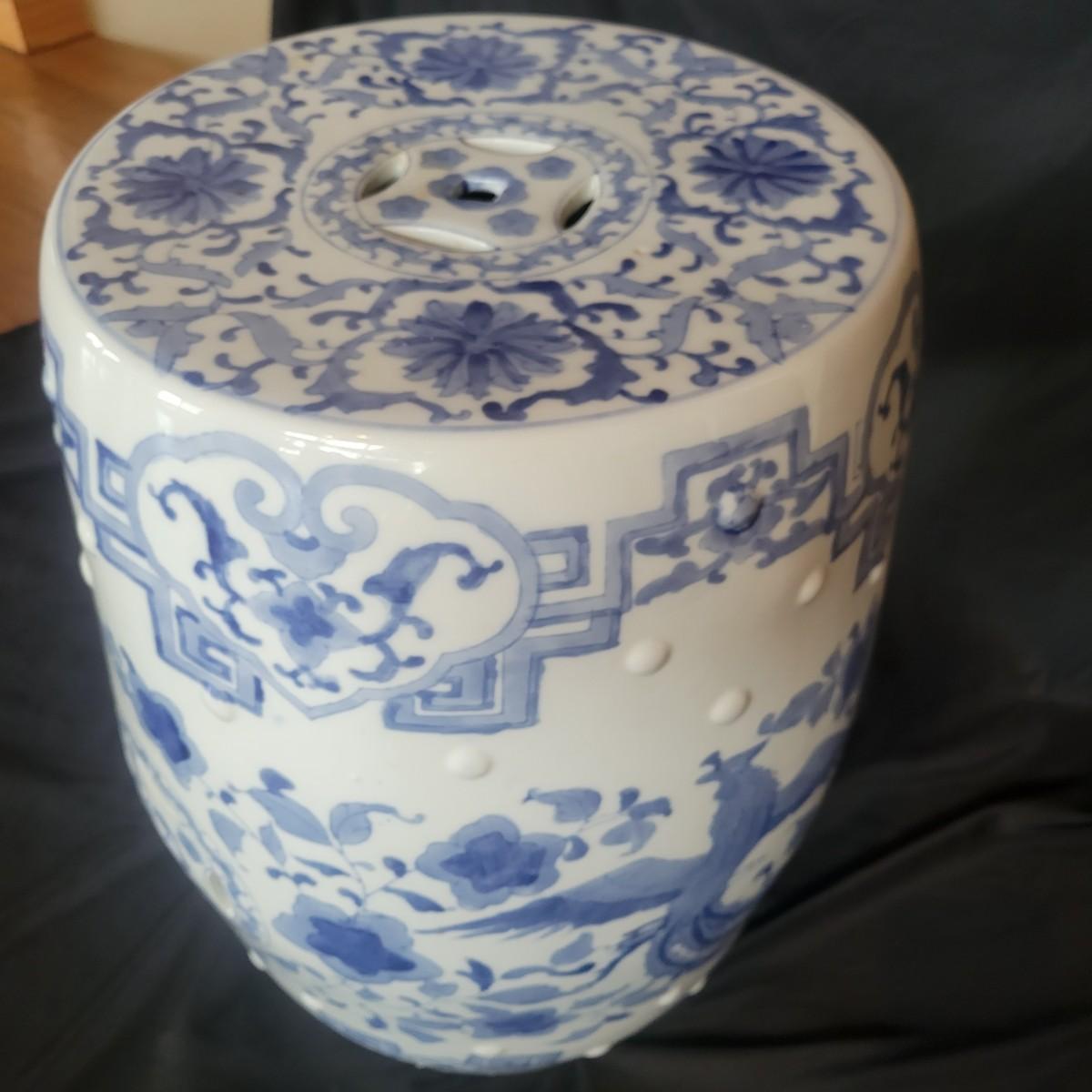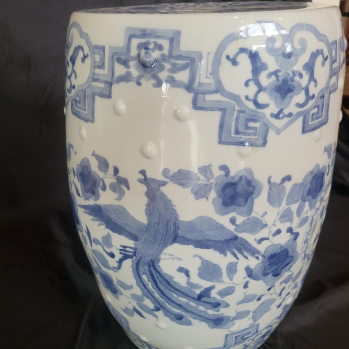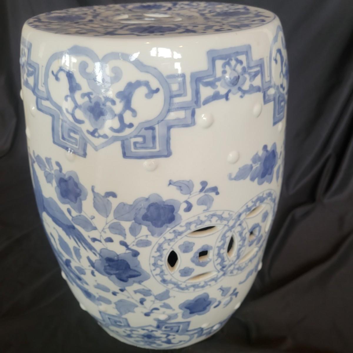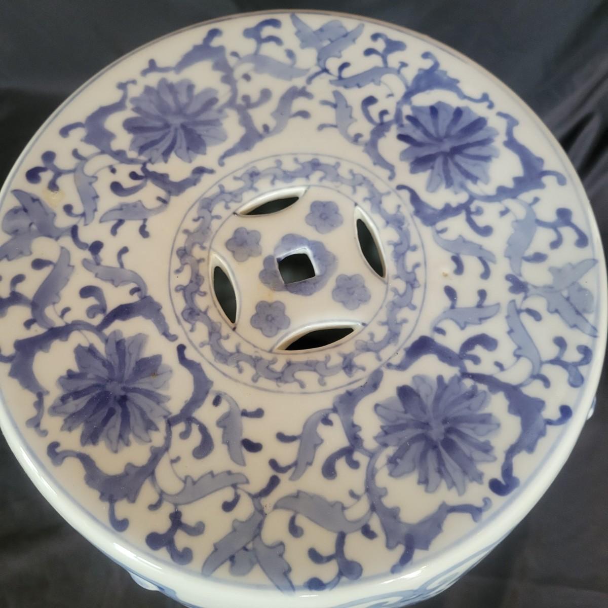 An Asian garden seat in good condition with no notable damage. This is a porcelain garden seat/ plant stand that features a floral and dragon motif in a pale blue color. Piece measures approximately 12" D x 18" H. Shipping available. Shipping can be costly. We suggest calling our local UPS with dimensions and getting an estimate before bidding: (828) 252-6930.