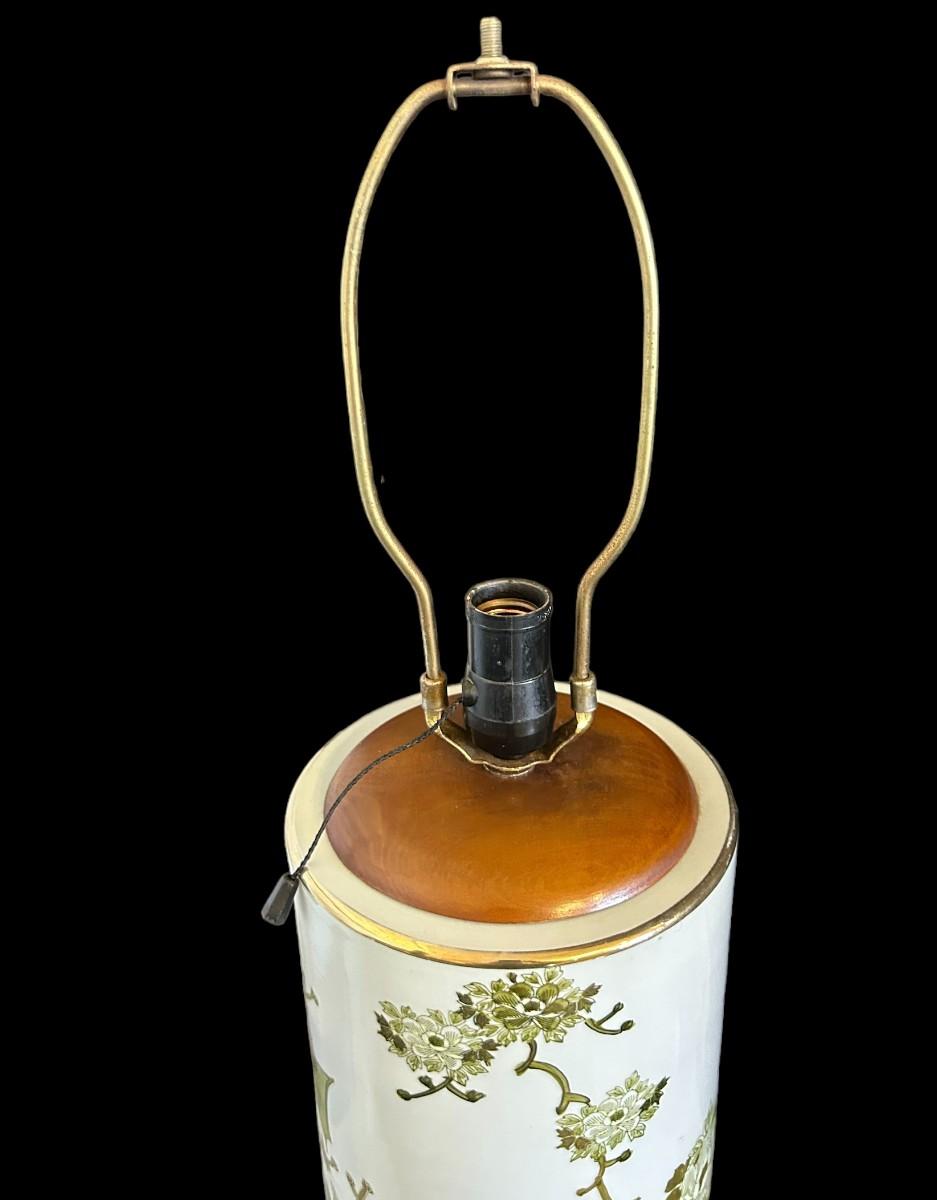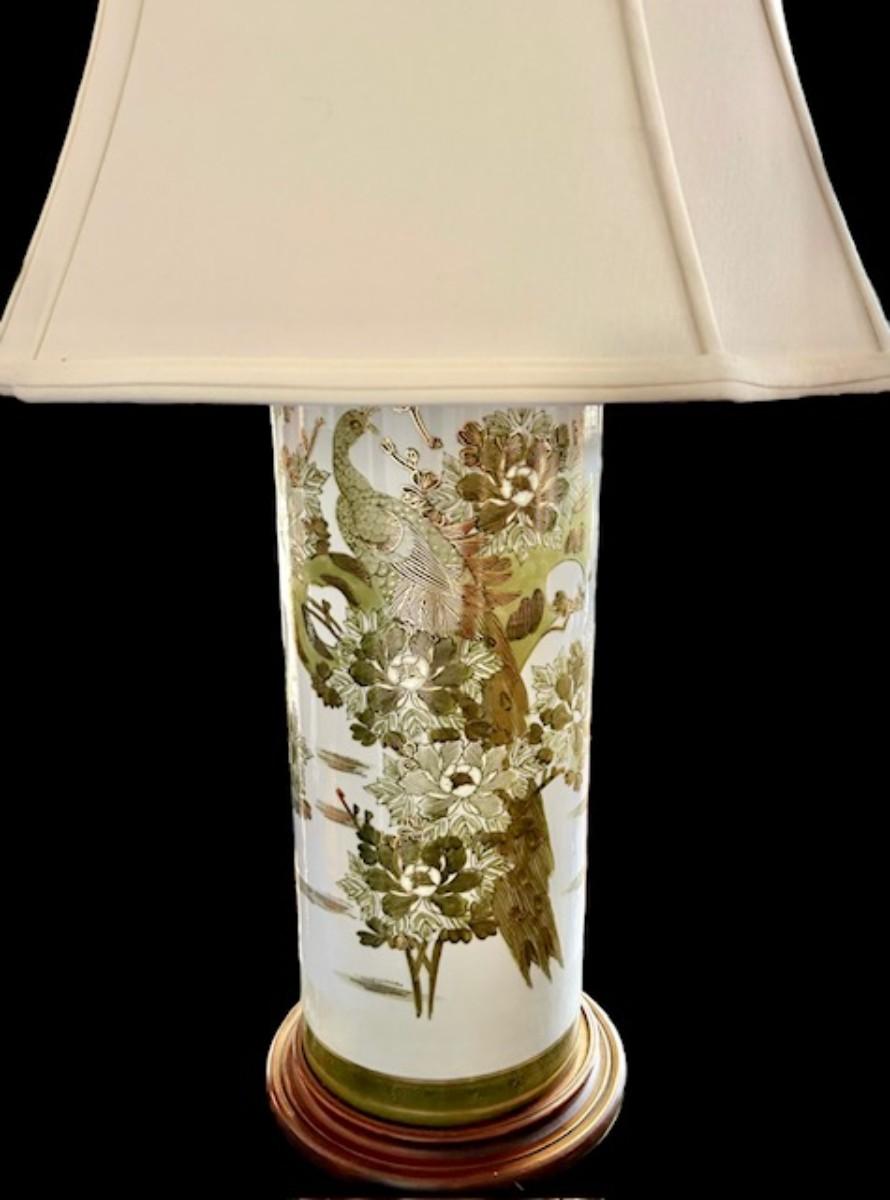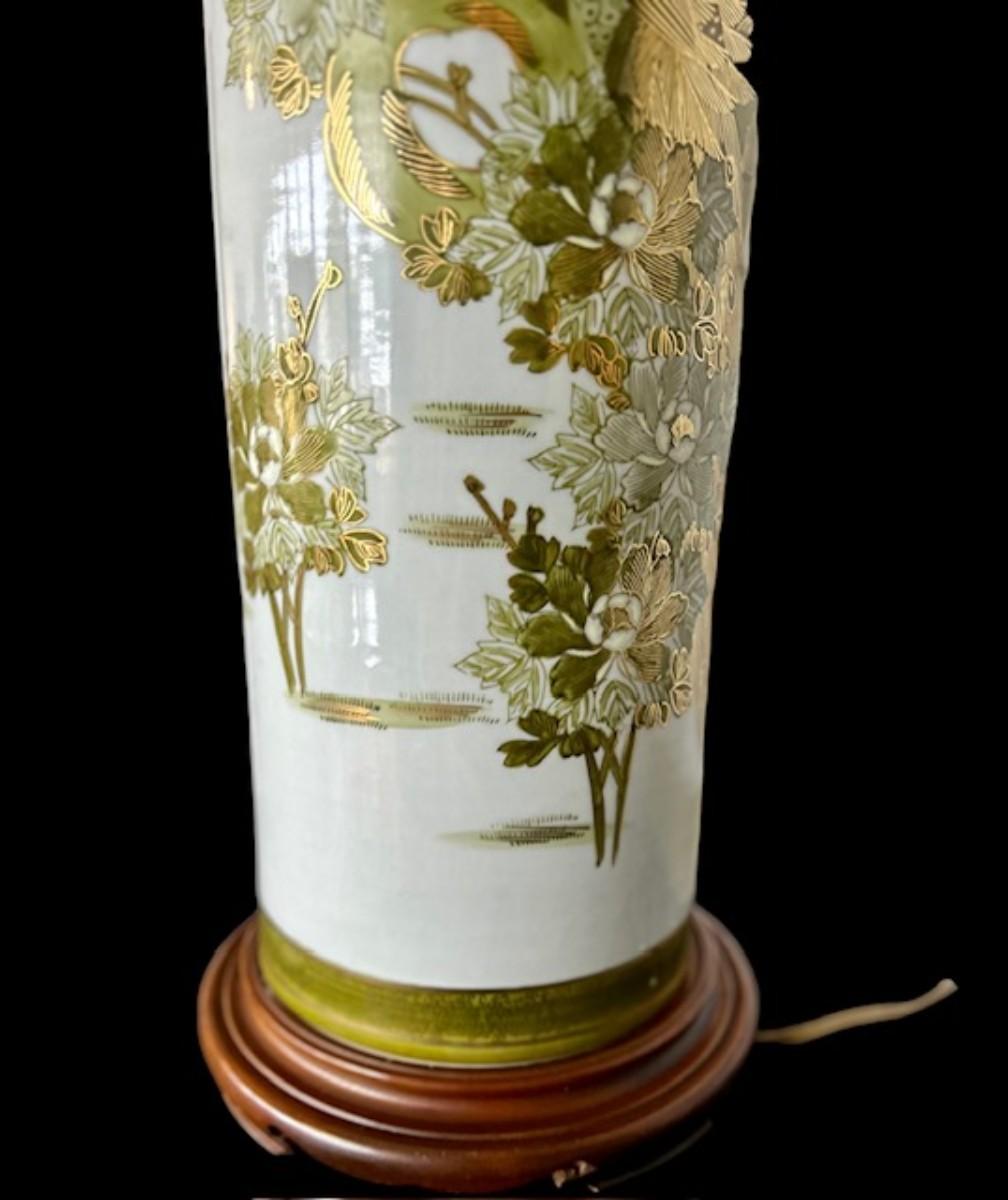 Vintage Large Asian Porcelain Lamp on Wooden Base with Custom Silk Shade. Excellent Condition.