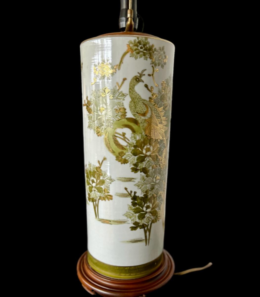 Vintage Asian Porcelain Lamp on Wooden Base with Custom Silk Shade