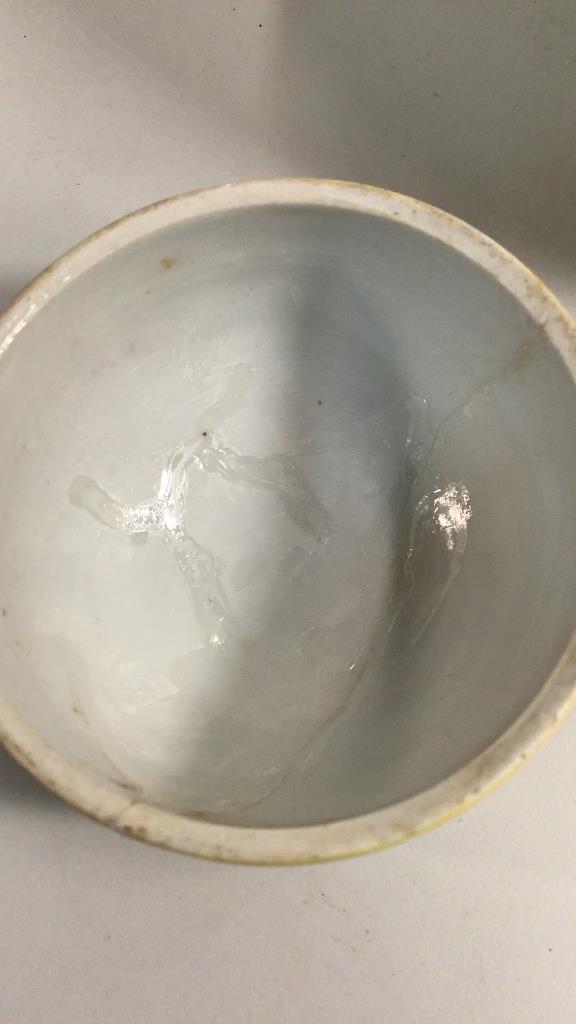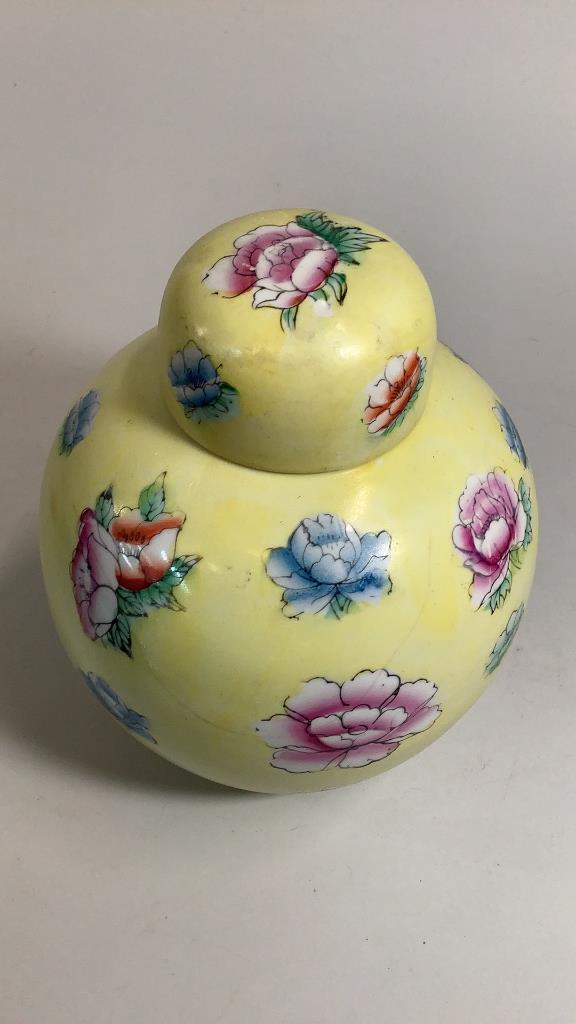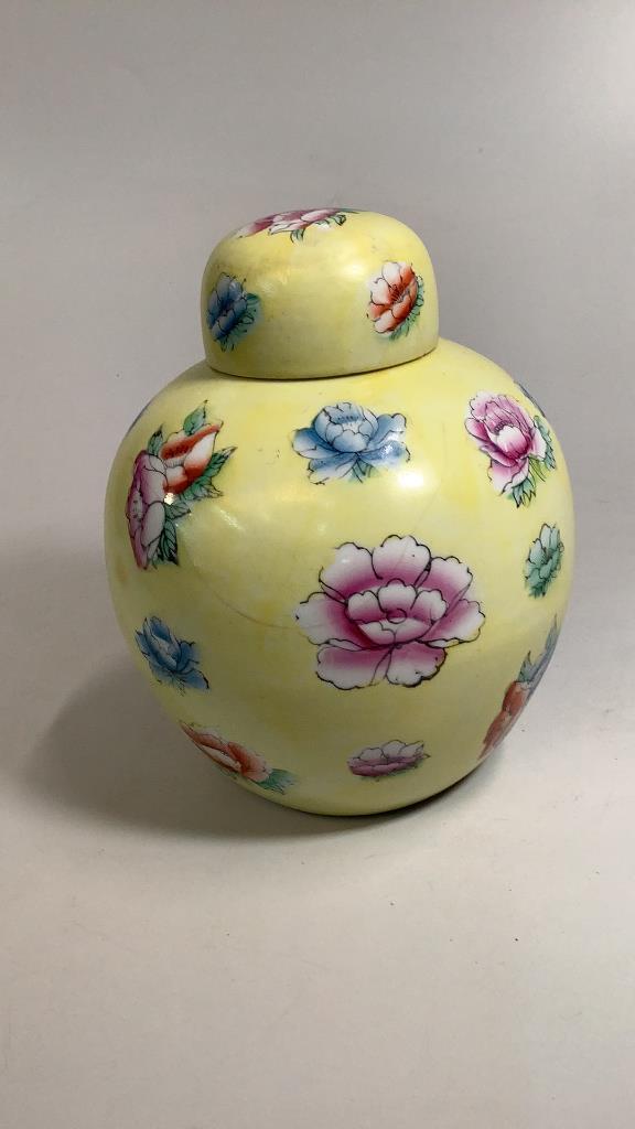 10.5 inch jar in traditional formÂ…yellow ground with multi color floralÂ…* repair to lid #72