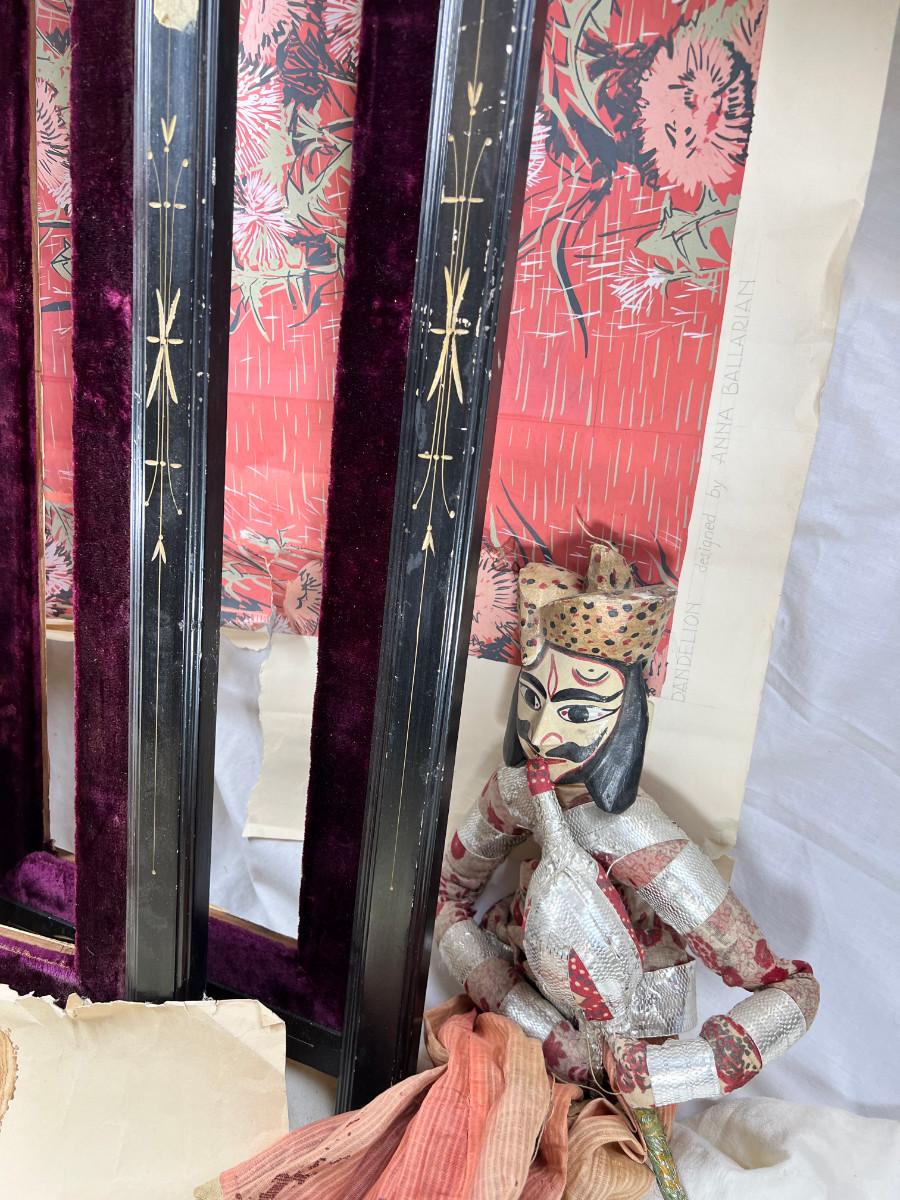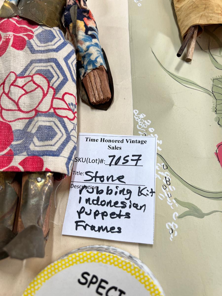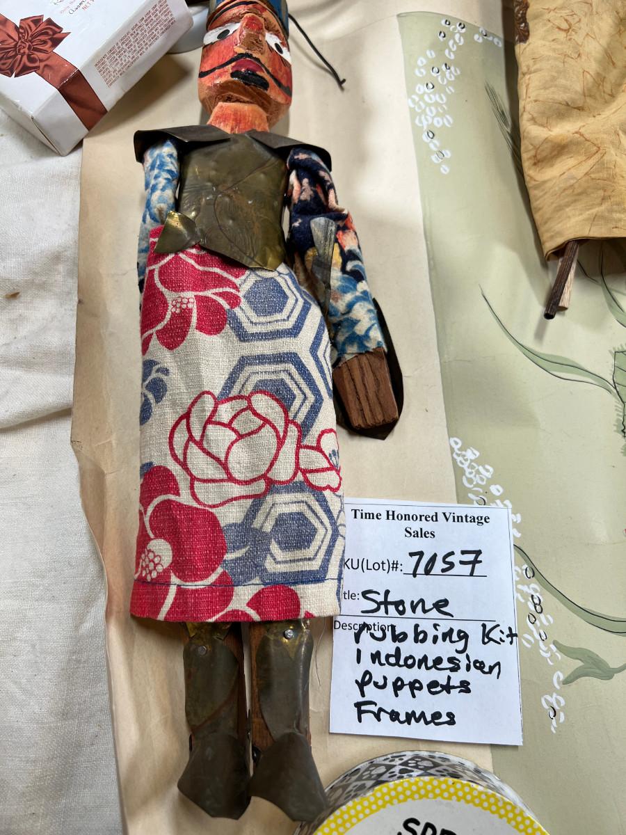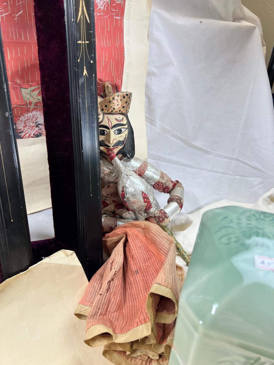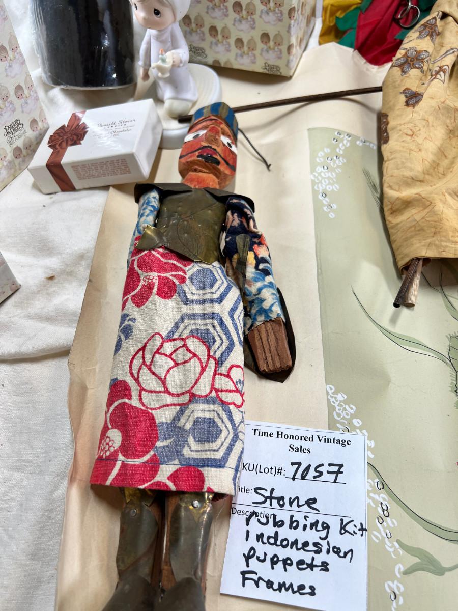 Asian screen frames with velvet stacking porcelain box. Stone rubbing kit in roll. Precious Moments in boxes , 2 original wall paper design watercolors,with wear, Indonesian puppets, Kite, roll of rice paper. Stone rubbing kit.