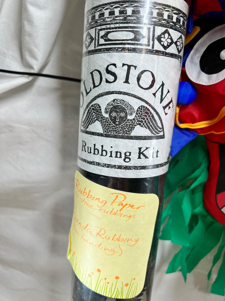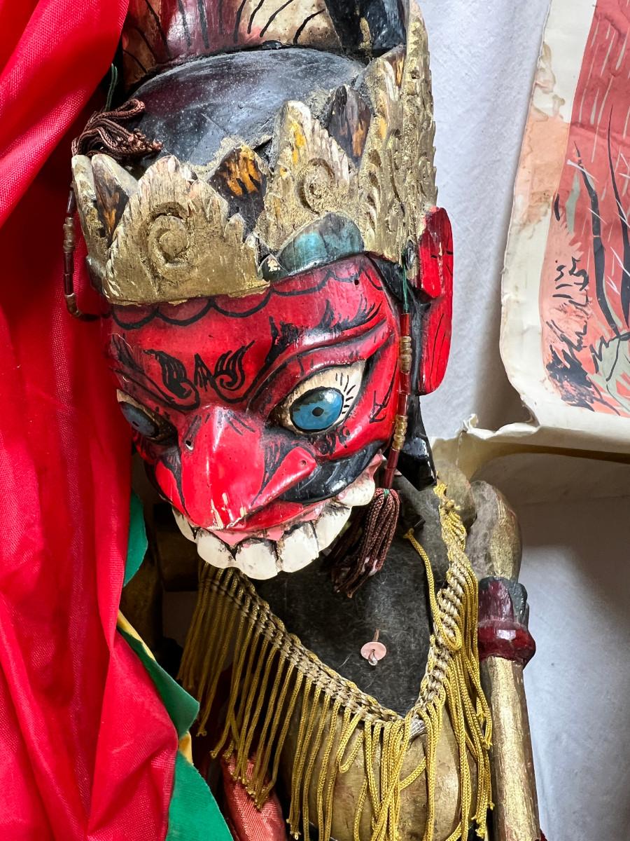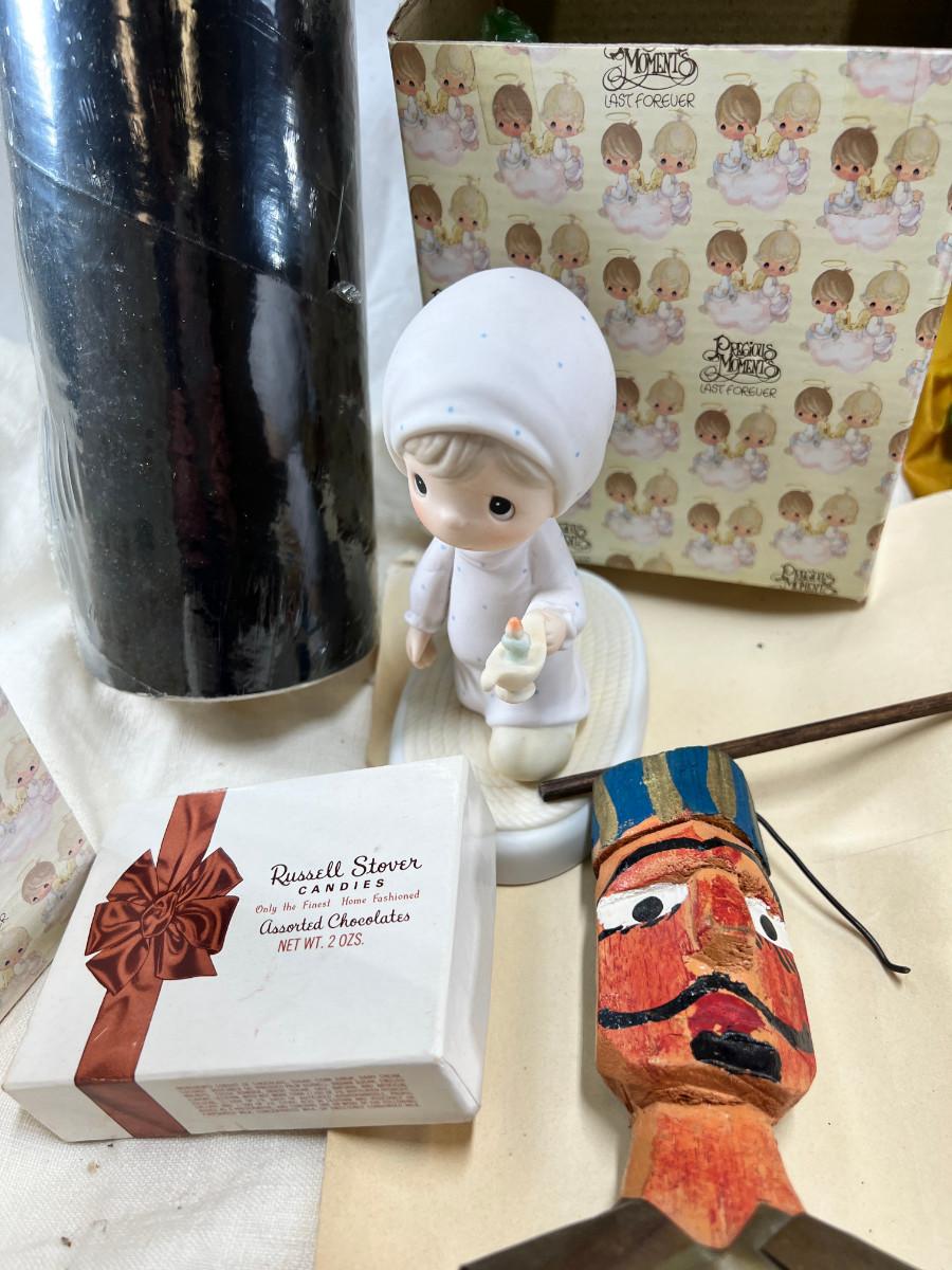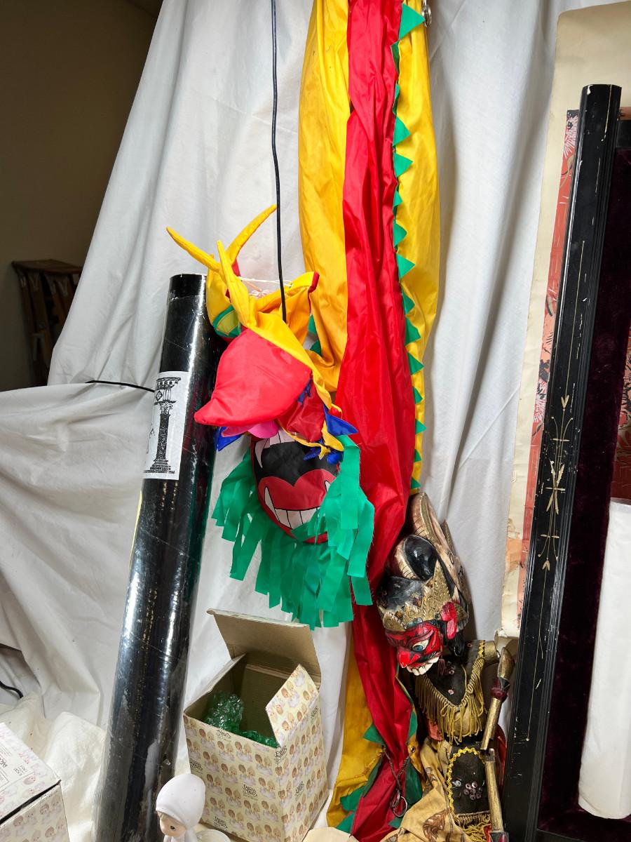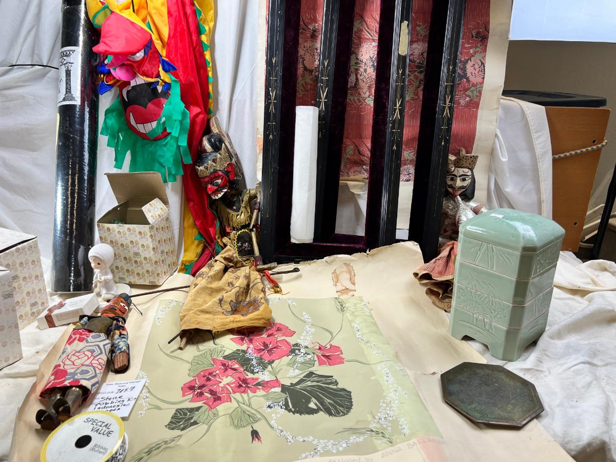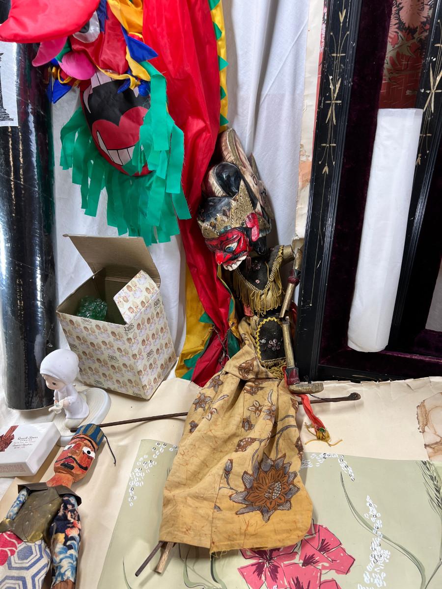 Asian screen frames with velvet stacking porcelain box. Stone rubbing kit in roll. Precious Moments in boxes , 2 original wall paper design watercolors,with wear, Indonesian puppets, Kite, roll of rice paper. Stone rubbing kit.