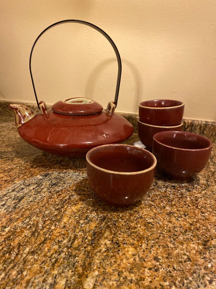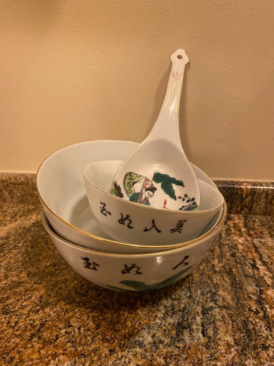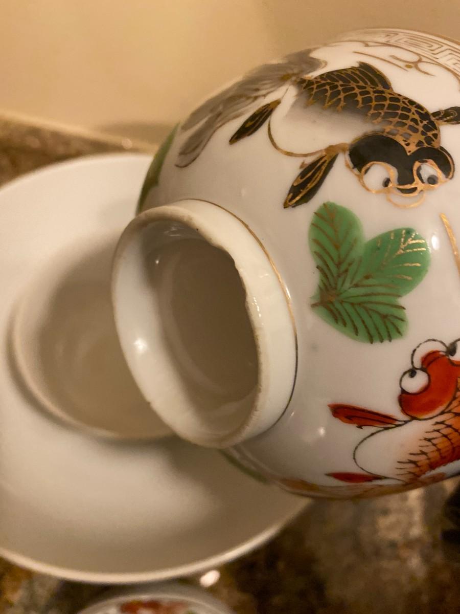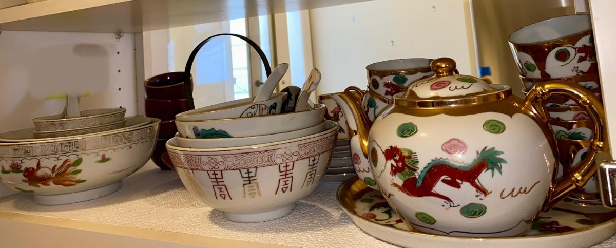 Gilded Asian tea set with round platter (approximately 9” diameter), teapot (5.5” high), creamer with lid, 10 teacups and 6 saucers. Along with Asian motif soup bowls and spoons and a Japanese tea pot with 4 cups