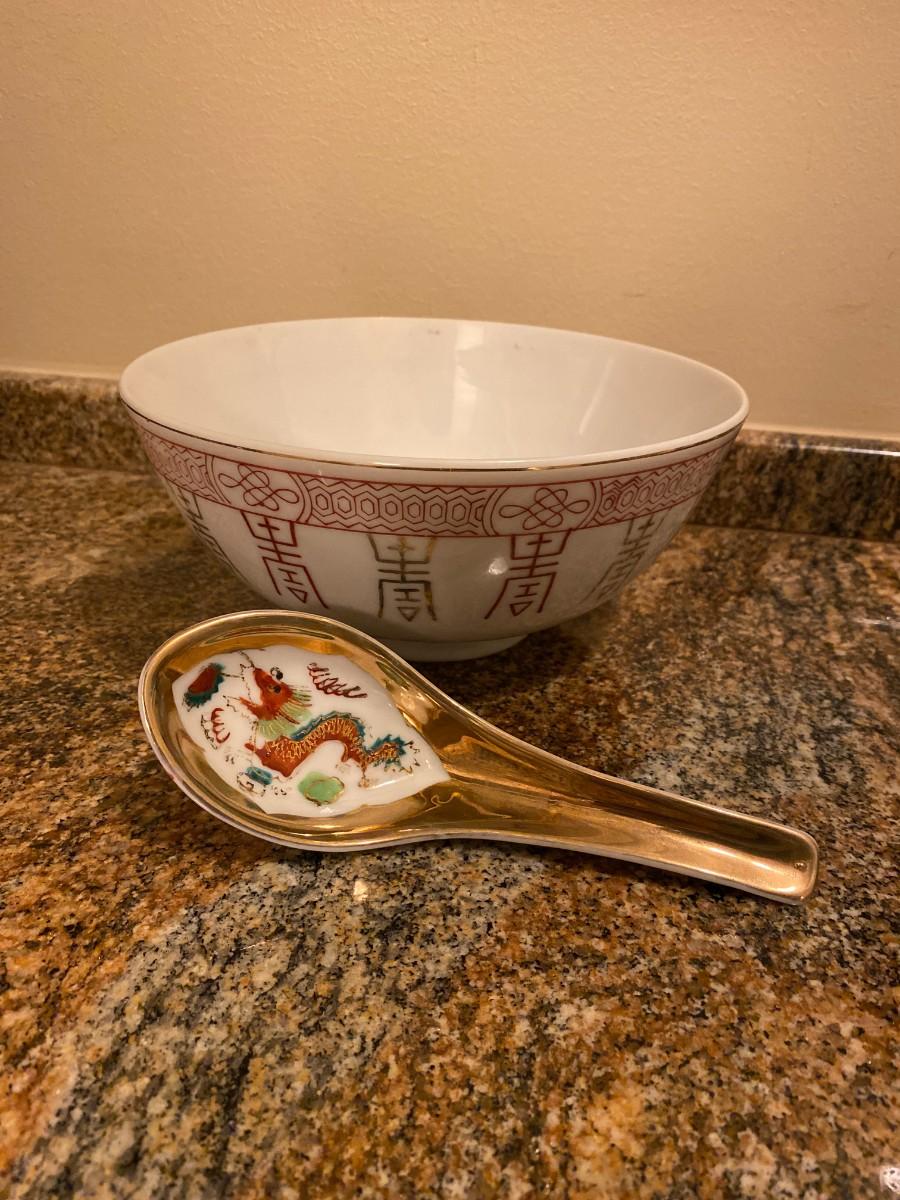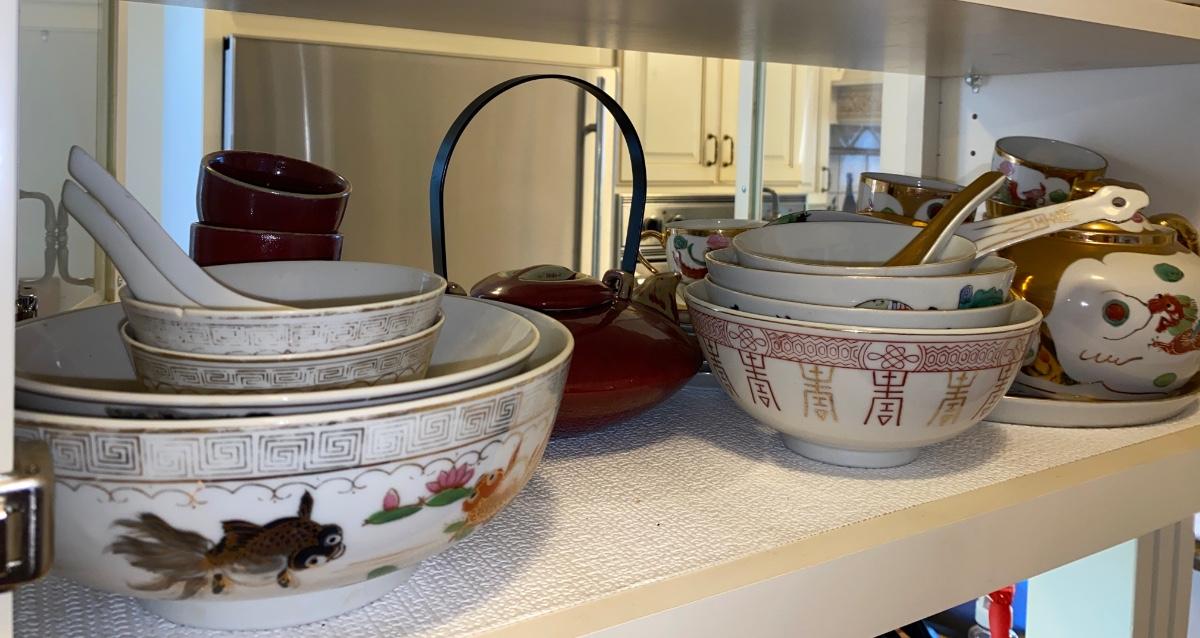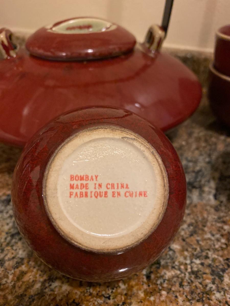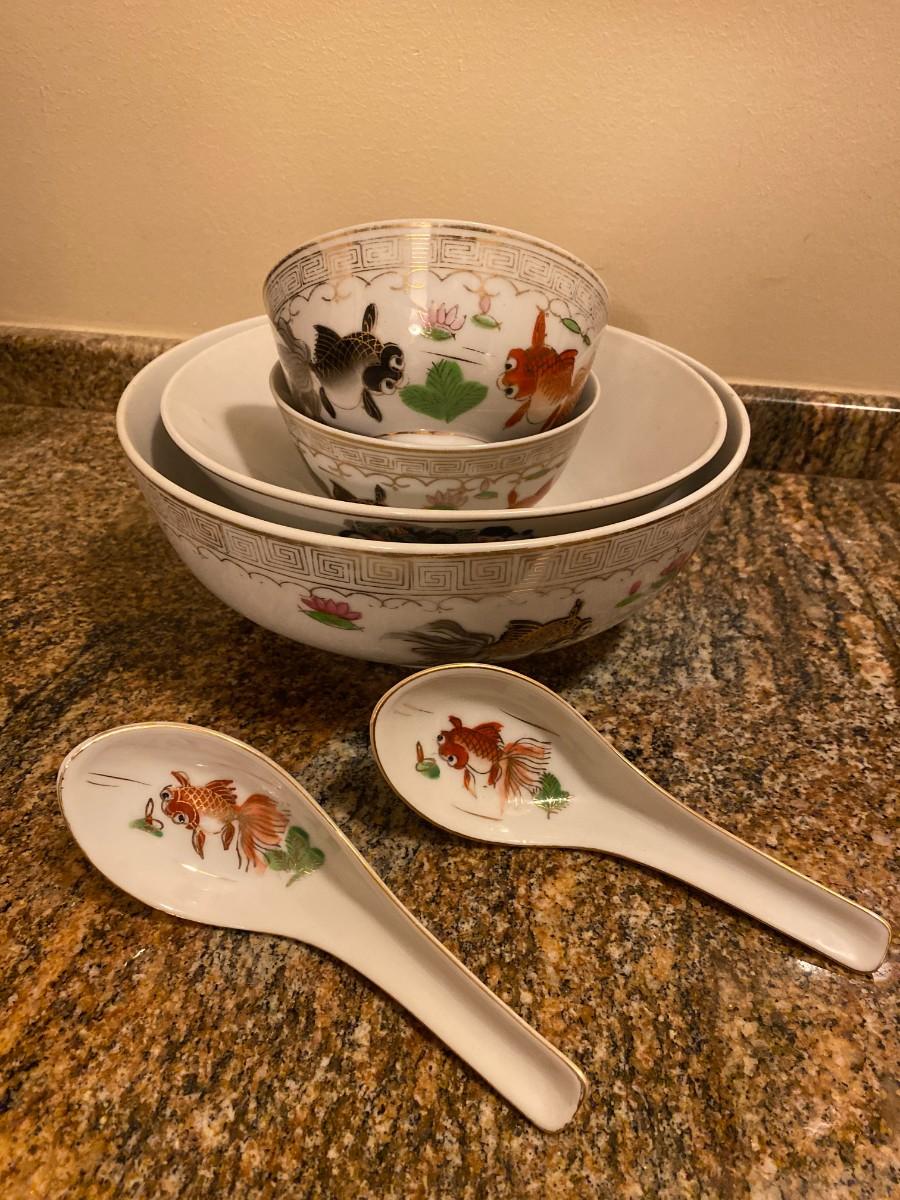 Gilded Asian tea set with round platter (approximately 9” diameter), teapot (5.5” high), creamer with lid, 10 teacups and 6 saucers. Along with Asian motif soup bowls and spoons and a Japanese tea pot with 4 cups