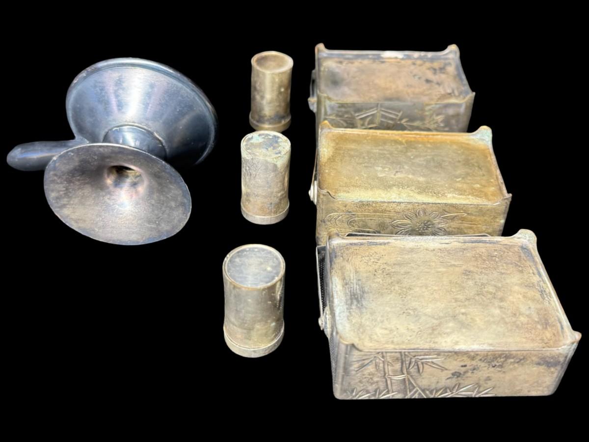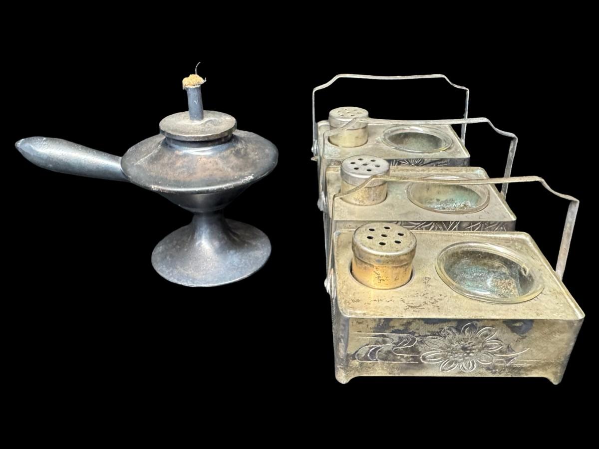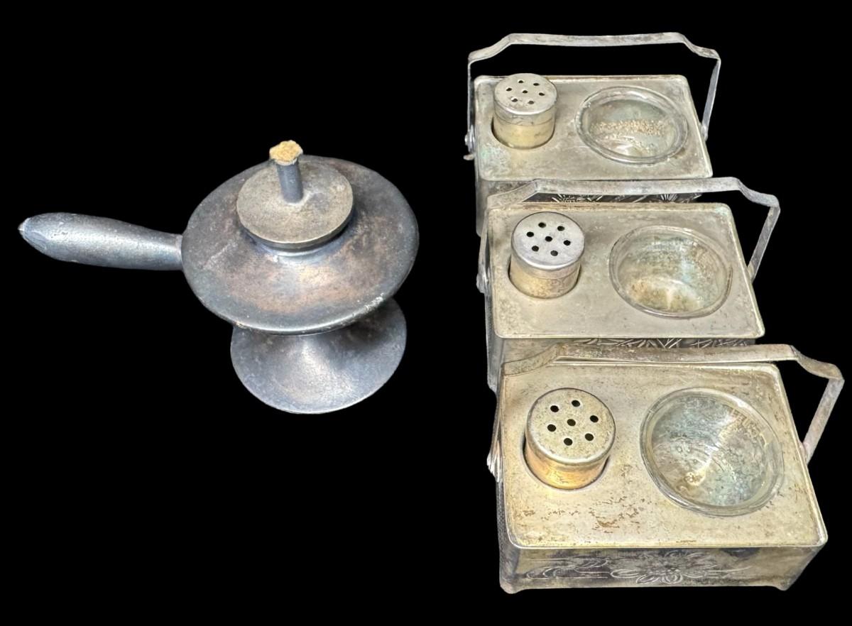 Includes three salt and pepper service pieces, and a small oil lamp. The salt and pepper pieces are chased with an Asian motif. Total of four pieces. [KD]