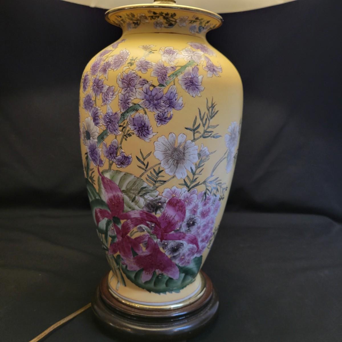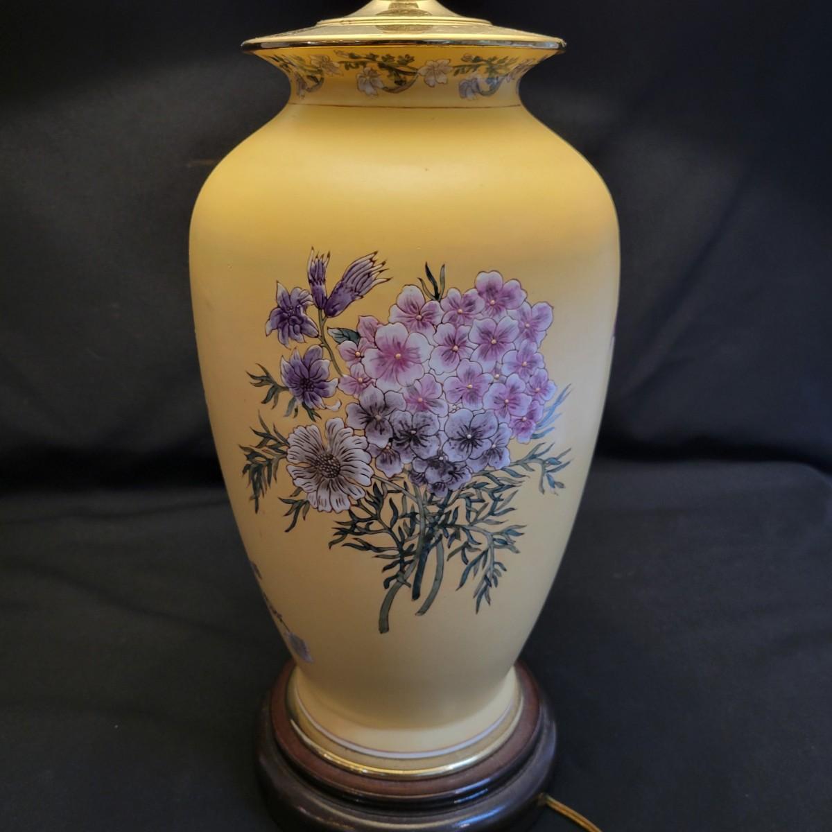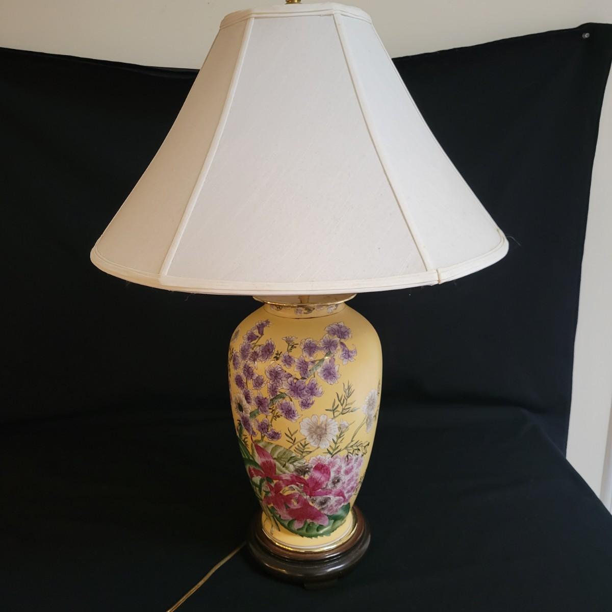 An Asian inspired ceramic lamp that has a yellow background with a floral design. It has a wooden base with gold accents. It also has a three way light switch and measures approximately 8"D x 31"H not including the shade. Local pickup only