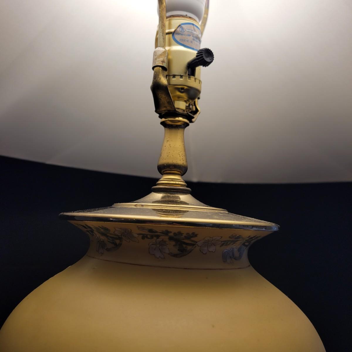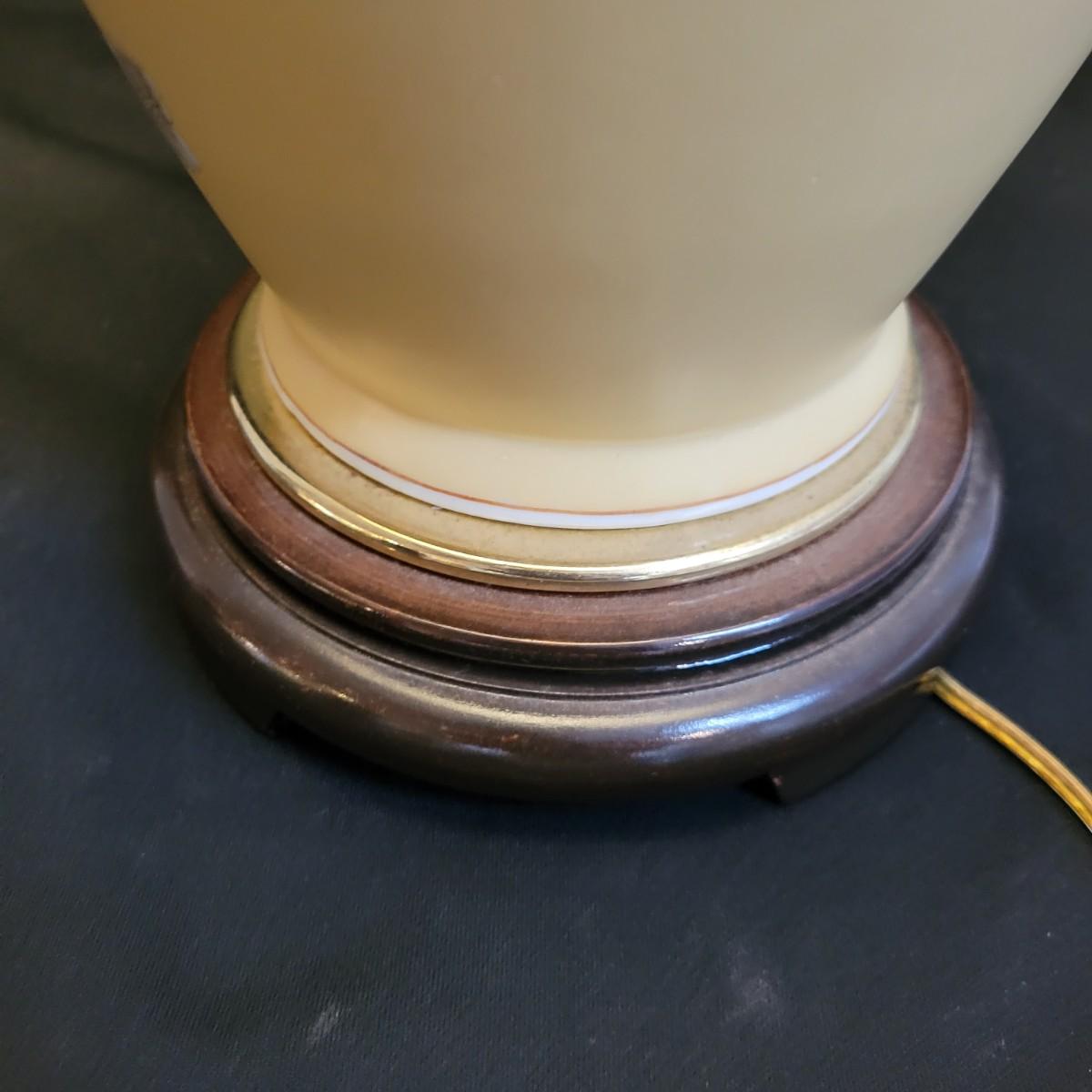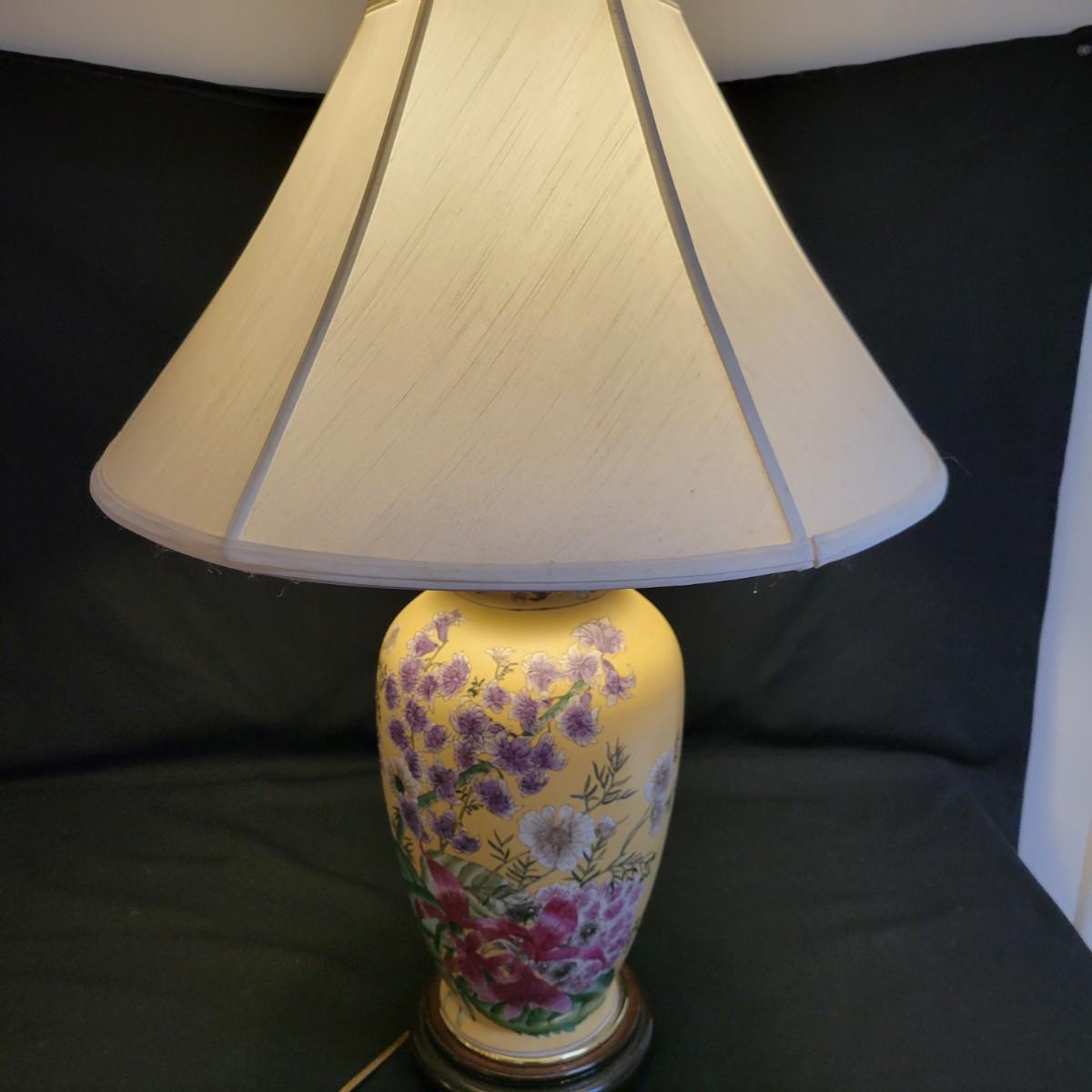 An Asian inspired ceramic lamp that has a yellow background with a floral design. It has a wooden base with gold accents. It also has a three way light switch and measures approximately 8"D x 31"H not including the shade. Local pickup only