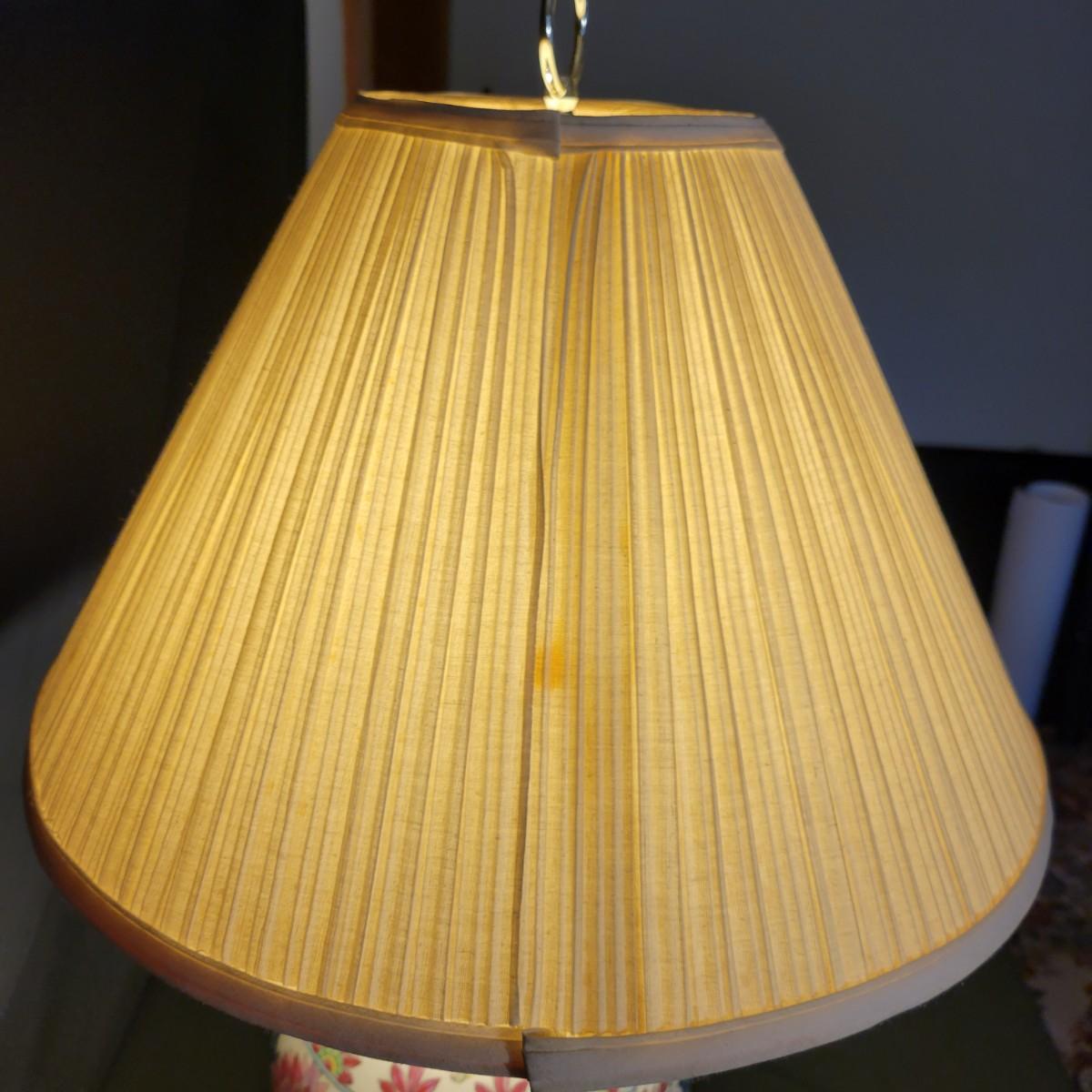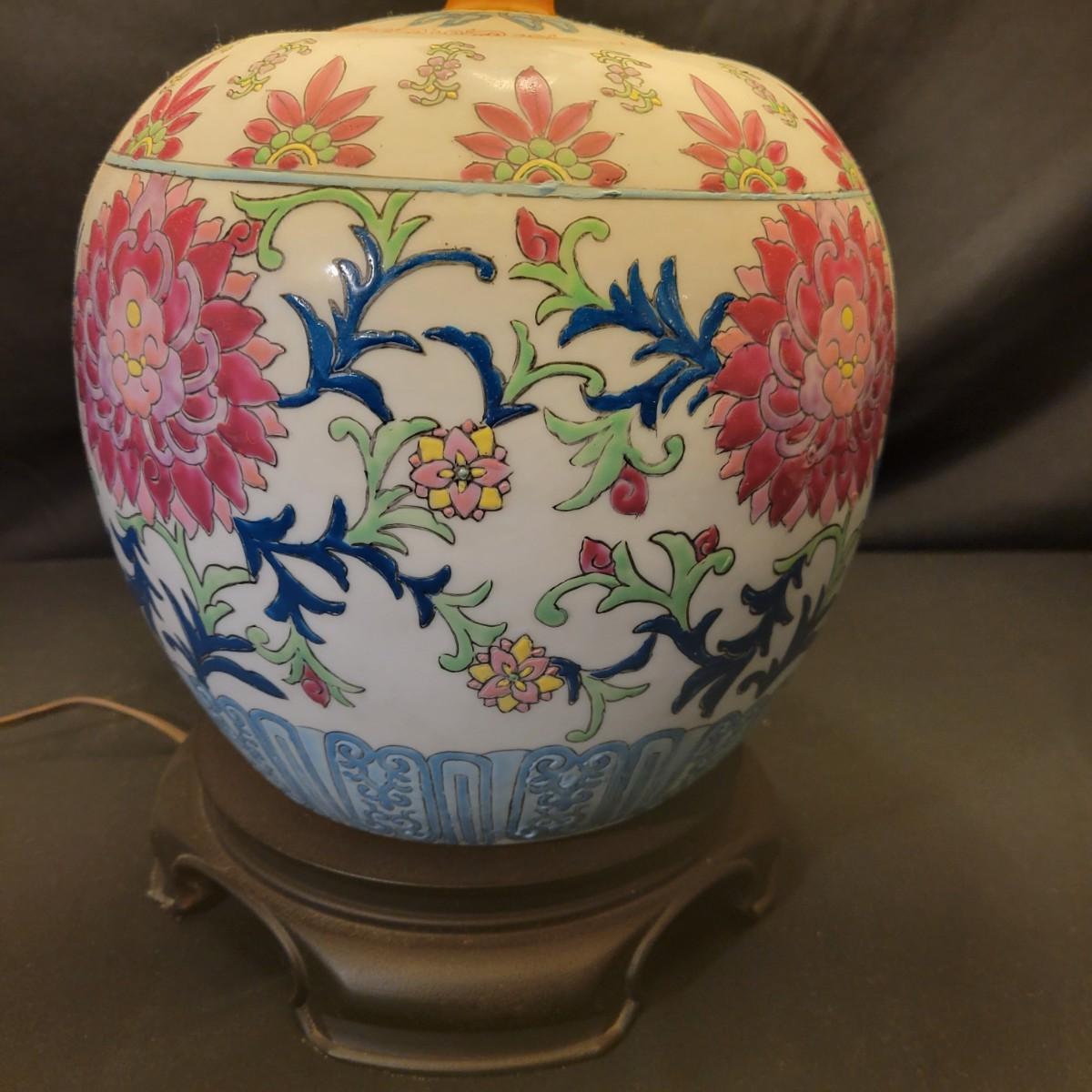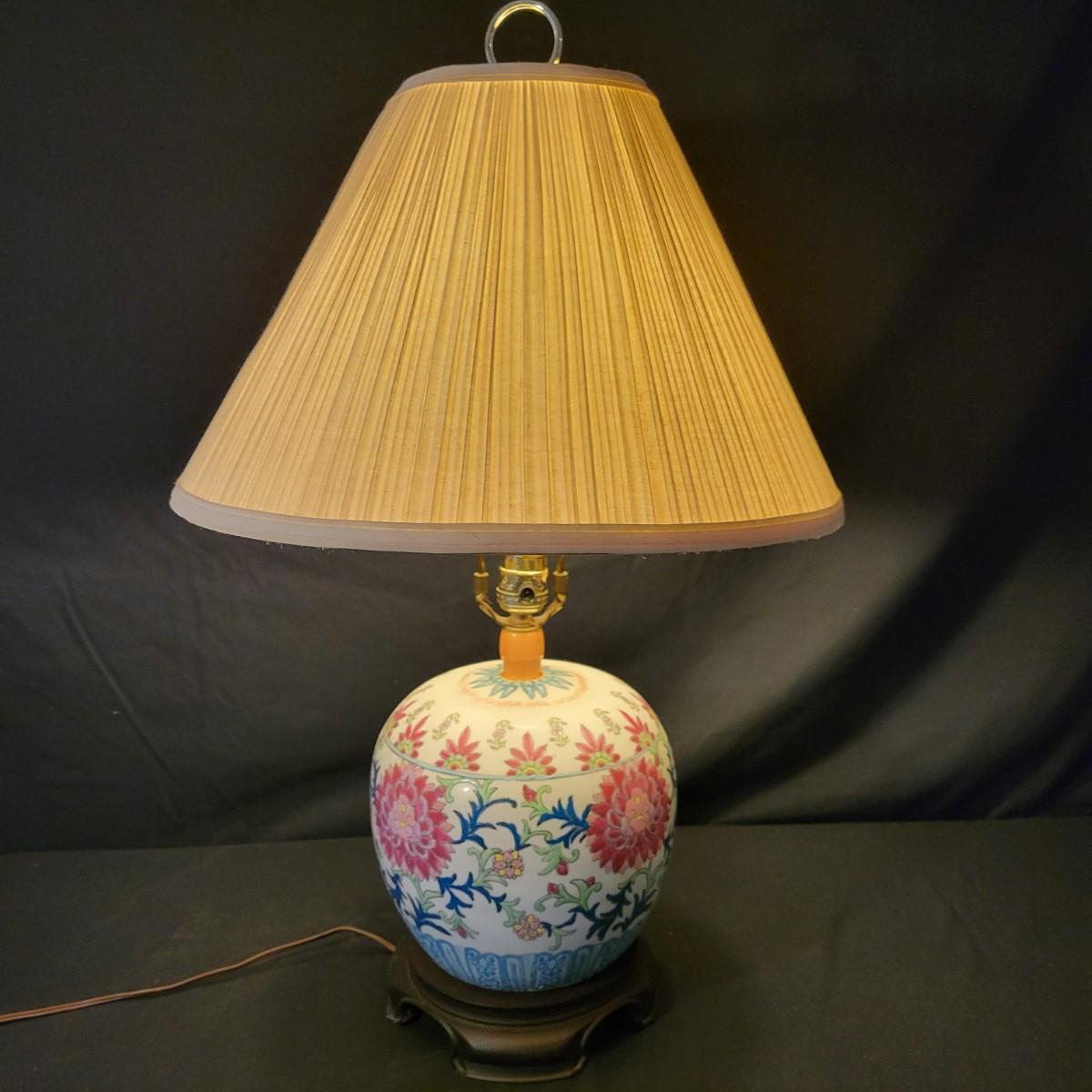 A ceramic lamp that appears to be hand painted, in good condition with no notable damage. This lamp features a floral pattern that has an Asian flare. The base of the lamp is plastic and includes the shade. Measures approximately 9" x 28". Local pickup only