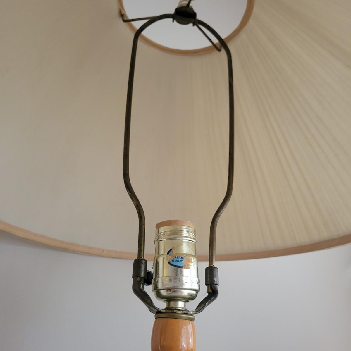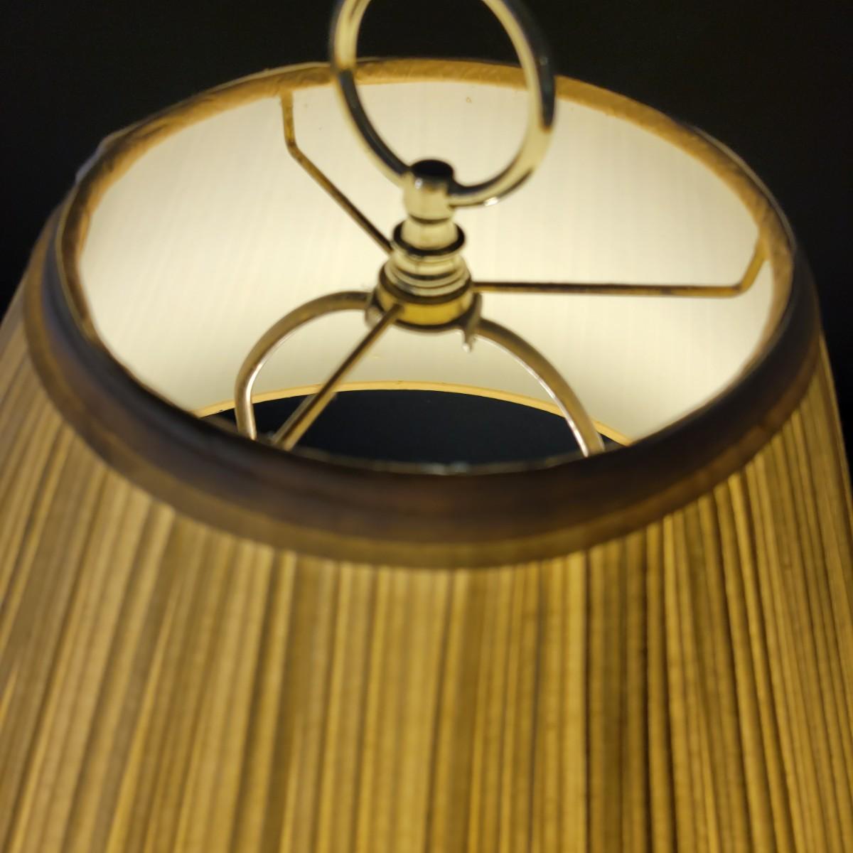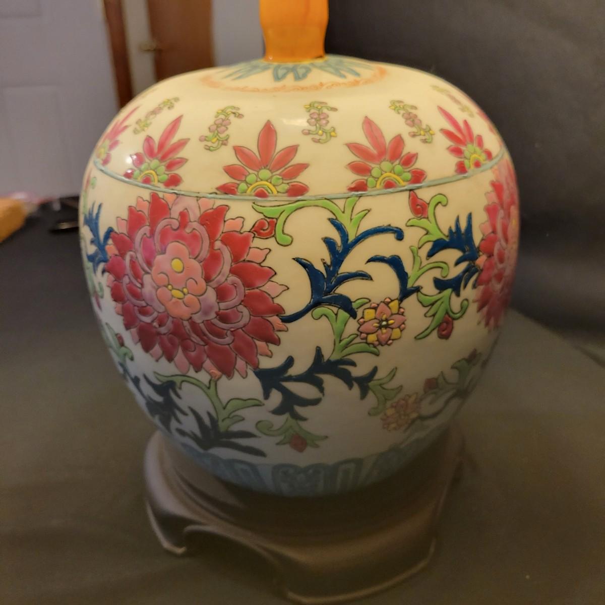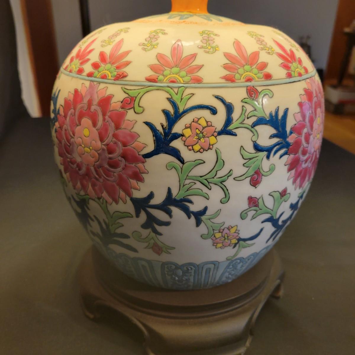 A ceramic lamp that appears to be hand painted, in good condition with no notable damage. This lamp features a floral pattern that has an Asian flare. The base of the lamp is plastic and includes the shade. Measures approximately 9" x 28". Local pickup only