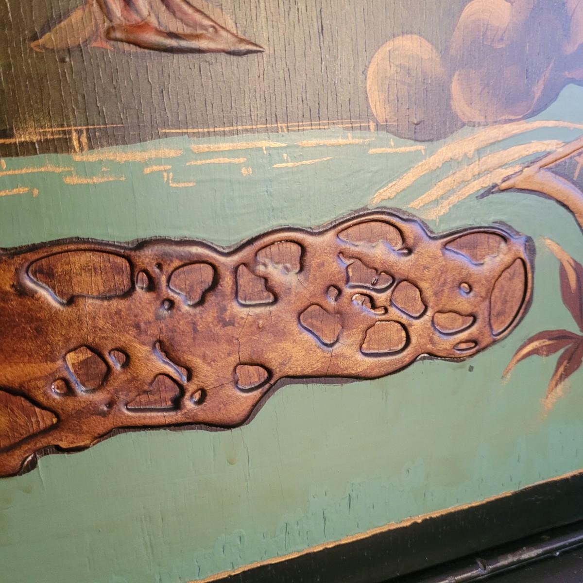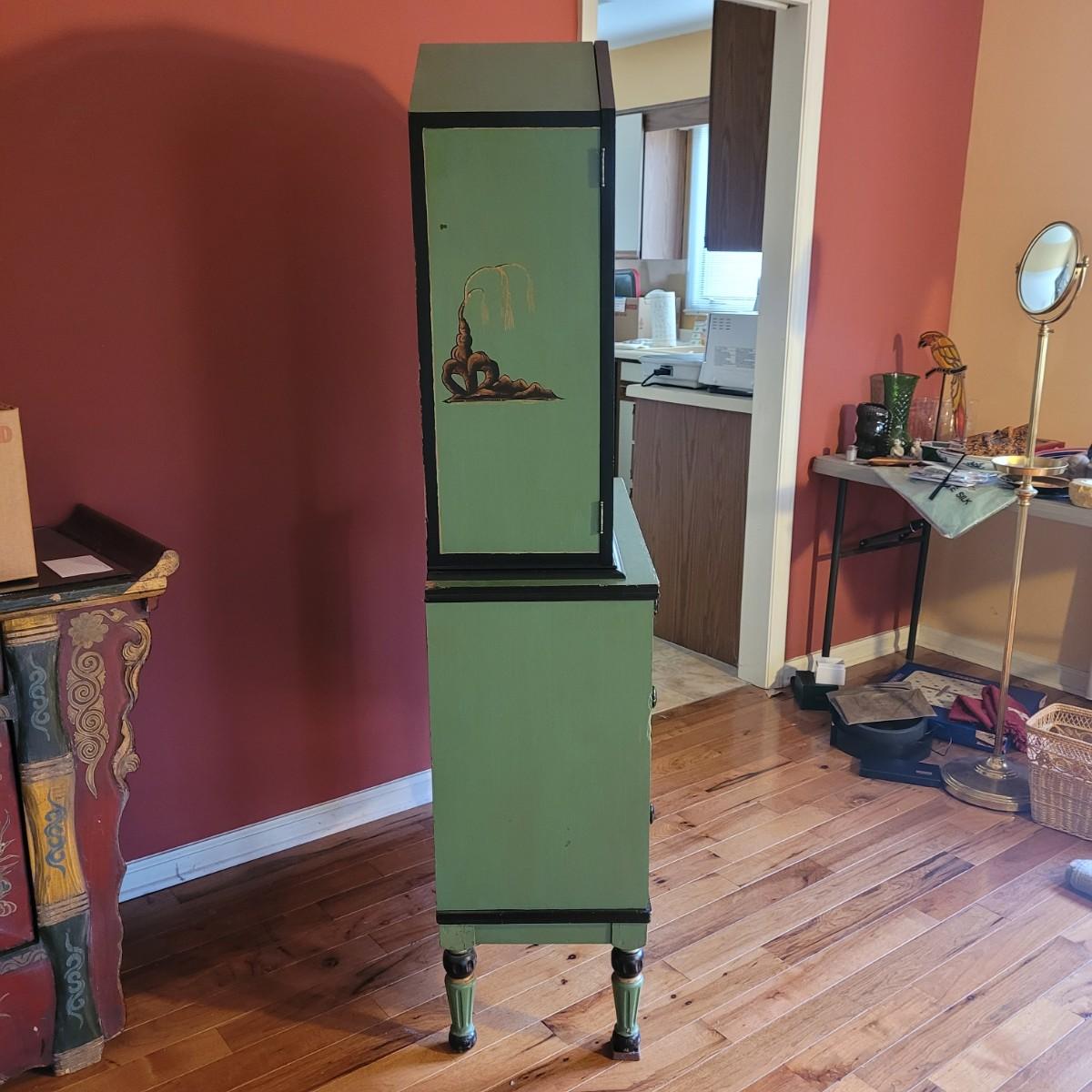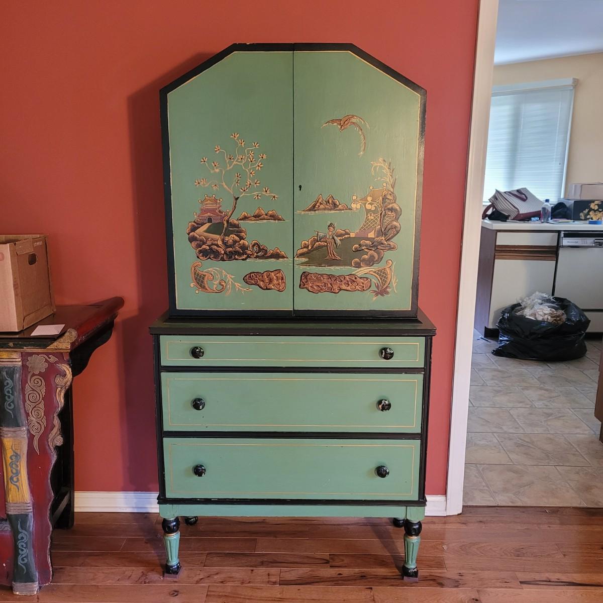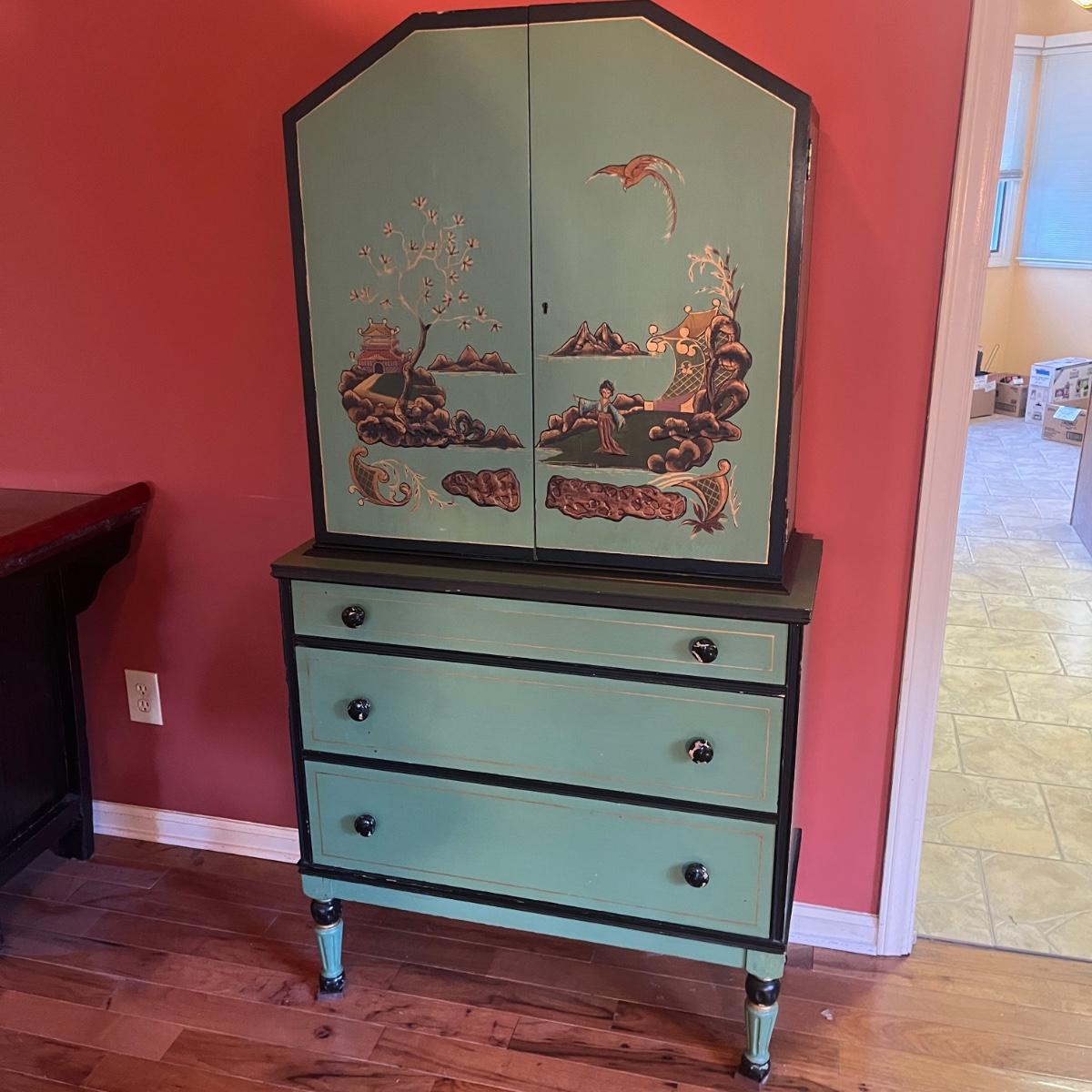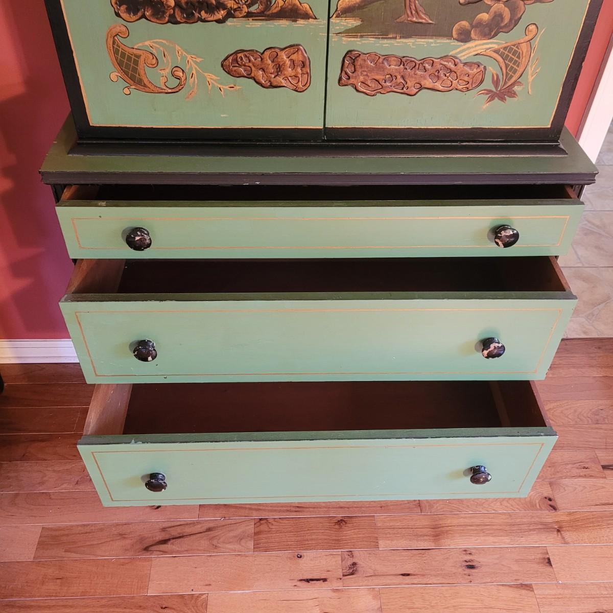 This engraved and hand painted cabinet depicts an Asian-style nature scene with inlaid, carved wooden decor. Drawers have dovetailed construction. No key is included. Note that two front legs are on risers to balance out furniture. Some chips and scuffs throughout (see photos). Measures approximately 33.5” x 14” x 64.5”H. Label states that it is from Al Carlson Mfg. Co. Local pickup only. Winning bidder must bring assistance to help move and load this item due to its weight and size. It is located on the main floor and will not need to be moved up or down any stairs.